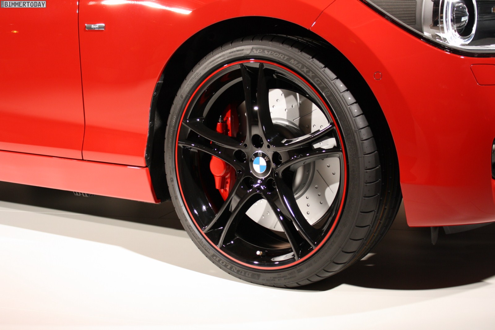 Die schwarz lackierten Felgen verfügen über einen Streifen in Karmesinrot, was erwartungsgemäß gut mit der Fahrzeuglackierung in selbiger Farbe harmoniert und auch deshalb stimmig wirkt, weil die Farbe Schwarz auch an Außenspiegeln, Nieren und diversen anderen Stellen Akzente in umgekehrter Richtung setzt. Die Bremsanlage stammt von BMW Performance und natürlich haben wir uns auch über die seltsame Optik unterhalten – Ergebnis: Die Bremse wurde lackiert, um Flugrost zu vermeiden. Selbstverständlich wird die echte Bremsscheibe nicht silbern sein, sondern den gewohnten metallischen Glanz aufweisen.
