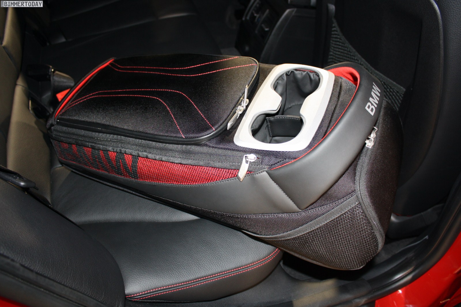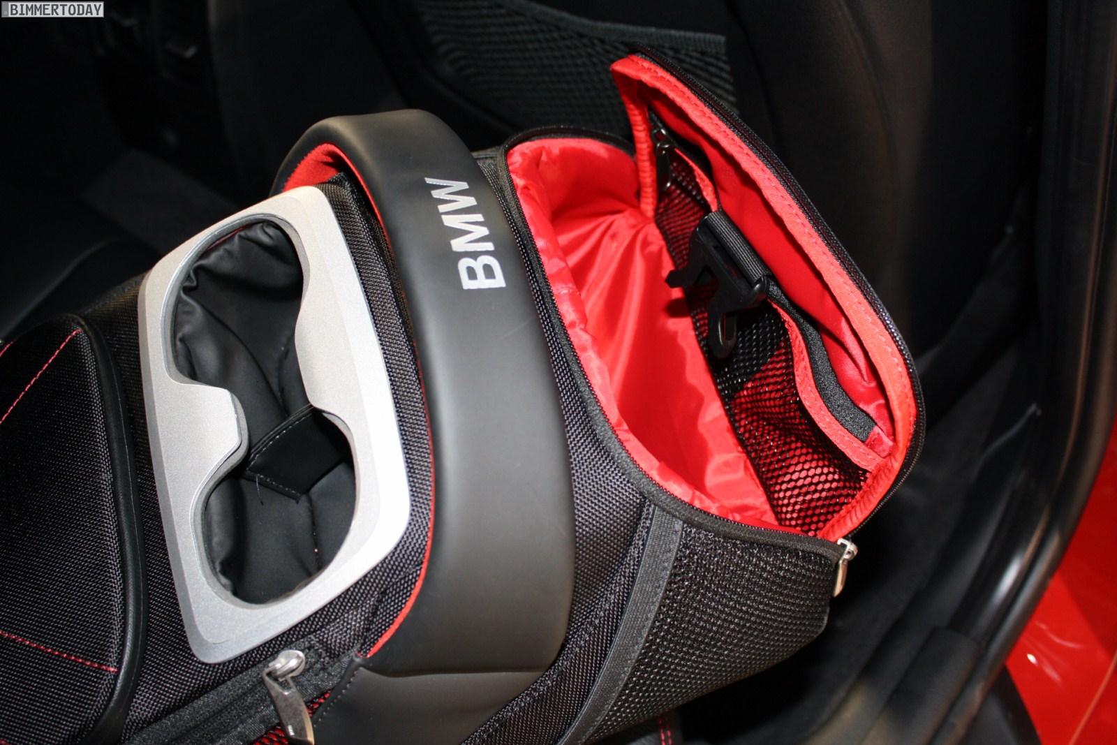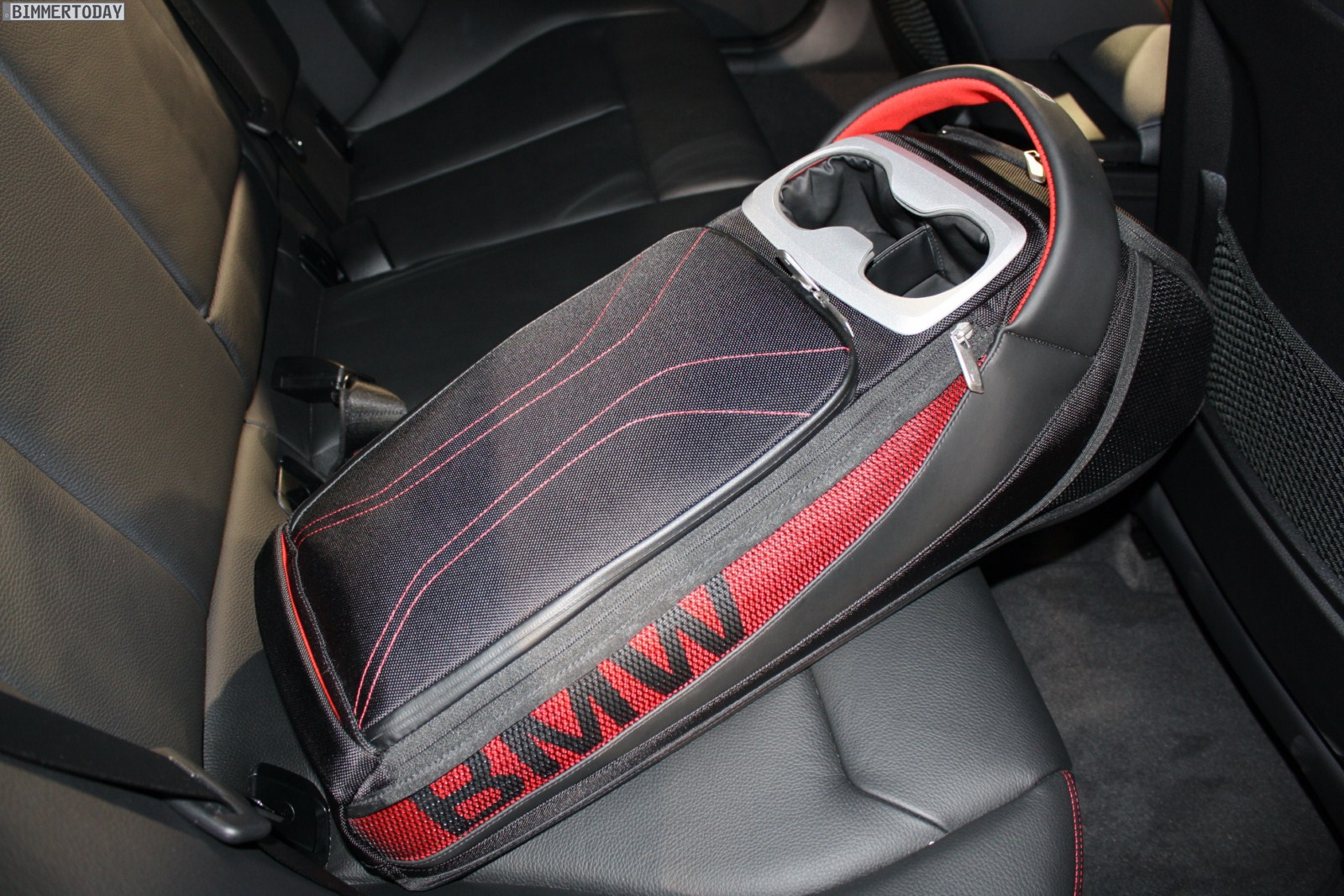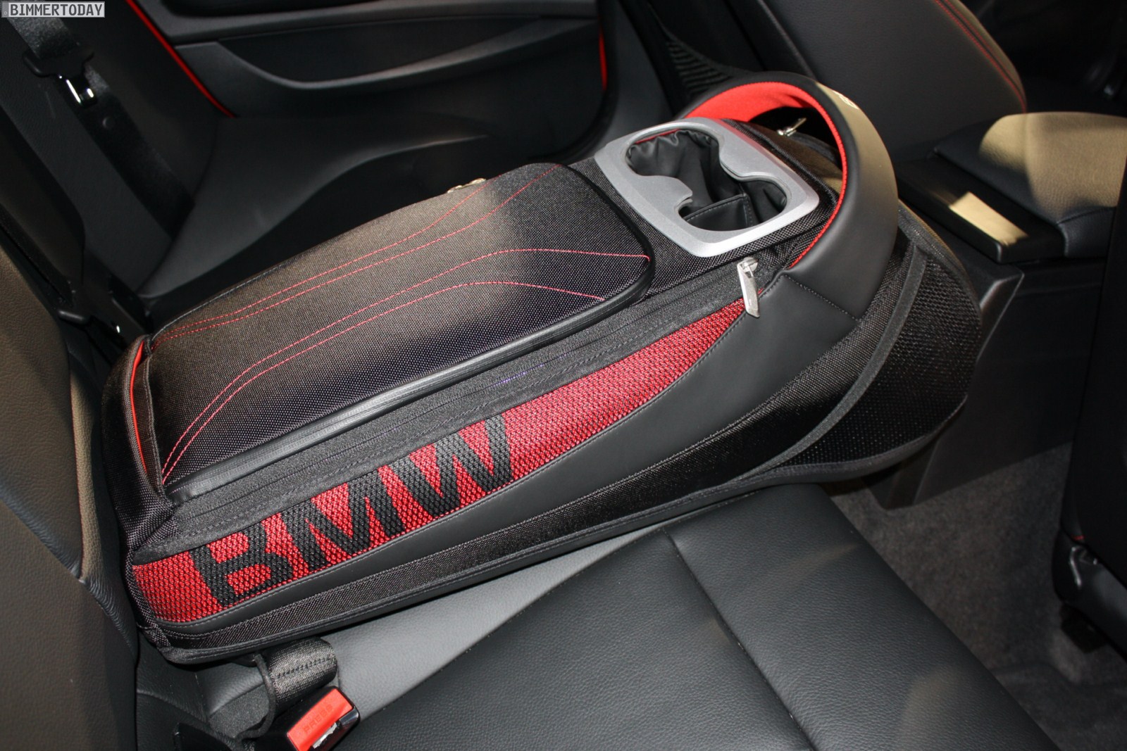 Im Fond des Fünftürers, bei dem es sich abgesehen von den Zubehör-Optionen um einen 120d mit achststufiger Sportautomatik und Sport Line handelt, findet sich eine interessante Alternative zum klassischen Cupholder. Die Tasche bietet in etwa so viel Platz wie ein Rucksack und lässt sich bei Bedarf mit an den Strand nehmen, während der Fahrt erfüllt sie hingegen ihren Job als Becherhalter.