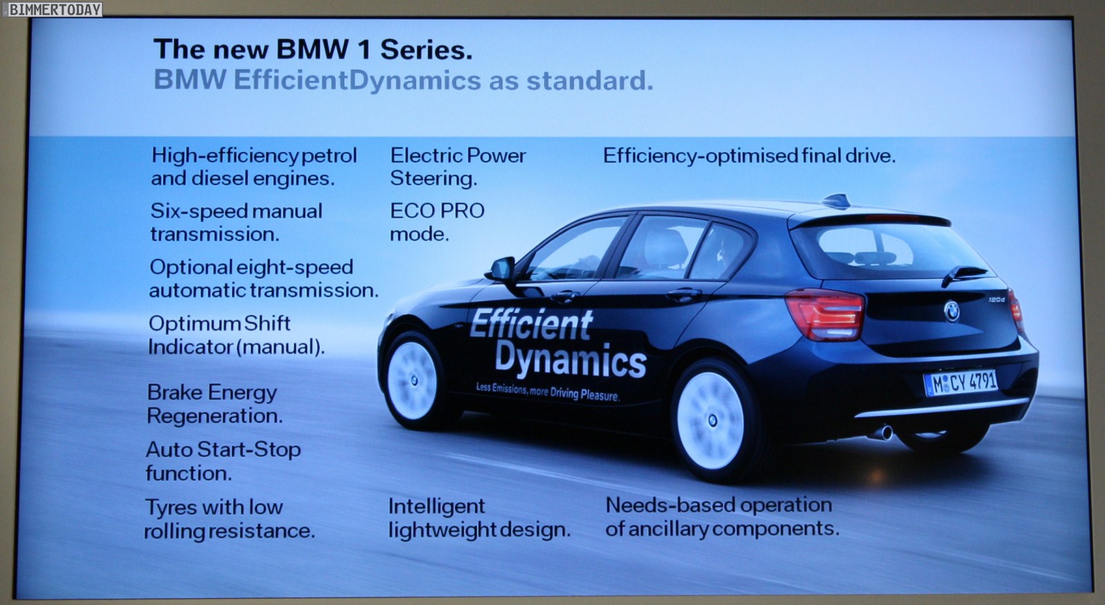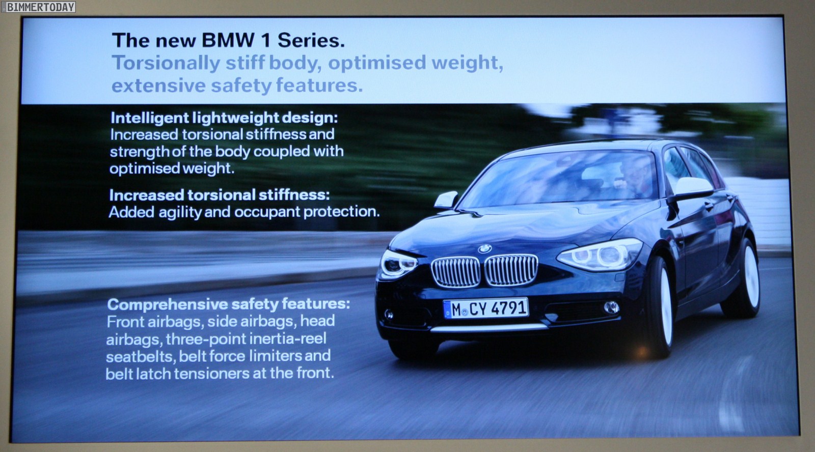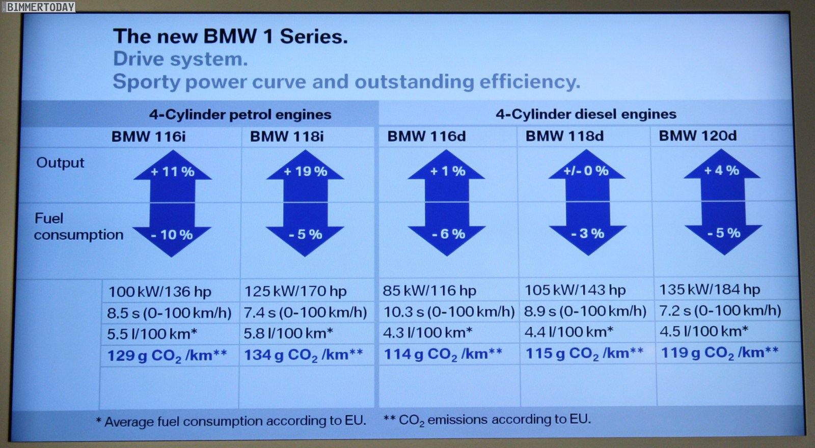 Auf der Pressekonferenz zum Launch des neuen BMW 1er F20 in Berlin präsentierte BMW einige interessante Grafiken und Übersichten, die uns die wichtigsten Unterschiede der 1er-Reihe im Vergleich zum Vorgänger sowie die relevanten technischen Daten übersichtlich zusammenfassen. In unserer Bilderserie seht ihr die entsprechenden Folien, die zwar leider in Englisch beschriftet sind, aber dennoch verständlich sein sollten.