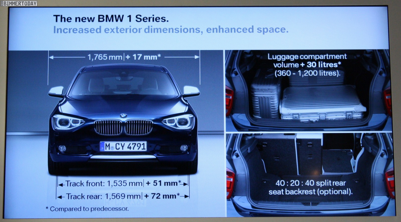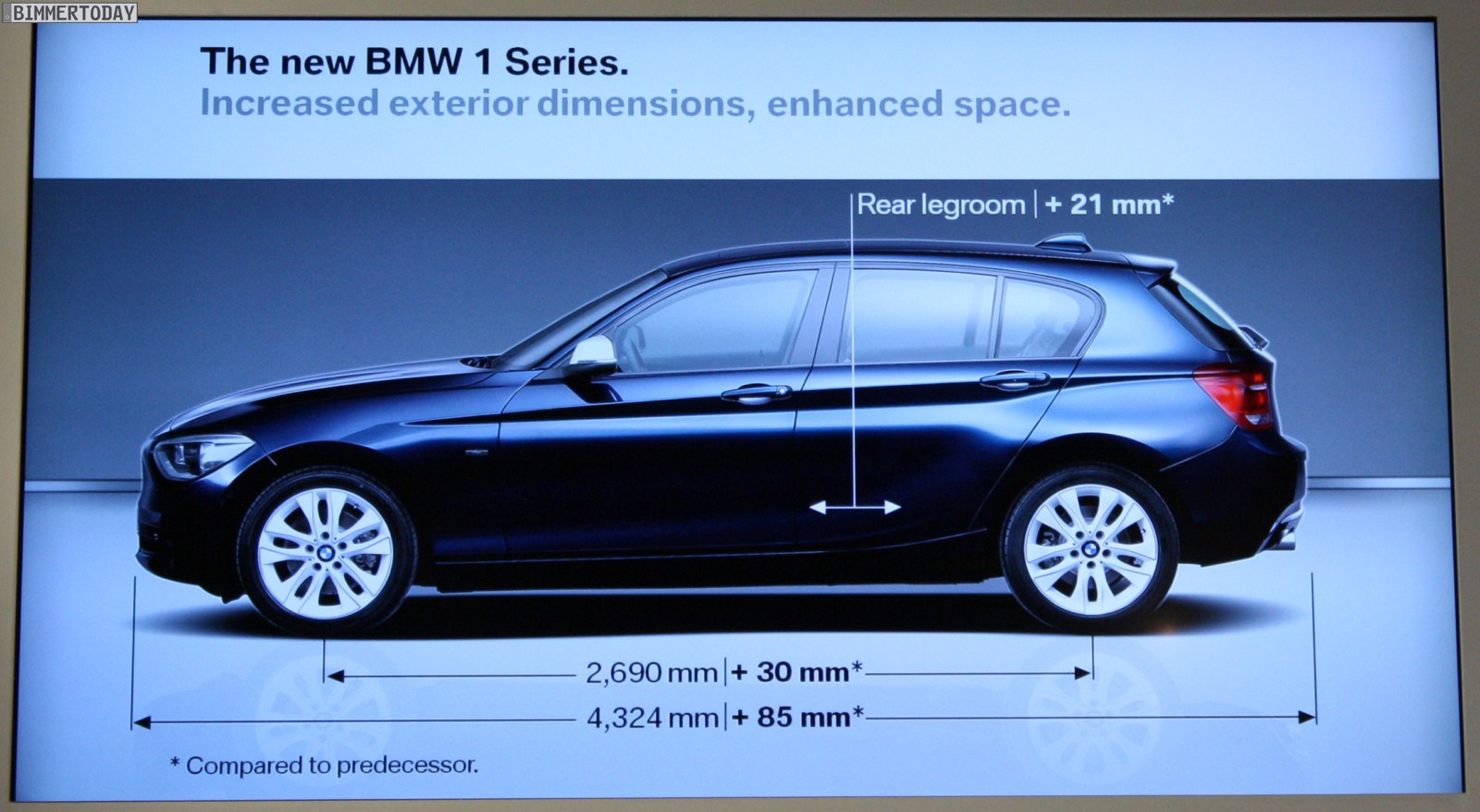Gegenüber dem Vorgänger ist der BMW 1er um 8,5 Zentimeter gewachsen, was unter anderem den Passagieren im Fond zu mehr Beinfreiheit und einem erheblich bequemeren Einstieg verhilft. In der Breite legte der 1er um 1,7 Zentimeter zu, die Spurweite wurde allerdings erheblich um 5,1 Zentimeter an der Front und sogar 7,2 Zentimeter an der angetriebenen Hinterachse verbreitert.