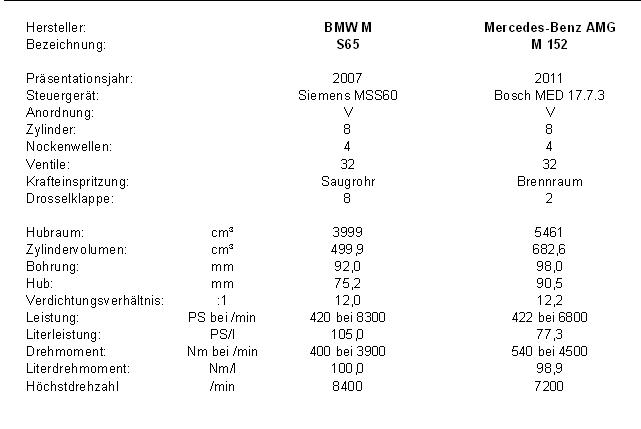 Aufgrund der schieren Hubraumgröße war in einem AMG nie ein Mangel an Drehmoment feststellbar, allerdings fehlt aufgrund der verhältnismäßig großen und dementsprechend schweren Kolben sowie dem Fehlen von Einzeldrosselklappen und Fächerkrümmer auch das letzte Quäntchen Drehfreude. Bei maximal 7200/min muss auch der neueste Saugmotor von AMG die Segel streichen, der S65 im M3 setzt hier hingegen noch einmal zum Endspurt an und lässt die Drehzahlnadel bis auf 8400 U/min peitschen. Die beiden Philosophien könnten nicht unterschiedlicher sein.