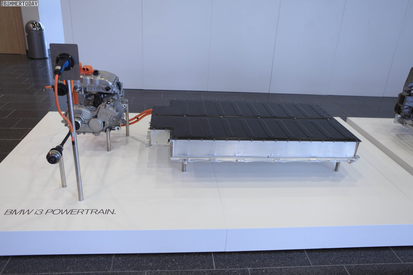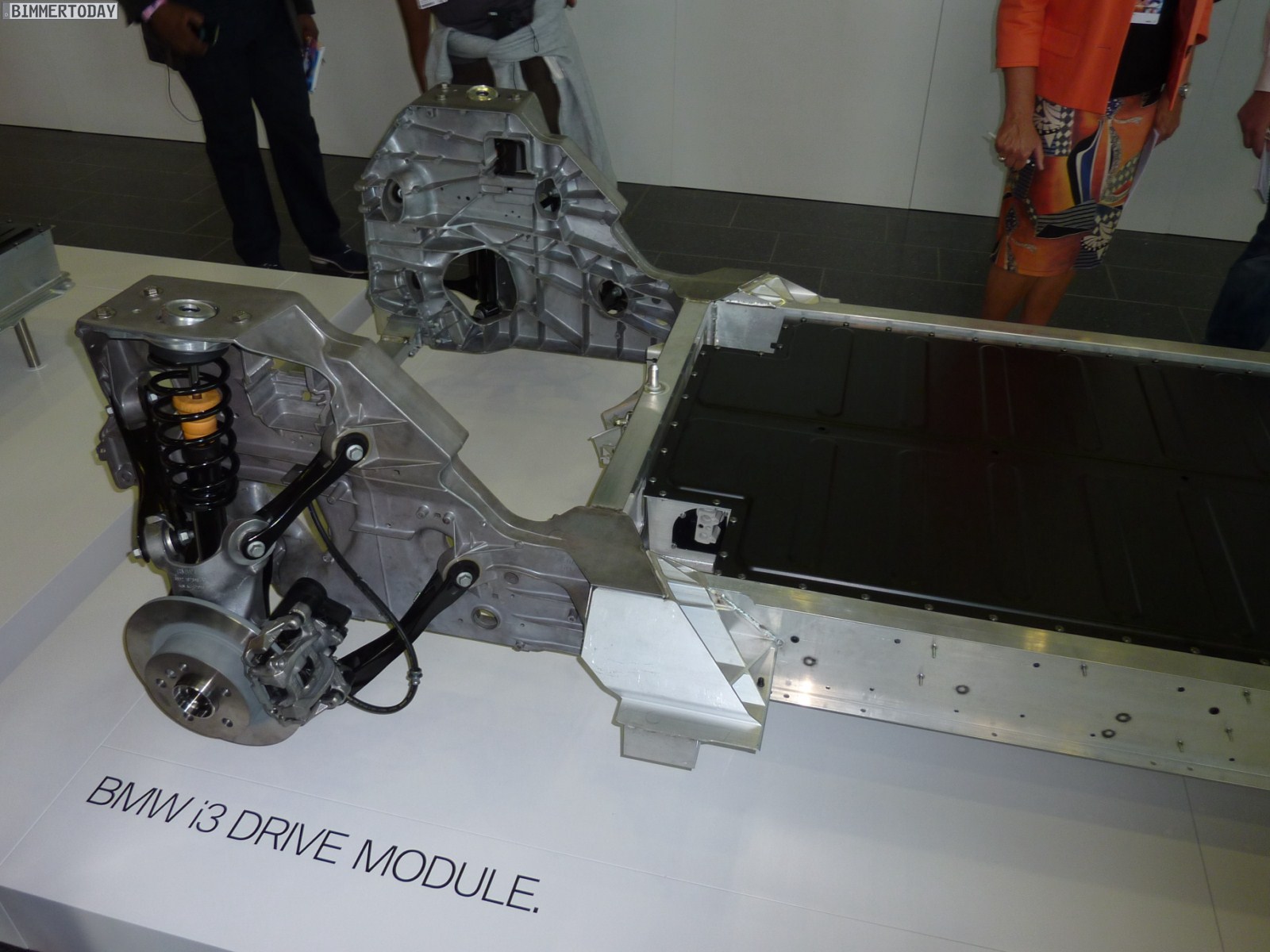 Mit Hilfe einiger Exponate hat BMW am vergangenen Freitag auch einen Blick unters Kleid von BMW i3 und BMW i8 erlaubt und natürlich haben wir diese Gelegenheit für einige Fotos genutzt. Zu sehen ist unter anderem der Antriebsstrang des BMW i3, der sich durch die große Batterie im Fahrzeugboden und den kleinen Elektromotor samt Leistungselektronik im Heck auszeichnet. Die Batterie ist so niedrig wie möglich und genau zwischen den Achsen angeordnet, was bei einem Conversion Vehicle unmöglich gewesen wäre und einen der Vorteile des Purpose Built Design darstellt.