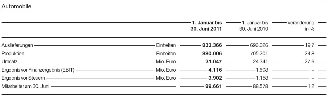 Wir streben nachhaltig und damit über das Jahr 2012 hinaus im Segment Automobile eine EBIT-Marge von 8 bis 10% sowie eine Rendite auf das eingesetzte Kapital von mehr als 26% an. Die Bandbreite könnte in Abhängigkeit von politischen und wirtschaftlichen Rahmenbedingungen zukünftig jedoch auch über- oder unterschritten werden.”