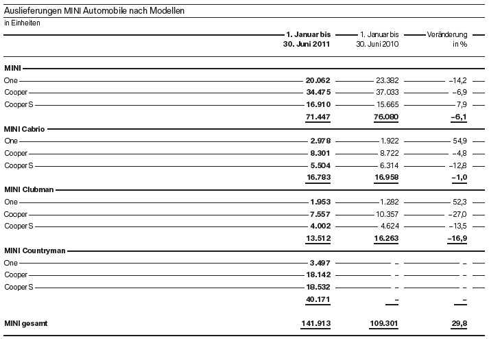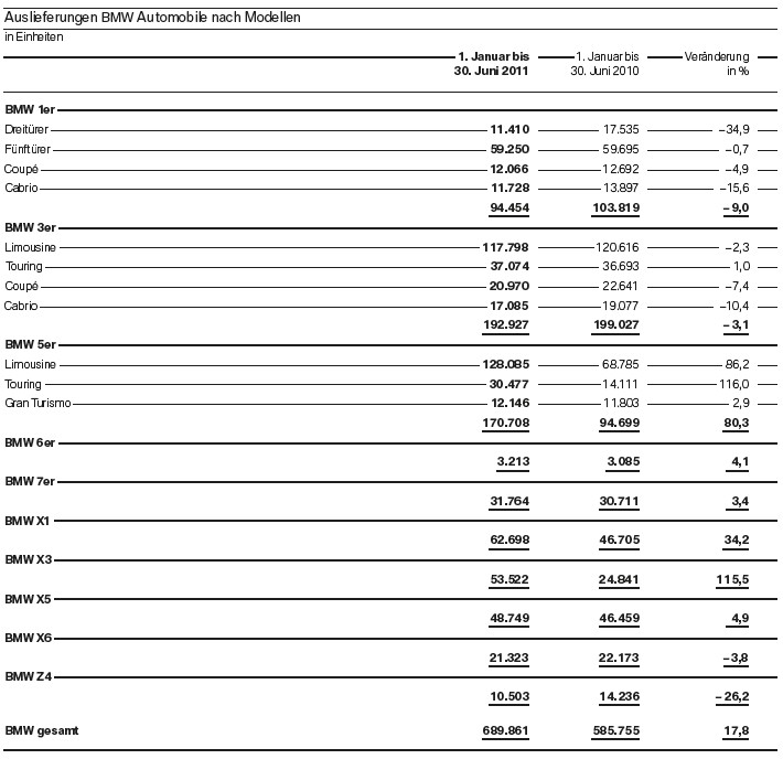 Wie gewohnt liefert BMW im Rahmen des Quartalsberichts auch eine Übersicht zum Absatz, die nach Modellreihen aufgeschlüsselt ist. Besonders positiv fallen hier weiterhin der X1 (+34,2%), der X3 F25 (+115,5%) und die 5er-Reihe (+80,3%) auf. Leicht im Minus liegen lediglich der X6 (-3,8%), der 1er (-9,0%) und der 3er (-3,1%), wobei die beiden letztgenannten Baureihen unmittelbar vor ihrer Ablösung stehen. Stärker als erwartet fällt der Rückgang beim Z4 aus, von dem nur 10.503 Einheiten und somit 26,2 Prozent weniger als im ersten Halbjahr 2010 abgesetzt werden konnten.