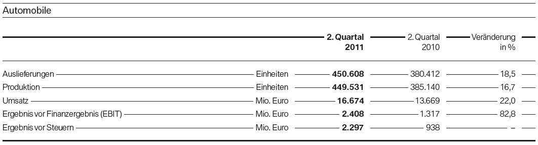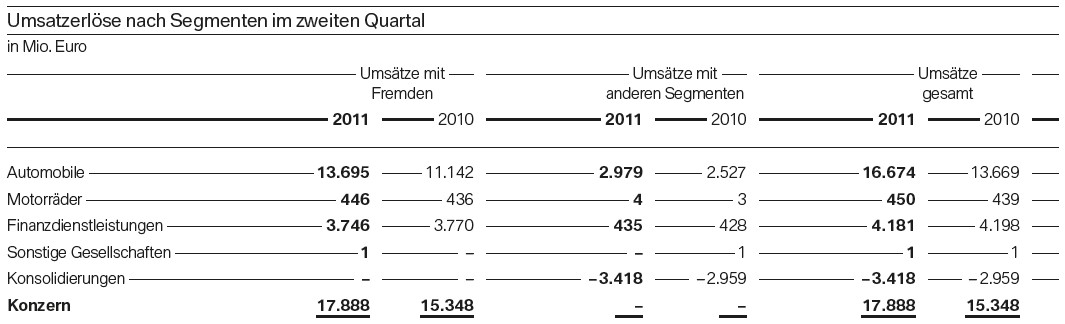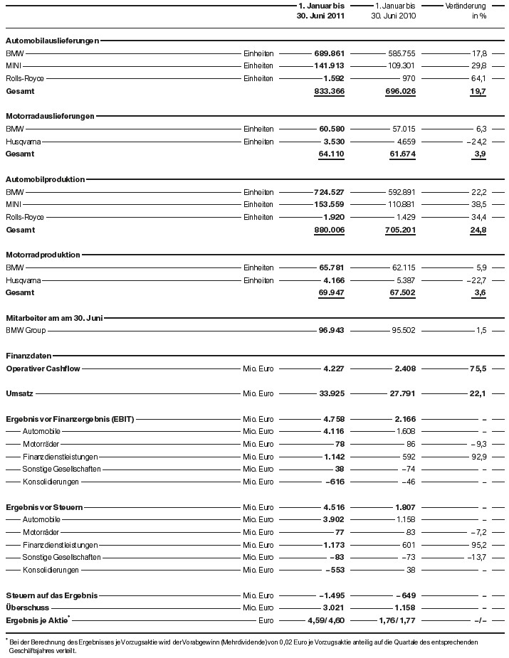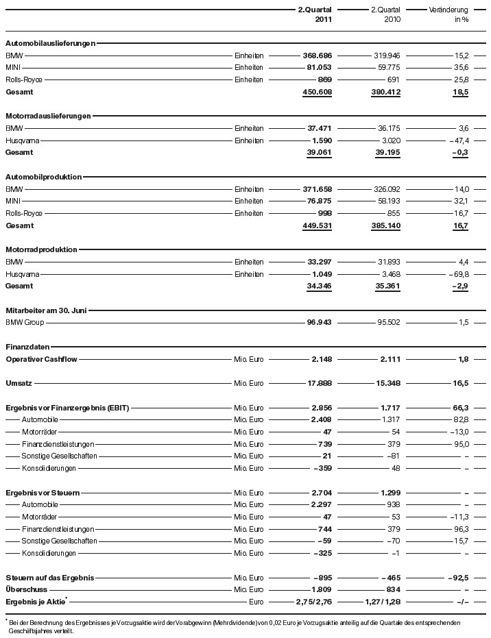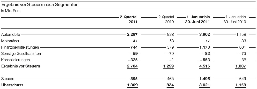 Trotz hoher Erwartungen der Analysten konnte die BMW Group mit den heute veröffentlichten Zahlen zum zweiten Quartal 2011 positiv überraschen. Der operative Gewinn von 2,856 Milliarden Euro liegt nicht nur 66,3 Prozent über dem Vorjahreszeitraum, sondern auch noch höher als prognostiziert. Nach Steuern verbleibt ein Gewinn von 1,809 Milliarden Euro, während es im Vorjahreszeitraum “nur” 834 Millionen waren. Lediglich beim Umsatz fiel der Zuwachs mit 16,5 Prozent auf 17,888 Milliarden Euro etwas niedriger als erwartet aus.