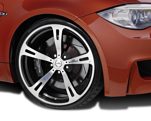 Den momentan sichtbarsten Unterschied zur Serie stellen die großen Leichtmetallräder dar, die in den Formaten 19 und 20 Zoll und den Design-Typen IV, V und VIII auf das 1er M Coupé passen. Für die Hinterachse sind dabei Reifen mit einer Breite von bis zu 295 Millimeter verfügbar, an der Vorderachse kommen Reifen mit 235 oder 245 Millimeter Breite zum Einsatz.