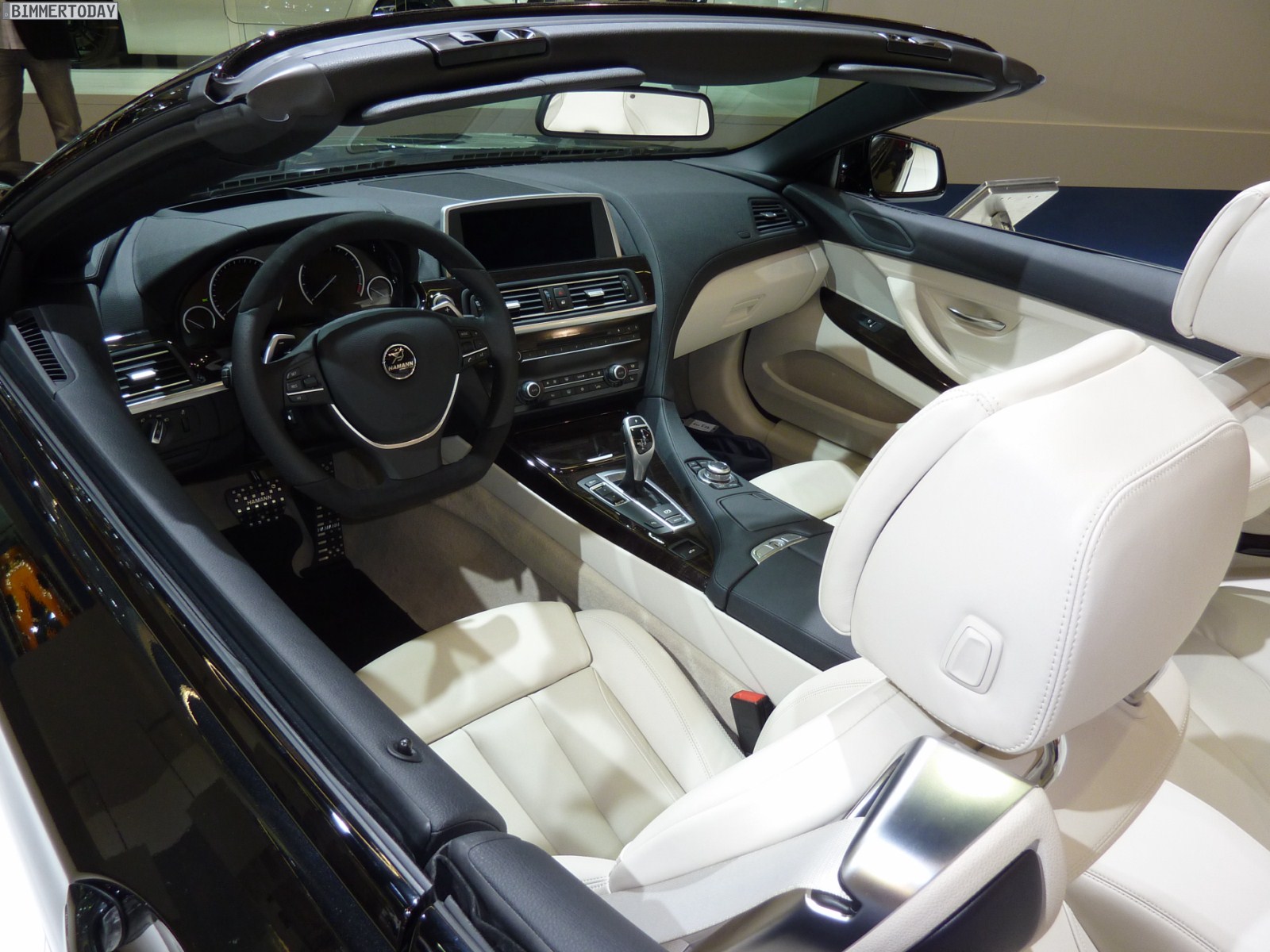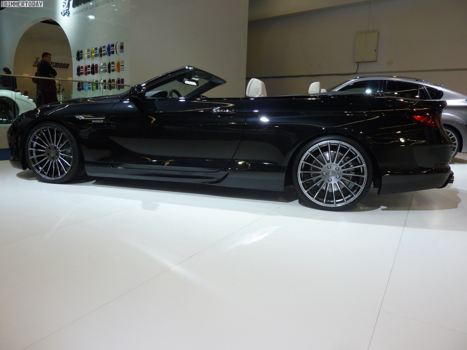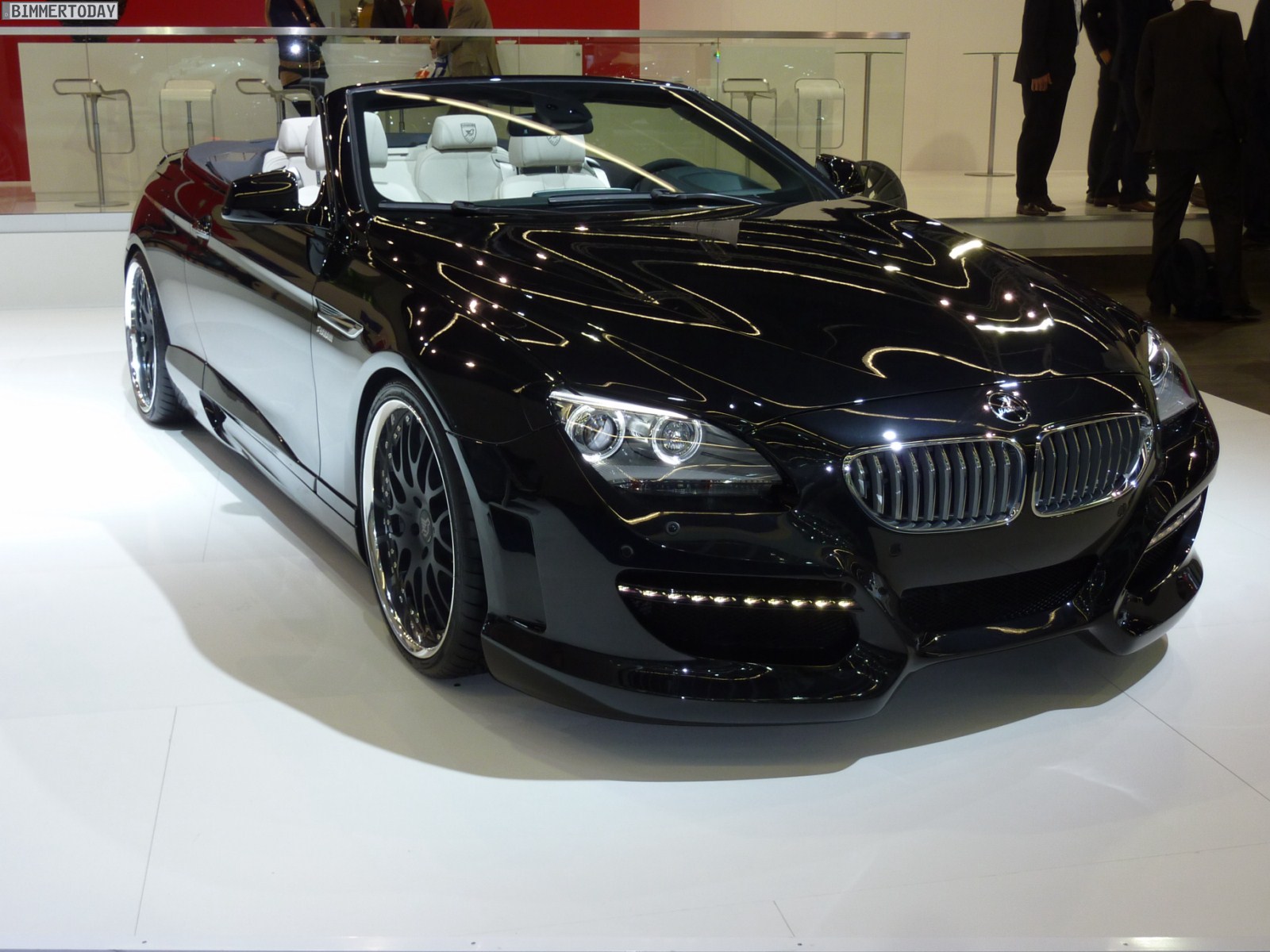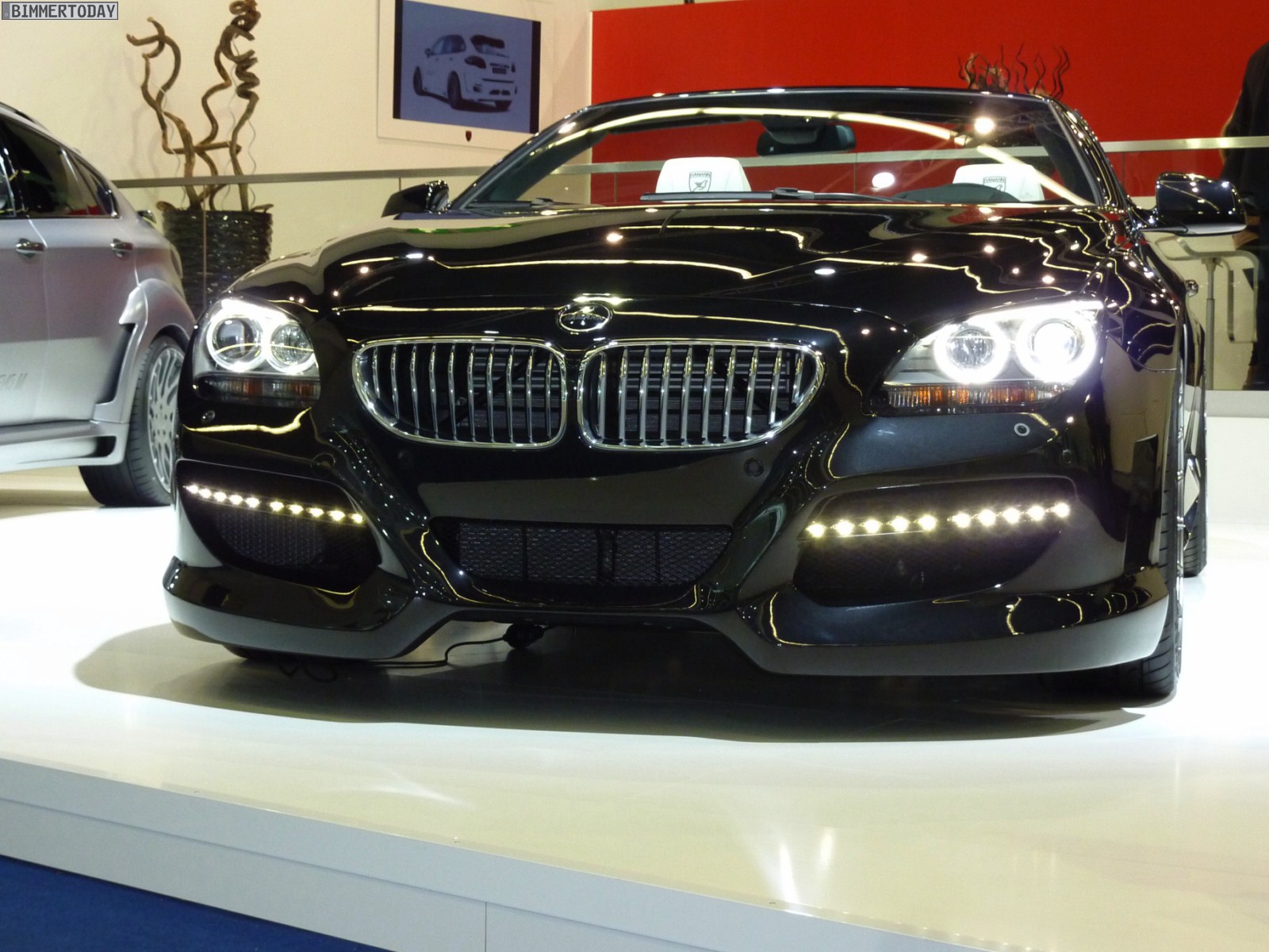 Das gezeigte Fahrzeug basiert auf dem 650i und steht auf Felgen im 21 Zoll-Format, wobei auch Hamann beide Fahrzeugseiten zur Präsentation verschiedener Designs nutzt. Lackiert sind das Cabrio und sämtliche Anbauteile aus Laupheim in Saphirschwarz metallic, was sehr gut mit dem hellen Interieur in Elfenbeinweiß harmoniert. Die Frontschürze verfügt über drei große Lufteinlässe und Tagfahrlicht-LEDs, was zwar nicht jedermanns Geschmack treffen dürfte, aber mit Sicherheit für viel Überholprestige sorgt.