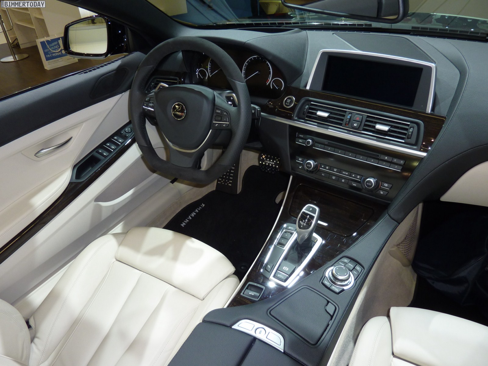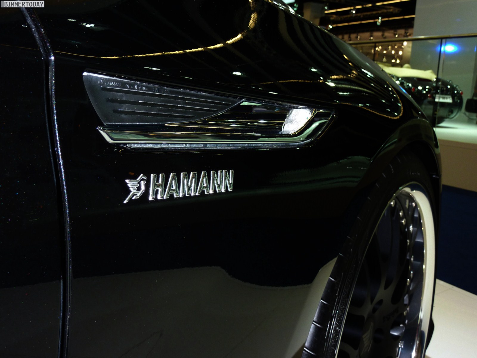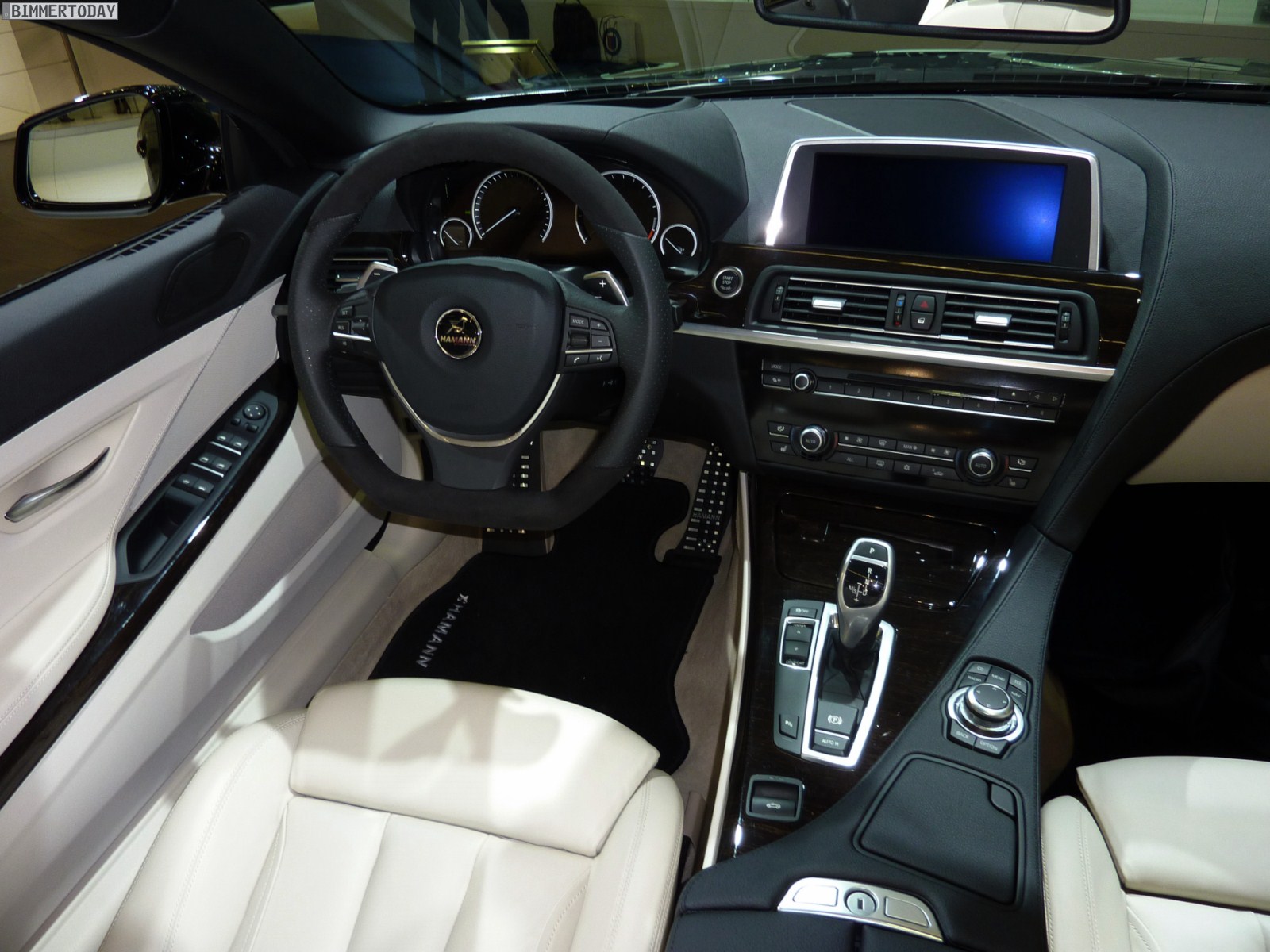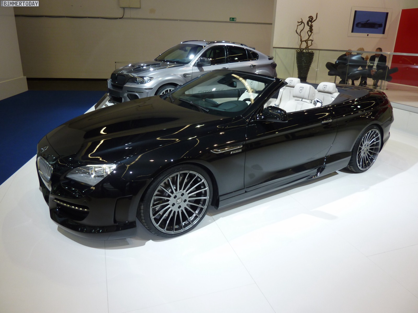Das gezeigte Fahrzeug basiert auf dem 650i und steht auf Felgen im 21 Zoll-Format, wobei auch Hamann beide Fahrzeugseiten zur Präsentation verschiedener Designs nutzt. Lackiert sind das Cabrio und sämtliche Anbauteile aus Laupheim in Saphirschwarz metallic, was sehr gut mit dem hellen Interieur in Elfenbeinweiß harmoniert. Die Frontschürze verfügt über drei große Lufteinlässe und Tagfahrlicht-LEDs, was zwar nicht jedermanns Geschmack treffen dürfte, aber mit Sicherheit für viel Überholprestige sorgt.