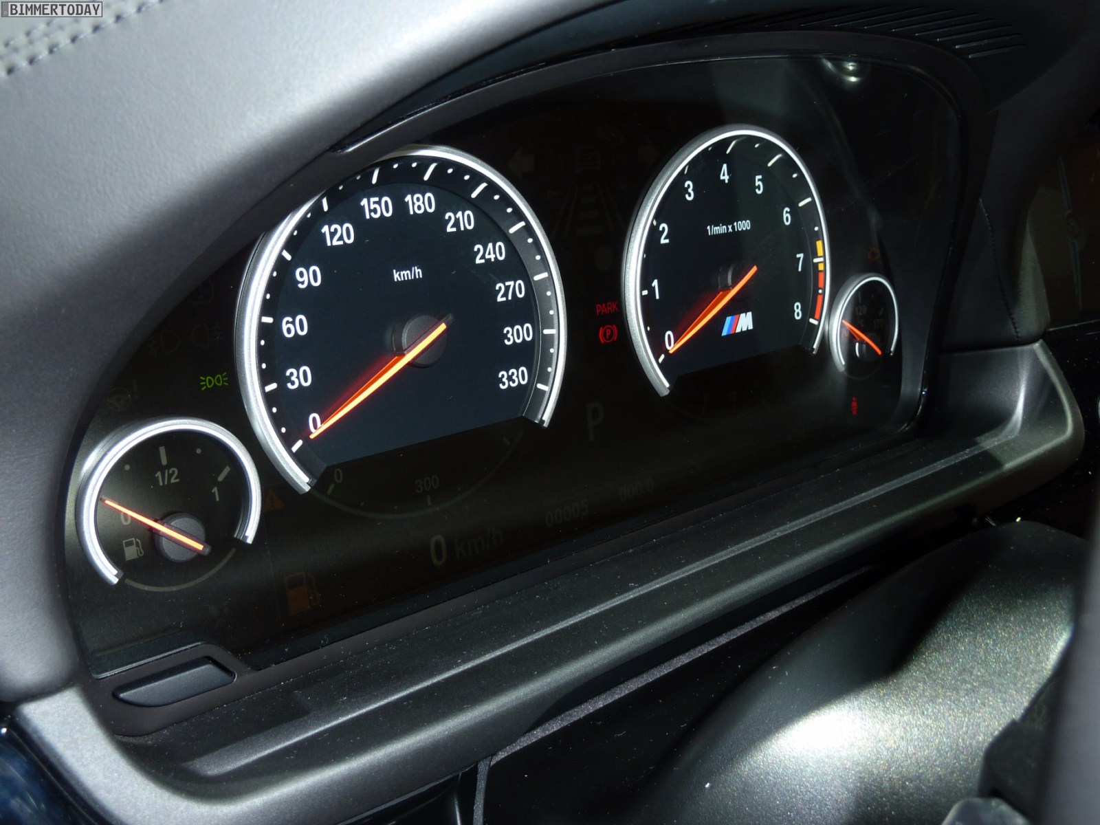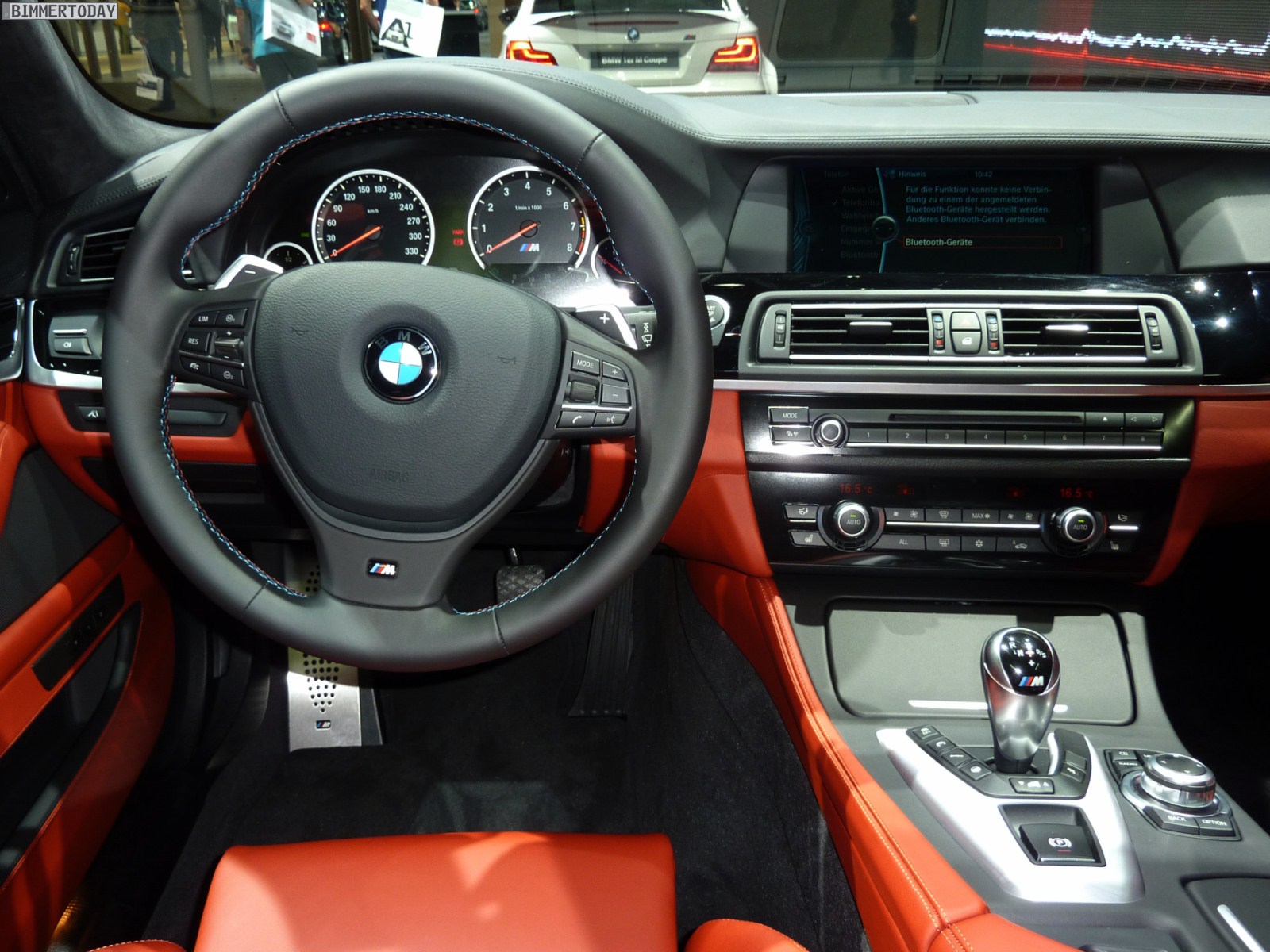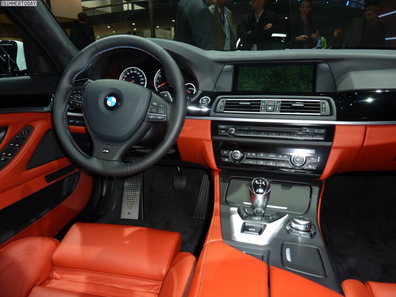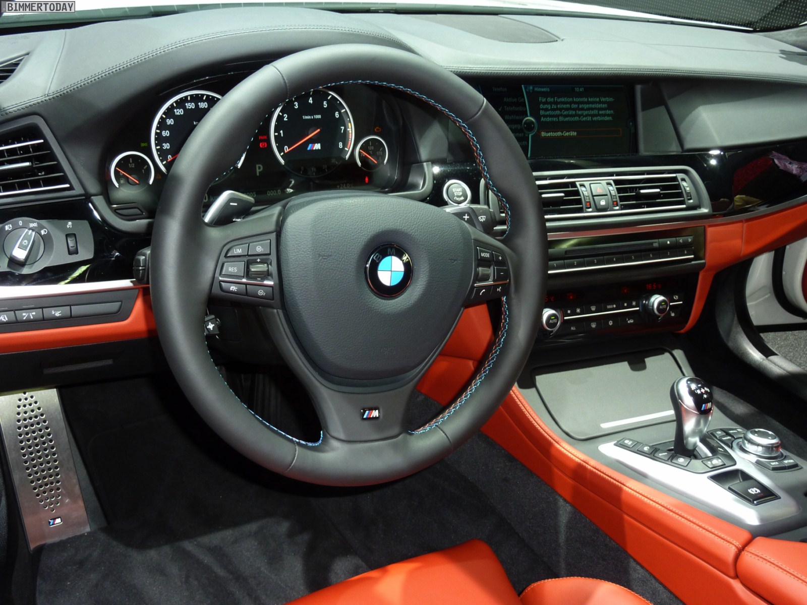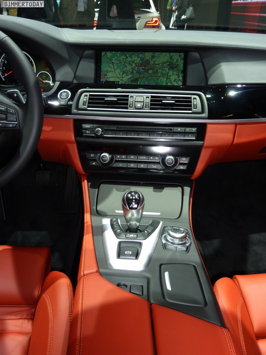 Im Innenraum hebt sich das Ausstellungsfahrzeug mit der Volllederausstattung Merino Feinnarbe in der Farbe Sakhir Orange von der automobilen Masse ab, bei den Interieurleisten handelt es sich um die Variante Pianolack Schwarz. Zahlreiche Optionen wie Head Up Display, Klimaautomatik und Xenon-Scheinwerfer gehören zum Serienumfang aller M5. So, wie er auf den Bildern zu sehen ist, wechselt der neue M5 für 123.620 Euro den Besitzer.