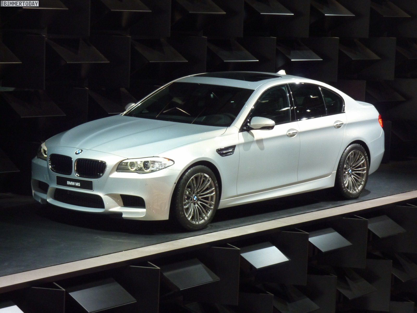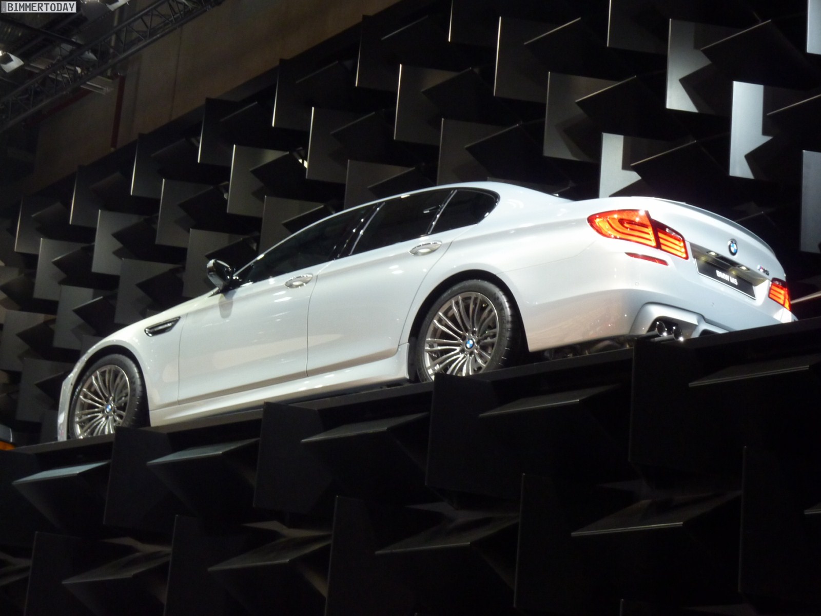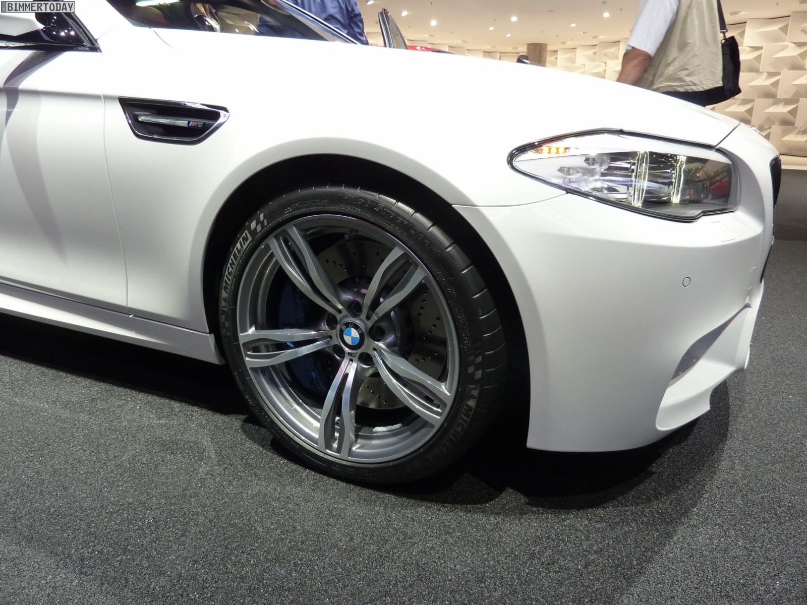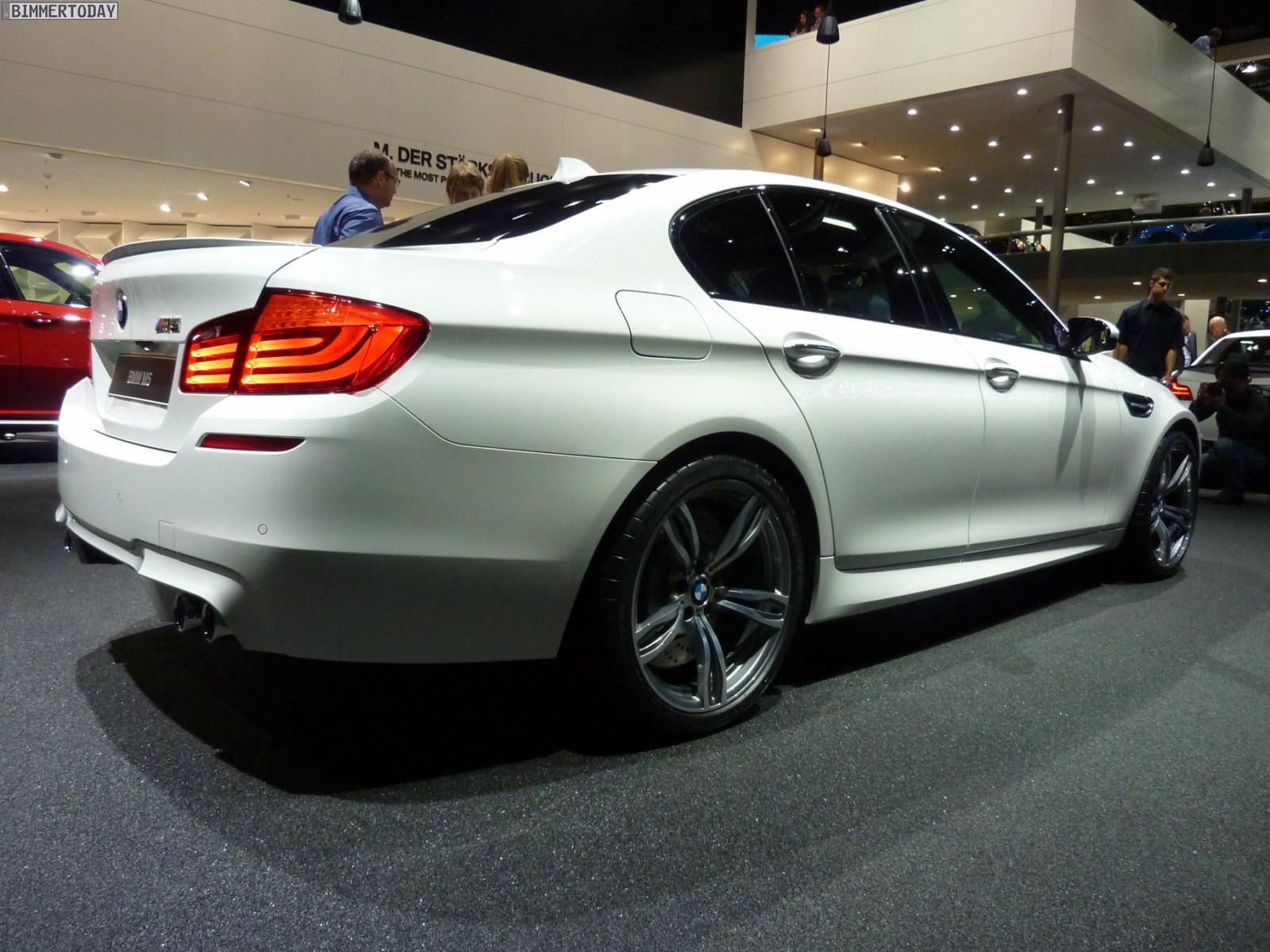 Das dritte Fahrzeug in Mondstein Metallic steht etwas oberhalb der eigentlichen Ausstellungsfläche auf einer Ebene mit der umlaufenden Fahrbahn, auf der verschiedene Fahrzeuge fahrend präsentiert werden. Der weiße M5 trägt die optionalen 20 Zoll M Leichtmetallräder Doppelspeiche 343 M und die BMW Individual Sonnenschutzverglasung mit dunkleren Scheiben ab der B-Säule.