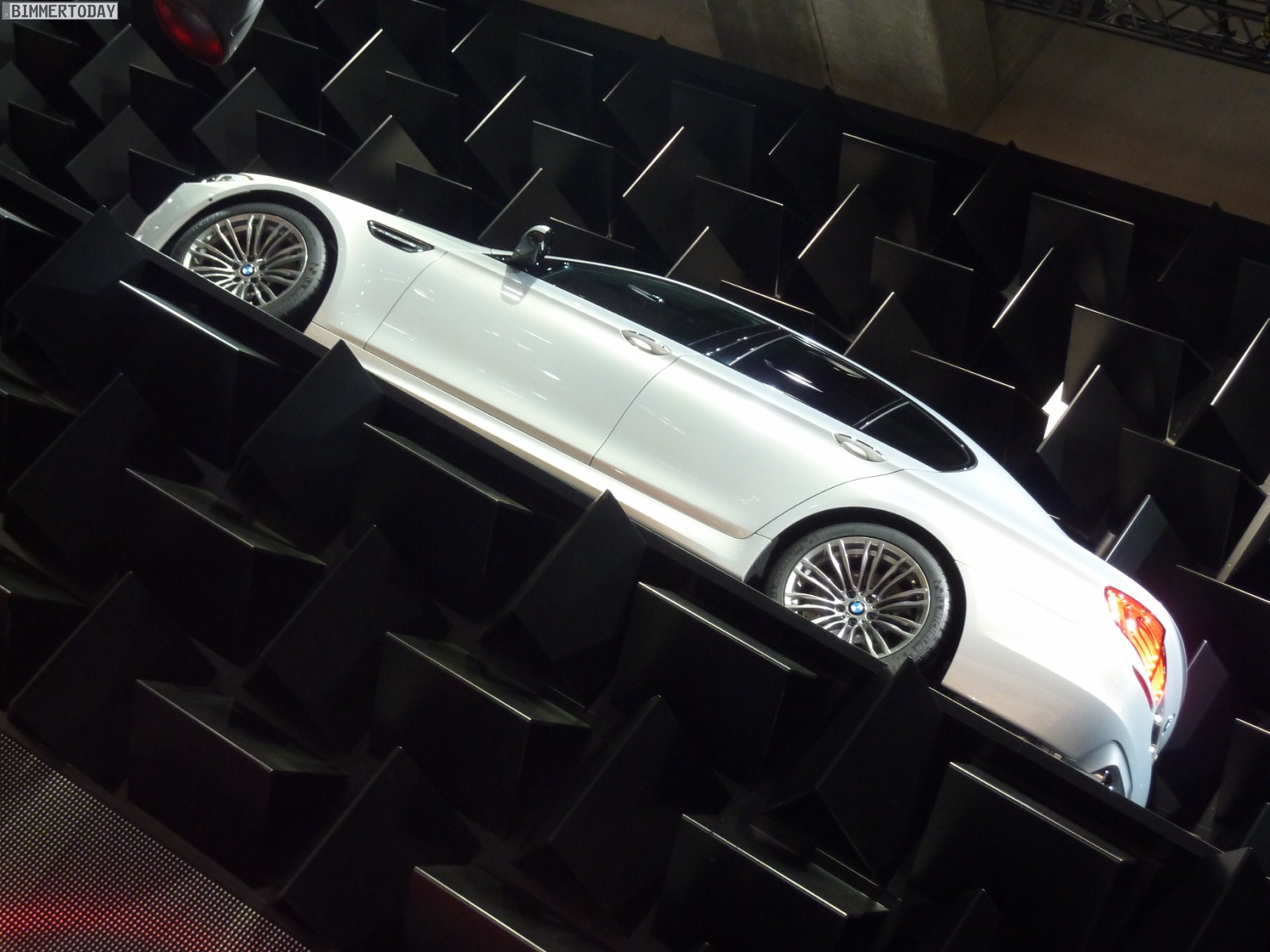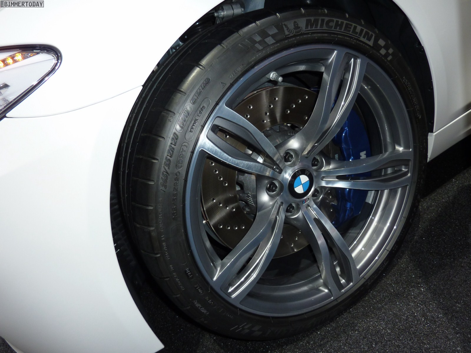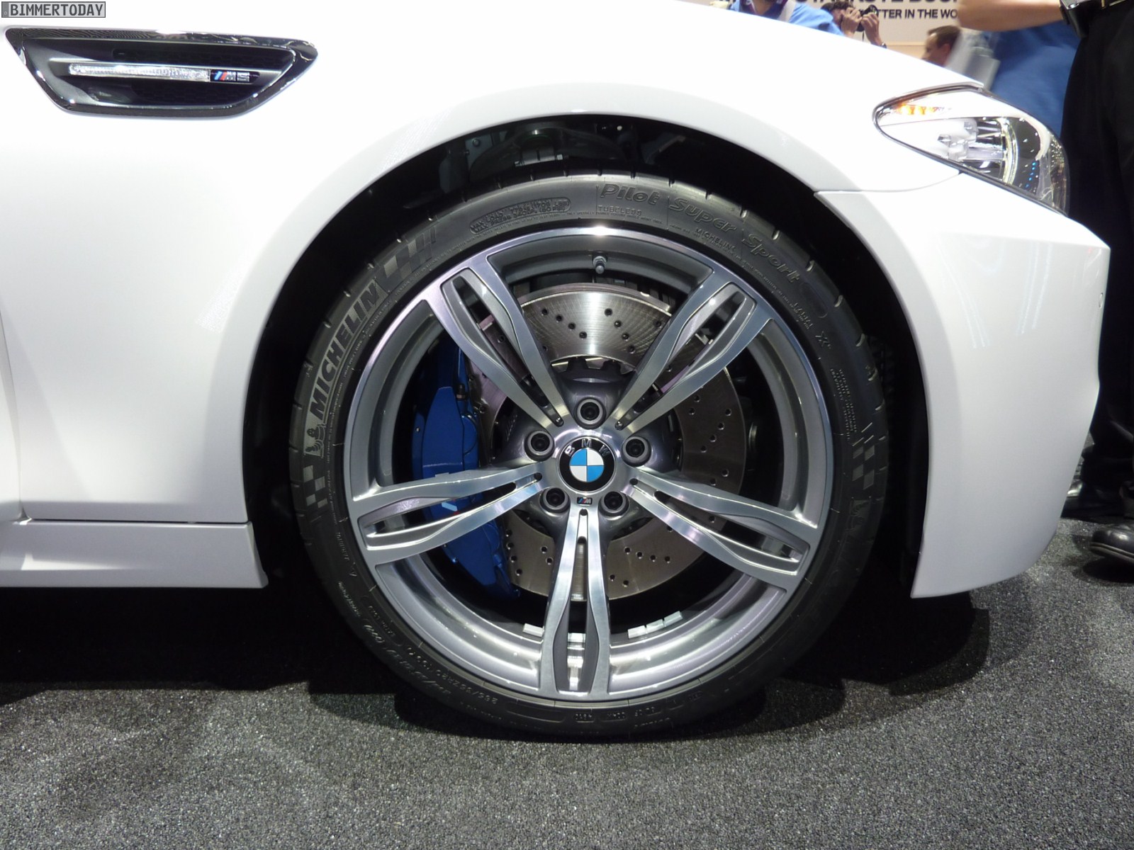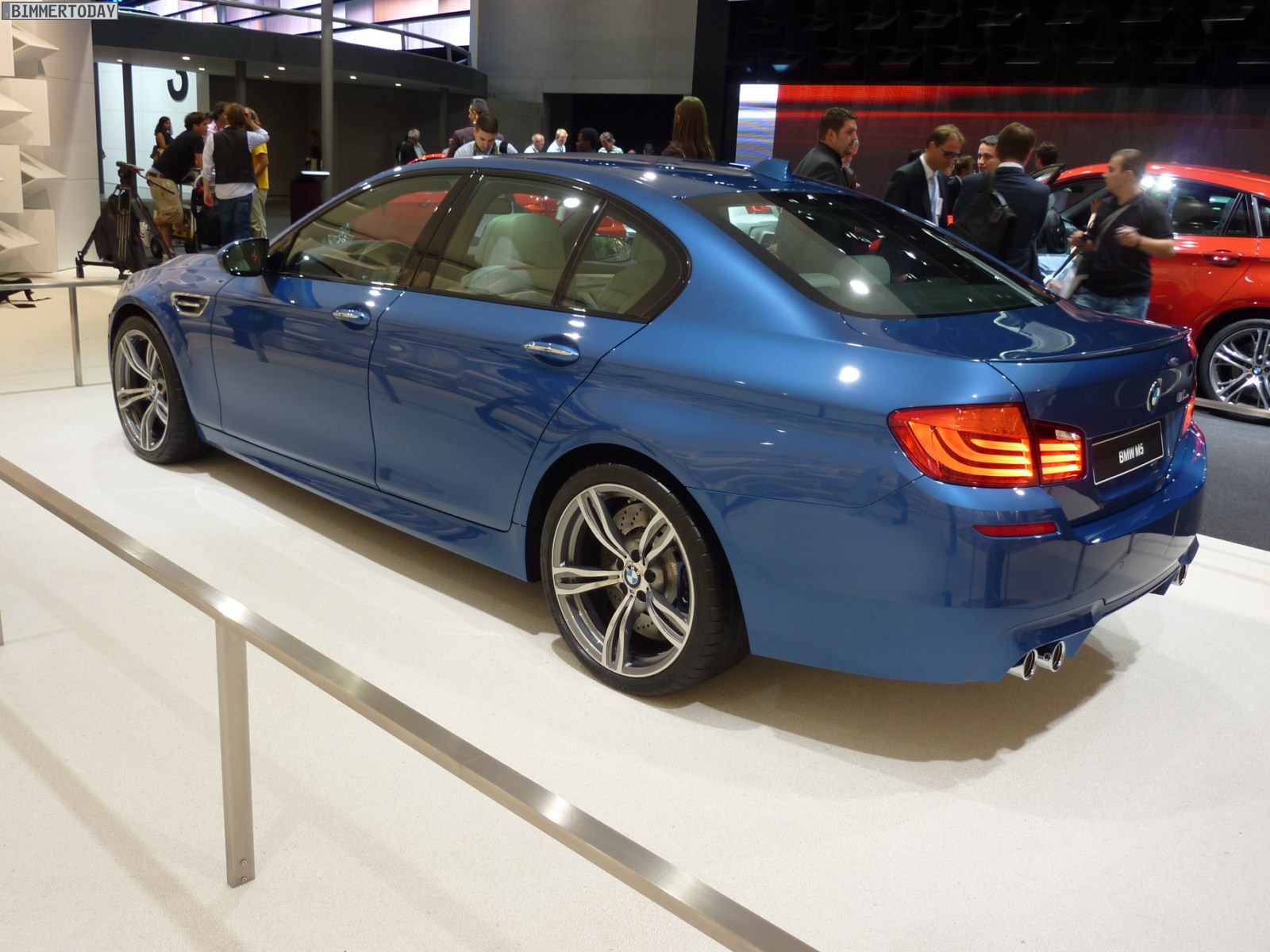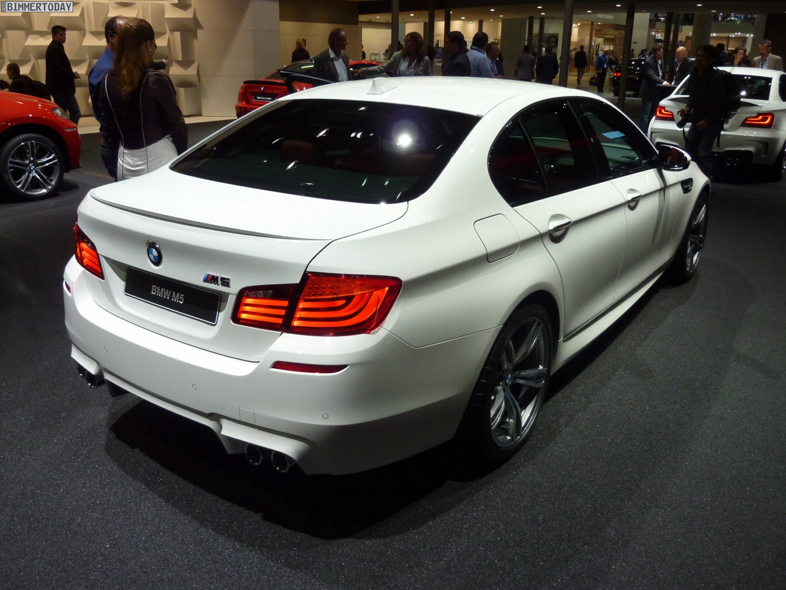 Das dritte Fahrzeug in Mondstein Metallic steht etwas oberhalb der eigentlichen Ausstellungsfläche auf einer Ebene mit der umlaufenden Fahrbahn, auf der verschiedene Fahrzeuge fahrend präsentiert werden. Der weiße M5 trägt die optionalen 20 Zoll M Leichtmetallräder Doppelspeiche 343 M und die BMW Individual Sonnenschutzverglasung mit dunkleren Scheiben ab der B-Säule.