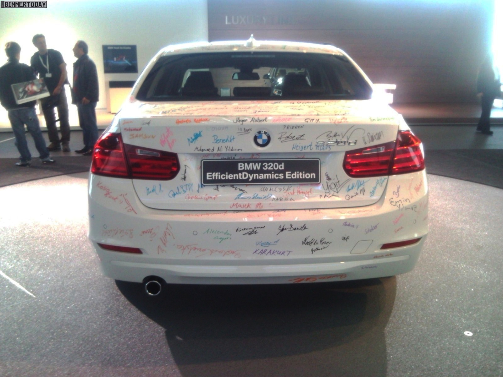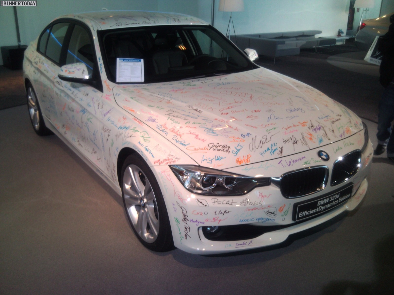 Neben dem F30 mit M Paket ist in der BMW Welt derzeit auch ein BMW 320d EfficientDynamics Edition ohne Line und mit zahlreichen Unterschriften von Mitarbeitern zu sehen. Der 320d ED leistet 163 PS und bietet einen Normverbrauch von 4,1 Liter auf 100 Kilometer, womit er sich auf dem Niveau des BMW 320d EfficientDynamics Edition der Vorgänger-Generation E90 befindet.