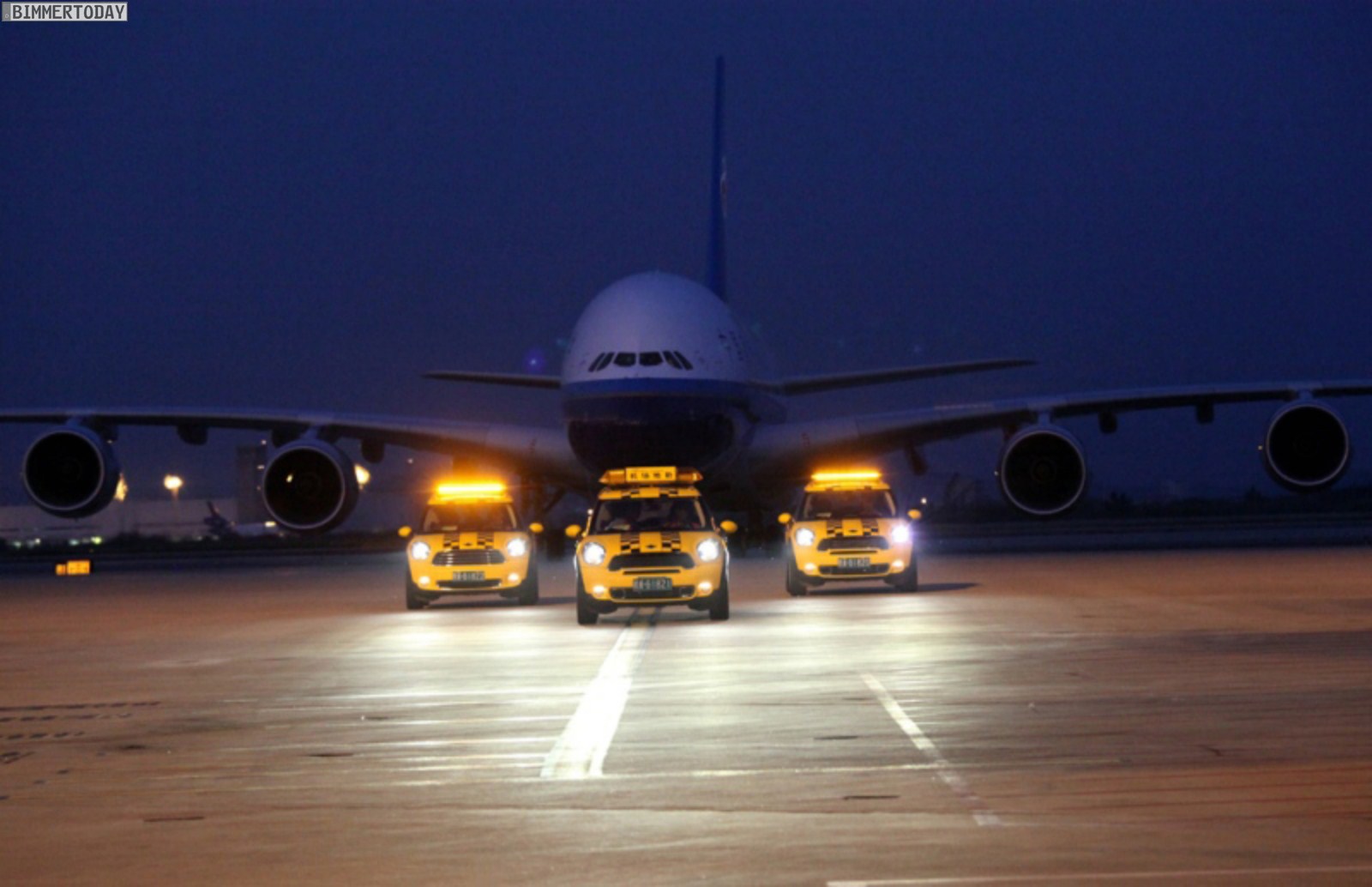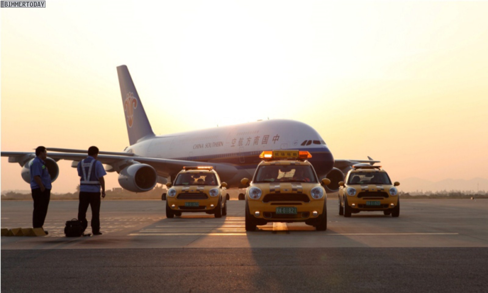 Derartige Begegnungen wird es künftig öfter geben, denn BMW China arbeitet seit einigen Tagen mit dem Flughafen von Guangzhou zusammen und stellt drei Countryman für das Bodenpersonal des Airports zur Verfügung. Ihren ersten Einsatz hatten die drei unübersehbar gestalteten Fahrzeuge bei der Landung des ersten von fünf Airbus A380 der Fluggesellschaft China Southern Airlines, die von Guangzhou Verbindungen nach Peking und Paris anbieten möchte.