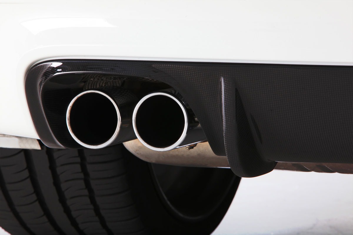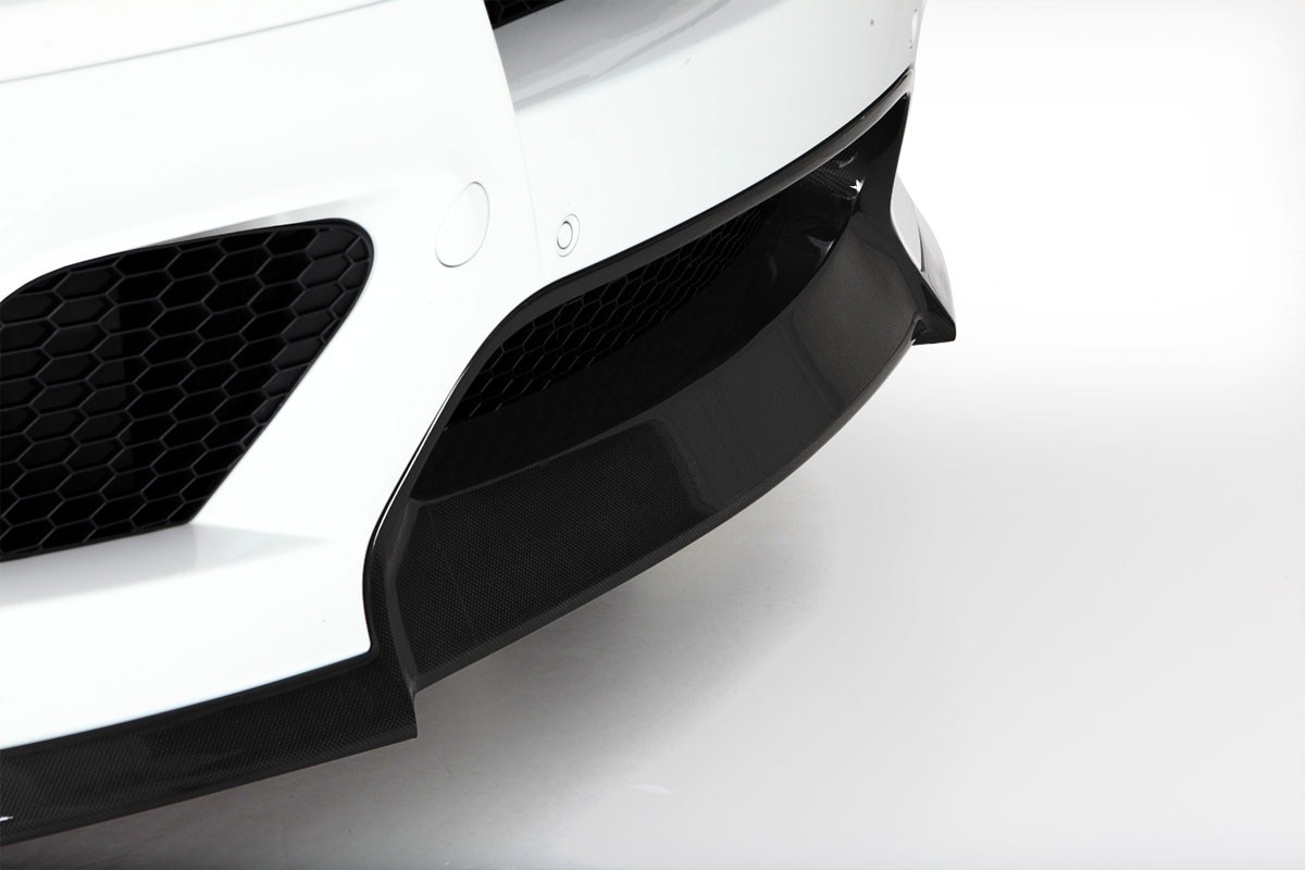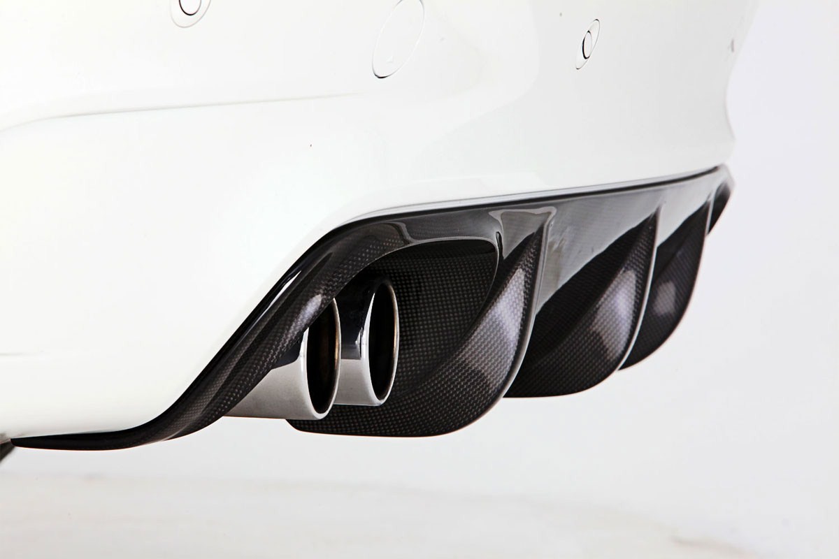 Für die Frontschürze hat Vorsteiner einen großen Carbon-Aufsatz entwickelt, der vor allem in Kombination mit hellen Außenfarben ins Auge fällt. Ähnliches gilt für den Carbon-Diffusor-Einsatz, der sich relativ dezent in die serienmäßige Heckschürze einfügt und genau wie die getönten Scheiben und die dunkelgrau gehaltenen Felgen einen schönen Kontrast zur weißen Lackierung bietet.