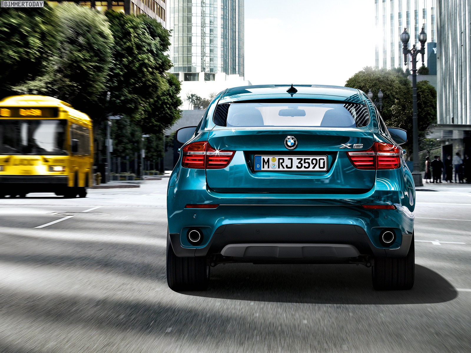 Zu sehen ist ein BMW X6 xDrive35i E71 LCI in der neuen Außenfarbe Midnightblau metallic. Gut zu erkennen sind die innerhalb der äußeren Lufteinlässe neu positionierten und von neuen Einfassungen in mattem Silber umgebenen Nebelscheinwerfer, die überarbeiteten Scheinwerfer und die dreidimensionaler gestaltete Niere. Auch vom neuen Innenleben der Rückleuchten erhalten wir auf den Bildern einen guten Eindruck.