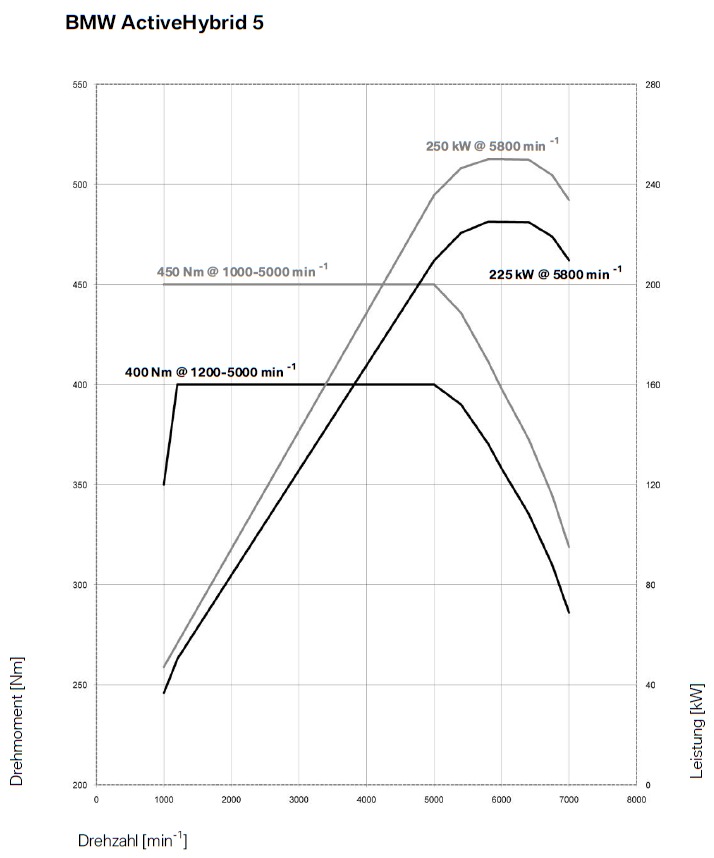 Resultat dieser Kombination sind eine Systemleistung von 340 PS und ein Normverbrauch von 6,4 Liter auf 100 Kilometer – rund zwanzig Prozent weniger Normverbrauch bei etwas mehr als zehn Prozent Mehrleistung. Beim Sprint aus dem Stand auf Tempo 100 liegen beide Modelle laut Werk bei 5,9 Sekunden, weil die Mehrleistung des ActiveHybrid 5 von seinen 150 Kilogramm Mehrgewicht ausgeglichen wird. Bei rollendem Start dürfte der Hybrid-5er zwar die etwas besseren Fahrleistungen bieten, im Alltag spielt diese Tatsache aber ohnehin keine Rolle.