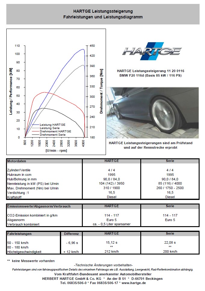 Auf einem völlig anderen längsdynamischen Niveau bietet Hartge auch eine Leistungssteigerung für den BMW 116d F20, der ab Werk 116 PS leistet und nach dem Tuning für 1.660,05 Euro auf 142 PS kommt. Damit erreicht der 116d das Leistungsniveau des 118d, für dessen Besitzer Hartge ebenfalls eine Leistungssteigerung im Programm hat: Für ebenfalls 1.660,05 Euro stehen dann 174 PS zu Buche. Wie sich das Tuning für den 116d auf die Fahrleistungen auswirkt, zeigt das folgende Video: