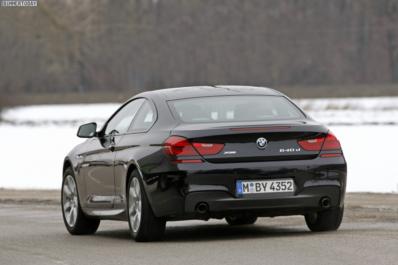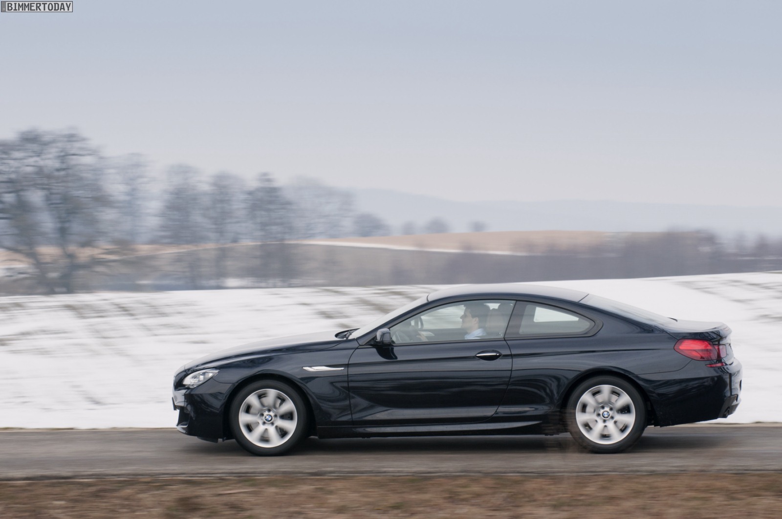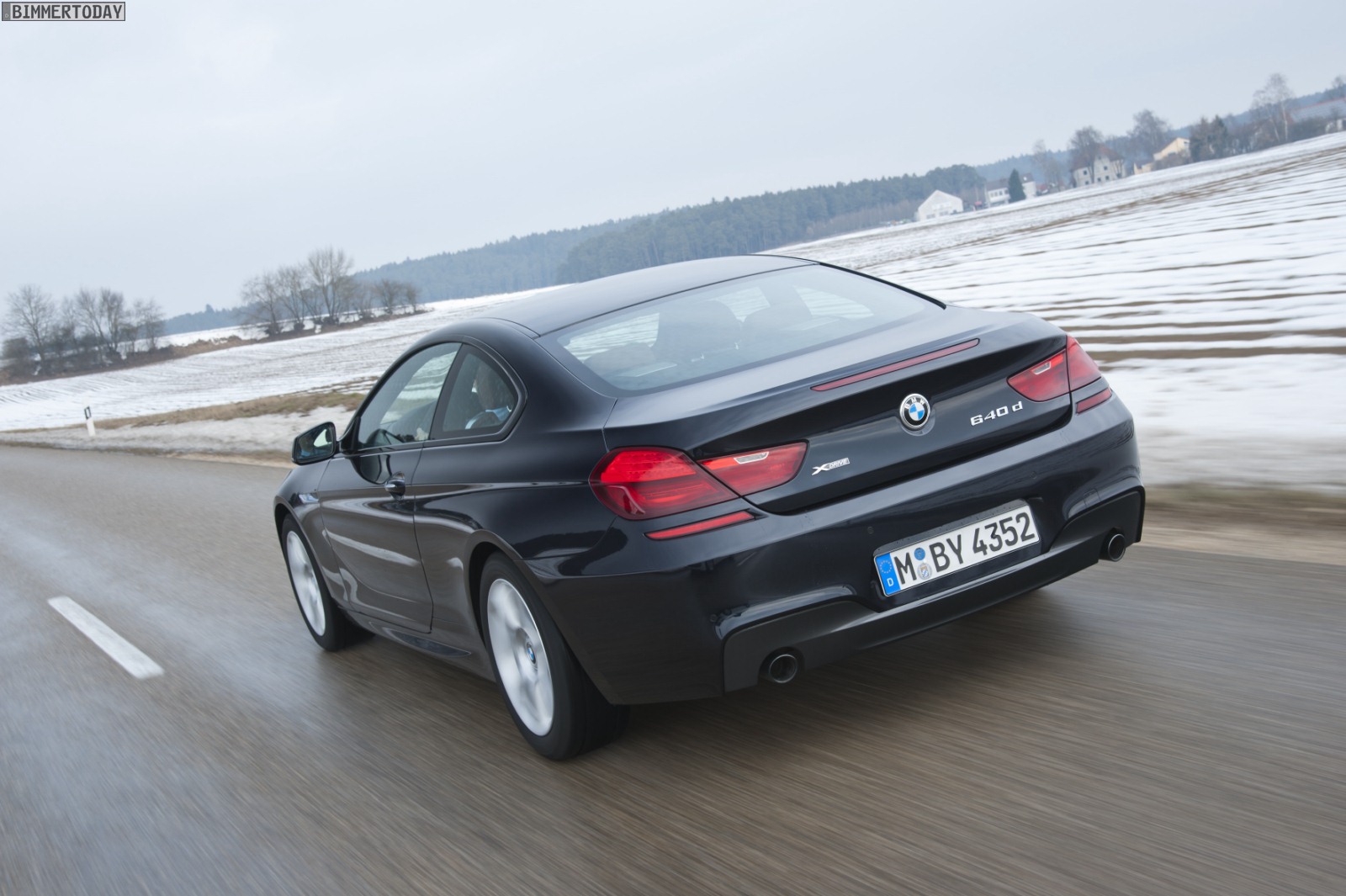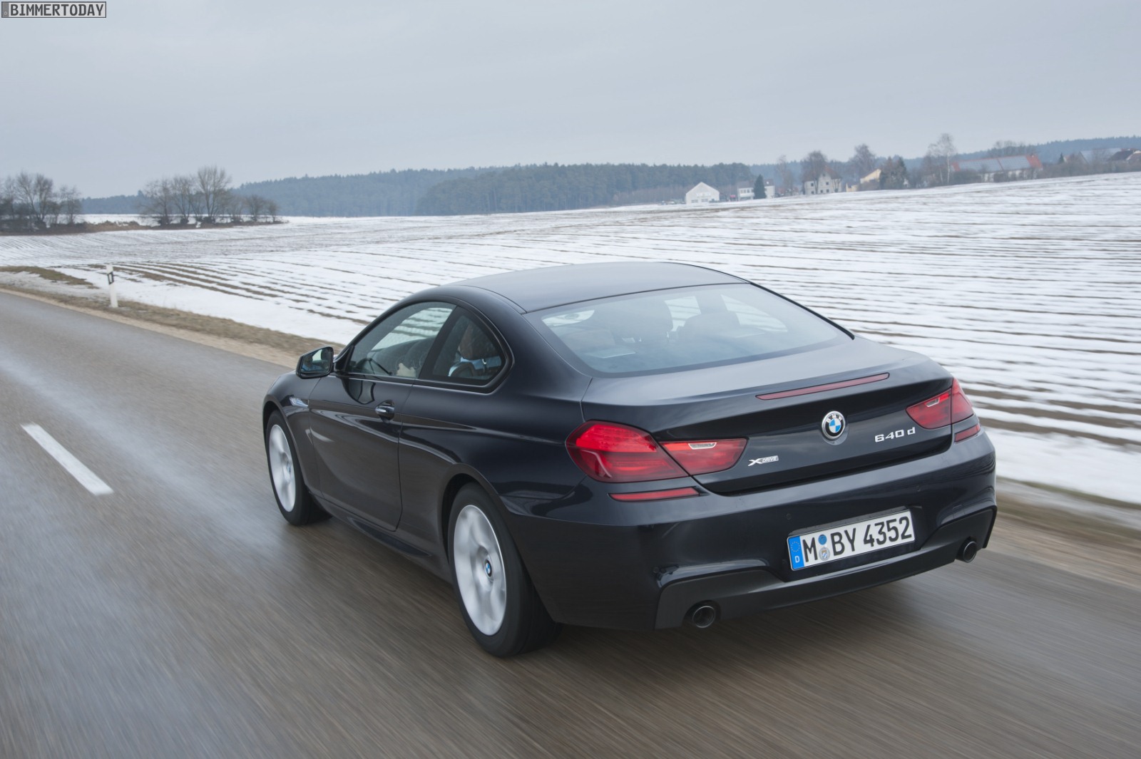 Eine neue Bilderserie aus München zeigt uns nun ein BMW 640d xDrive Coupé mit M Sportpaket, wie es Pressevertreter in den letzten Tagen ausführlich testen durften. Beim Sprint von 0 auf 100 km/h ist die xDrive-Variante des 640d F13 mit 5,2 Sekunden eine Zehntel schneller als der 80 Kilogramm leichtere Hecktriebler, dafür fällt der Normverbrauch mit 5,7 bis 5,8 Liter etwas höher aus als beim “normalen” 640d, der je nach Bereifung 5,4 bis 5,5 Liter auf 100 Kilometer benötigt.