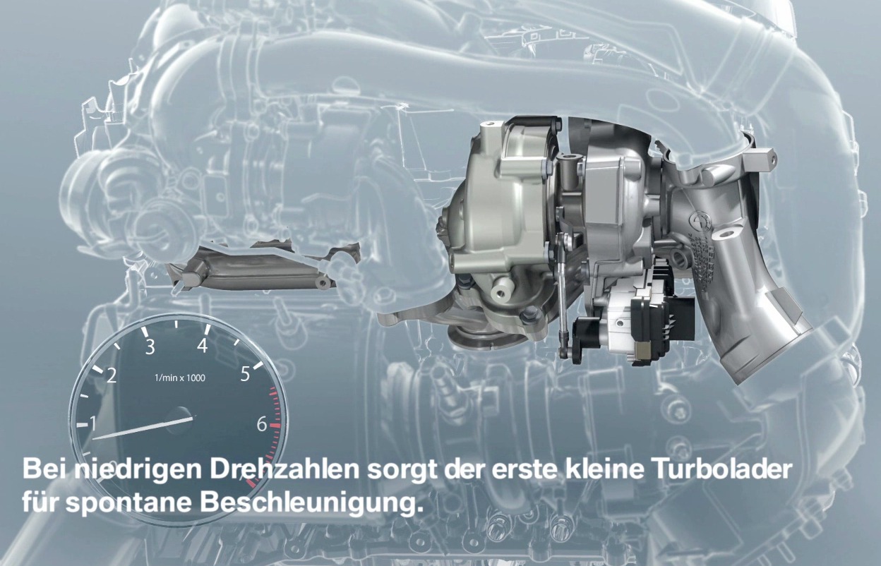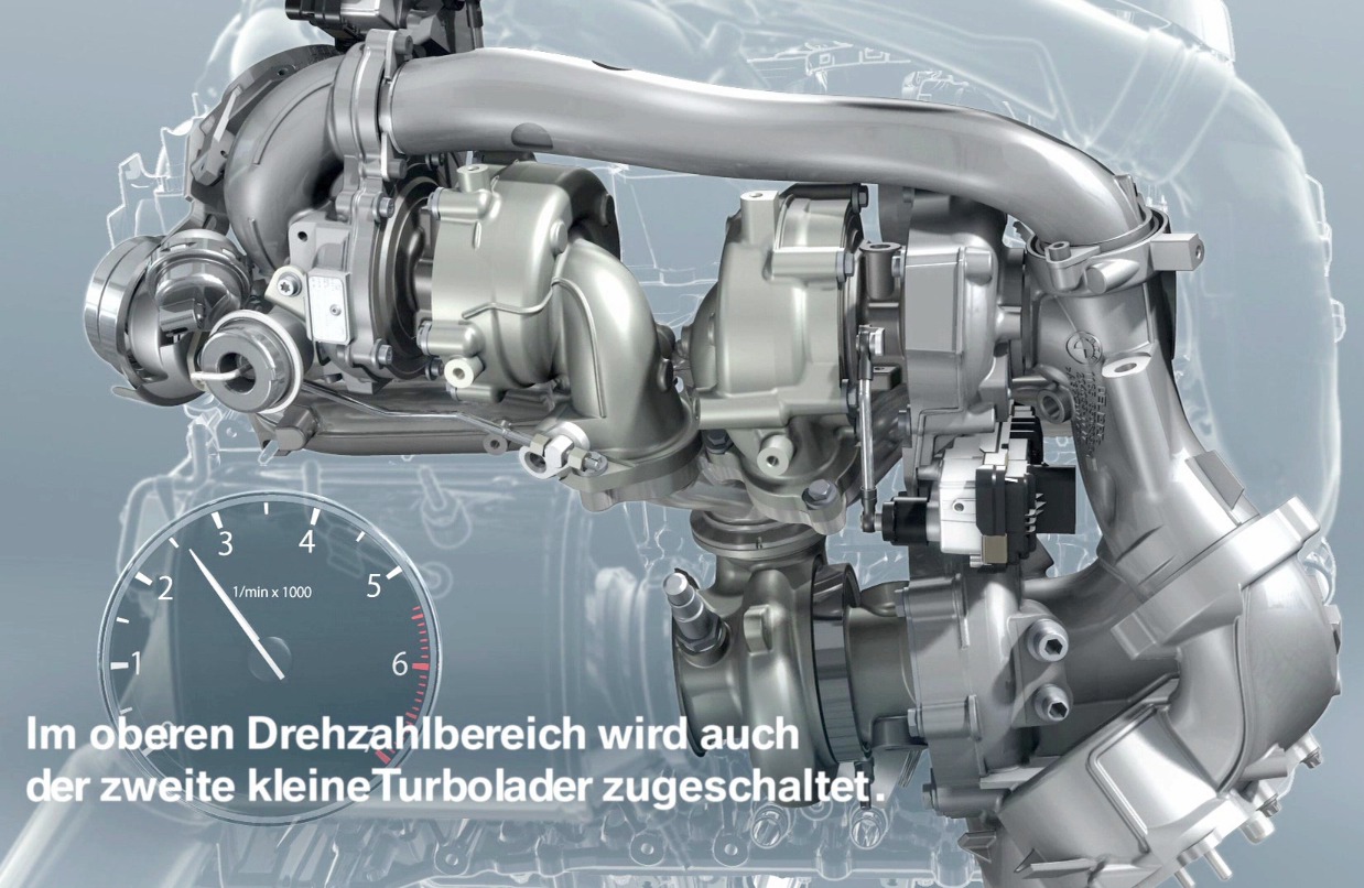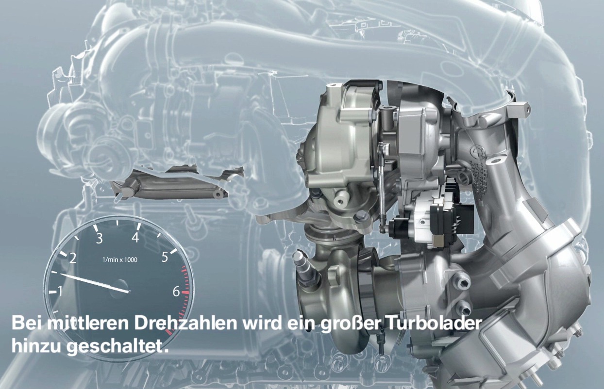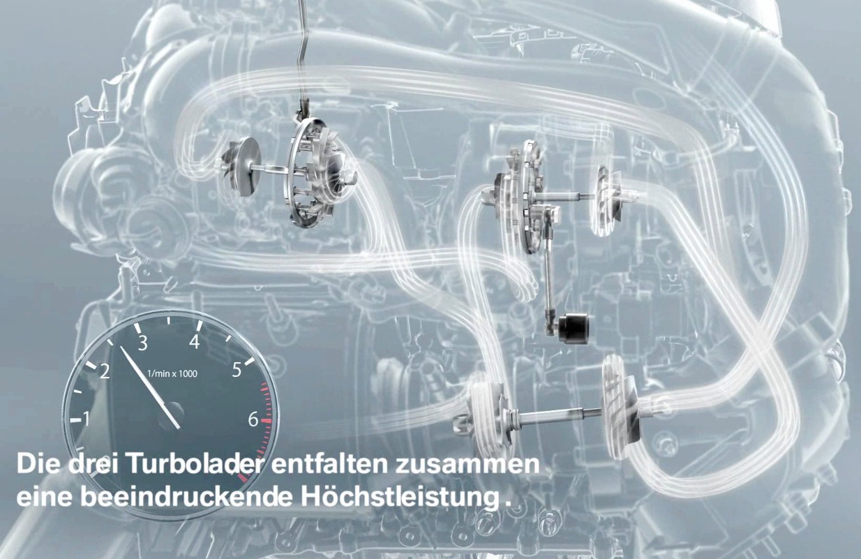 Kommen wir nun zu den Einsatzgebieten und der technischen Konfiguration der drei Turbolader: Zunächst ist festzustellen, dass es sich um zwei kleinere und einen größeren Lader handelt, die je nach Leistungsbedarf zum Einsatz kommen. Bereits bei niedrigsten Drehzahlen kommt ein sehr kleiner Lader mit variabler Turbinengeometrie zum Einsatz, der extrem schnell anspricht und den Eindruck eines “Turbolochs” beinahe vollständig unterdrücken kann.