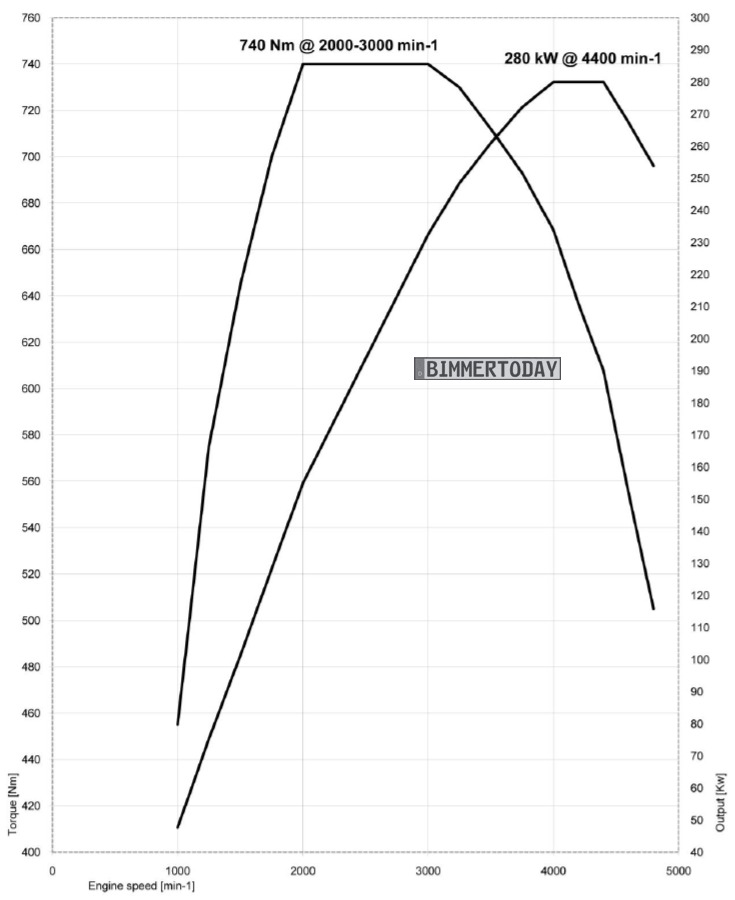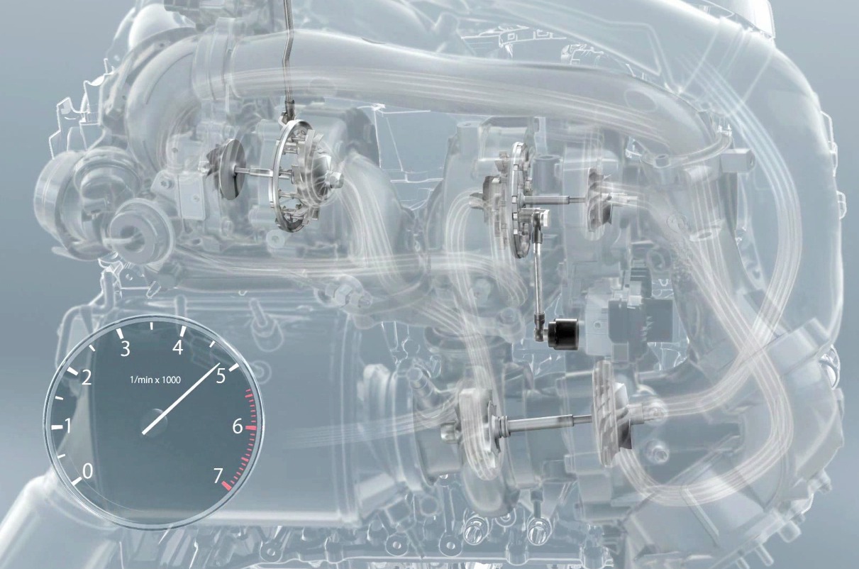 Zum Erreichen der Maximalleistung von 280 kW / 381 PS, die bei 4.400 U/min anliegt, wird ab einer Motordrehzahl von etwa 2.700 U/min ein noch stärkerer Abgasstrom benötigt. An dieser Stelle tritt der zweite kleine Lader in Aktion, der dank seiner Größe und seiner variablen Turbinengeometrie äußerst schnell anspricht und dem großen Lader noch mehr Abgase zuführt, wodurch dieser seine volle Kraft entfalten kann. Maximal erreicht das neue Triebwerk Drehzahlen von 5.400 Umdrehungen pro Minute.