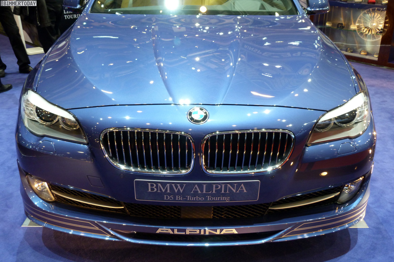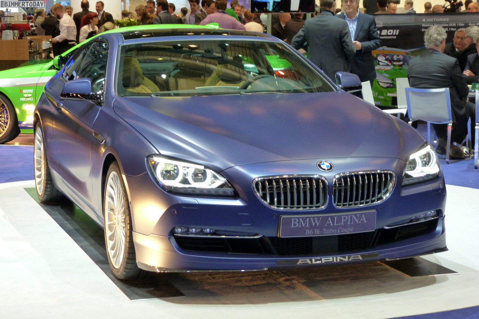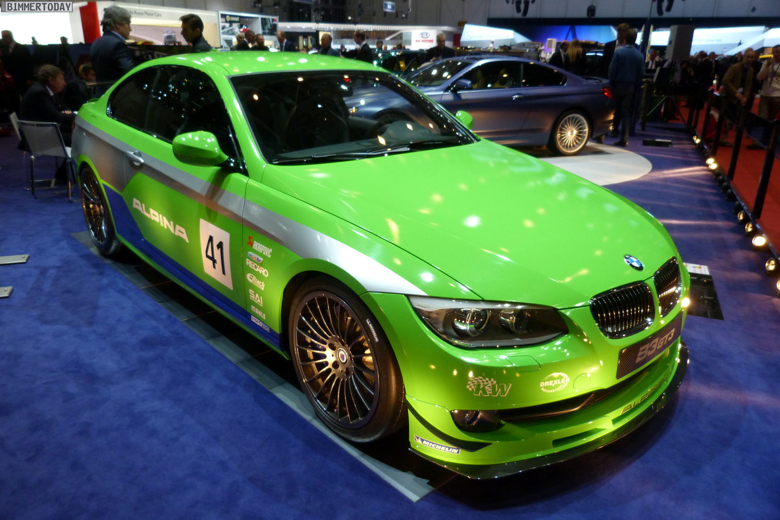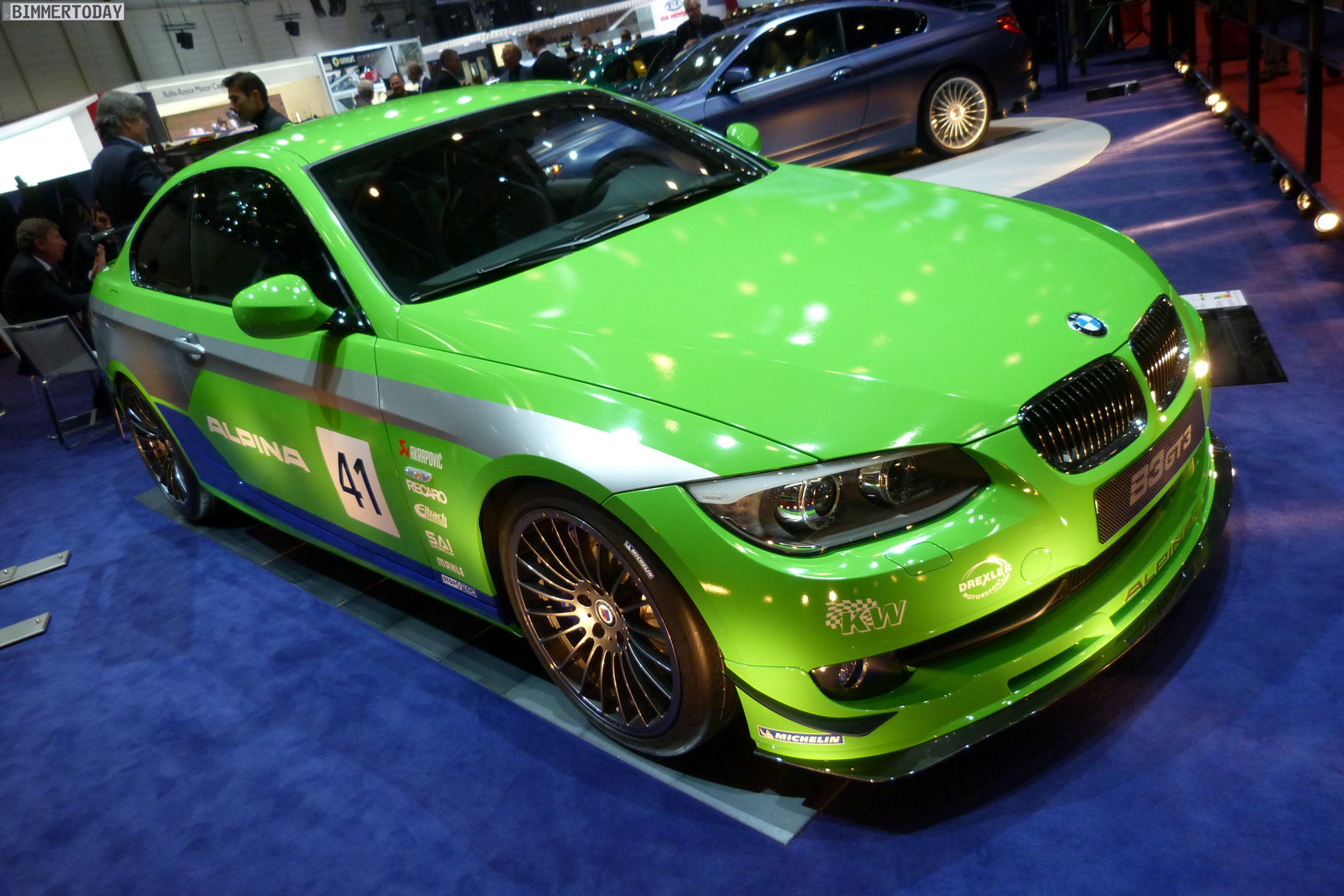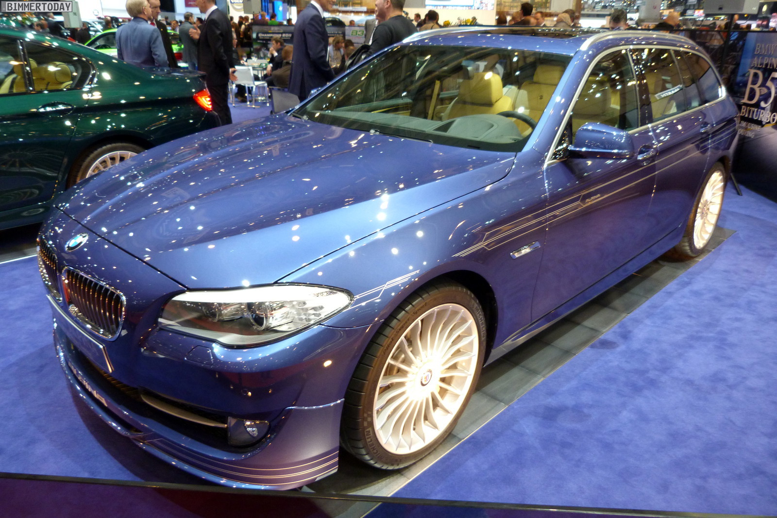 Neben dem matt-blauen B6 Coupé zeigt der Veredler aus dem Allgäu in Genf auch eine in Alpinagrün lackierte B5 Biturbo Limousine (F10), einen in glänzendem Alpinablau lackierten D5 Biturbo Touring und ein Exemplar des auf 99 Einheiten limitierten Alpina B3 GT3.