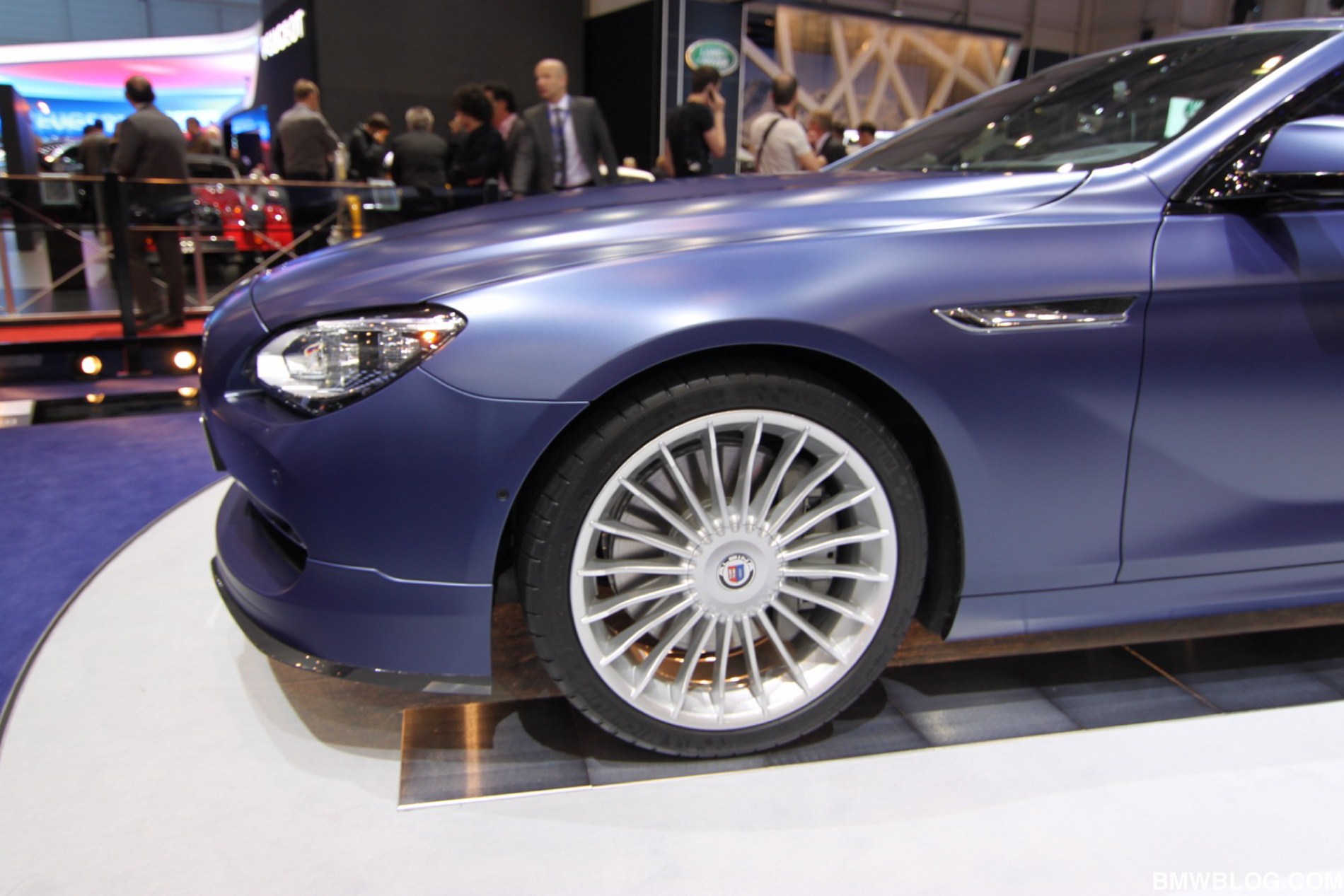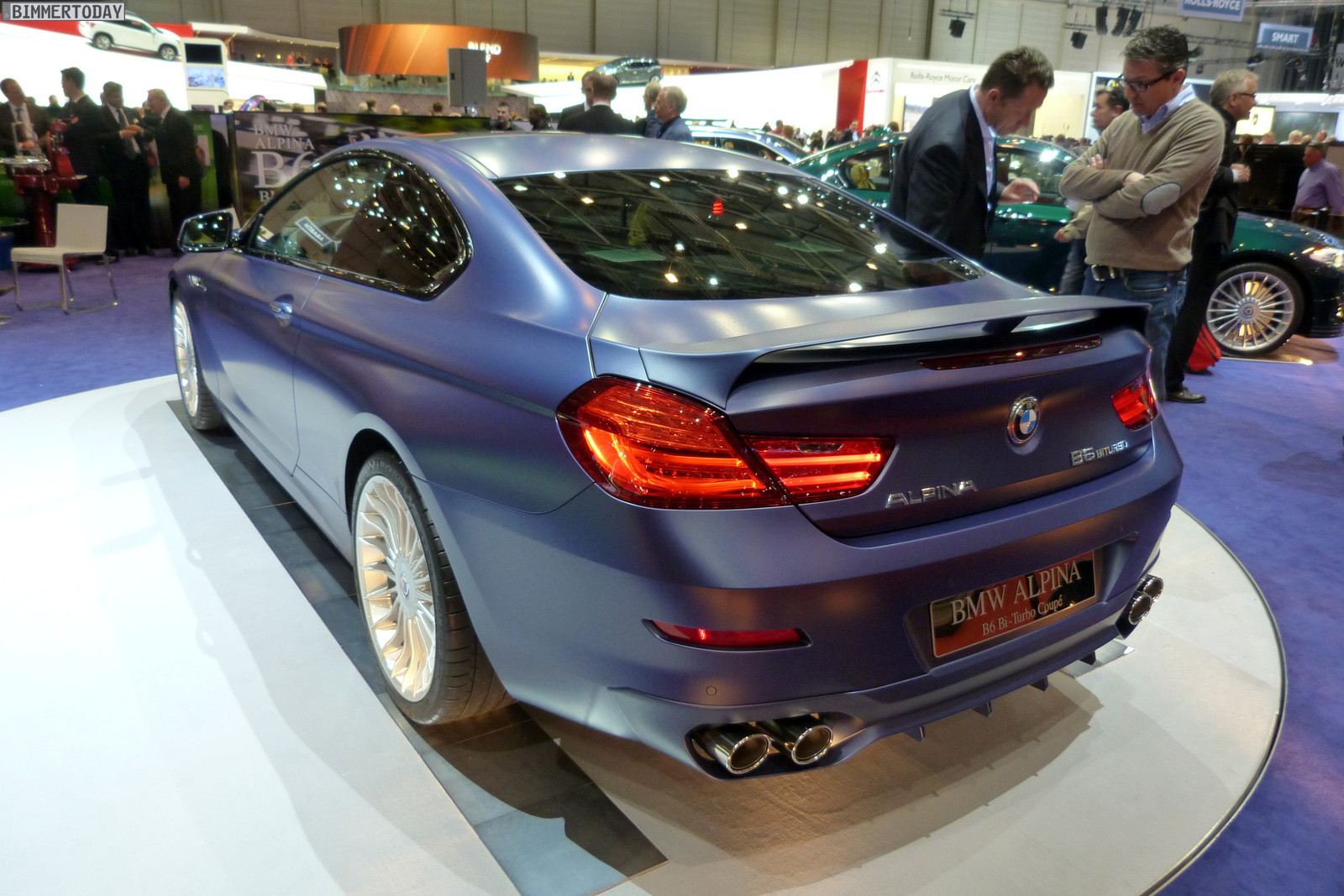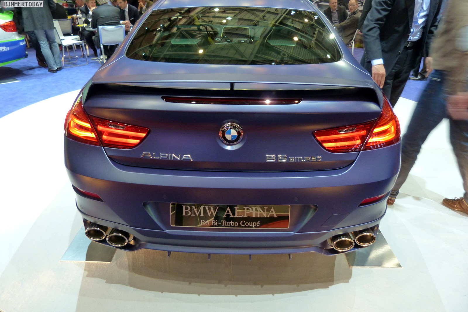 Unumstrittenes Highlight am Stand der Buchloer ist ein Alpina B6 Biturbo Coupé (F13) mit 540 PS starkem V8, das in der neuerdings erhältlichen matten Variante des klassischen Alpina-Blau lackiert ist. Der Heckspoiler auf dem Kofferraumdeckel kann von Liebhabern eines besonders dezenten Auftritts übrigens auch durch eine unauffälligere Spoilerlippe ersetzt werden.
