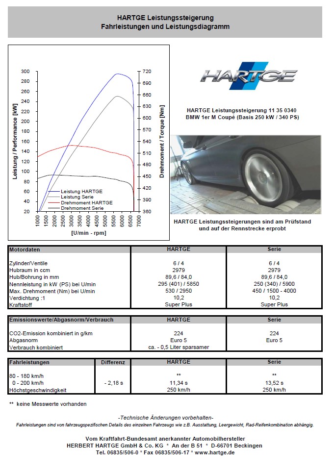 Auch wenn das Fahrzeug ab Werk ein sehr rundes Paket bietet, genügen die 340 PS des aufgeladenen Reihensechszylinders nicht allen Ansprüchen. Eine weitere Adresse für eine mögliche Leistungssteigerung ist nun Hartge, denn der eingetragene Hersteller aus Beckingen bietet ab sofort eine Leistungssteigerung auf 401 PS an. Zum Preis von 2.555,10 Euro klettert auch das maximale Drehmoment von 450 auf 530 Newtonmeter. So gerüstet soll der 1er M von Hartge den Sprint von 0 auf 200 km/h über zwei Sekunden schneller absolvieren als die Serie, die Höchstgeschwindigkeit bleibt bei künstlich limitierten 250 km/h.