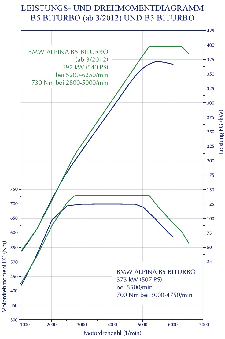 Nochmals spürbar bessere Fahrleistungen bietet der ebenfalls als Limousine und Touring erhältliche BMW Alpina B5 Biturbo, der neuerdings mit 540 PS starkem V8-Biturbo verkauft wird. Das maximale Drehmoment des überarbeiteten Triebwerks liegt bei 730 Newtonmeter und steht zwischen 2.800 und 5.000 U/min zur Verfügung.