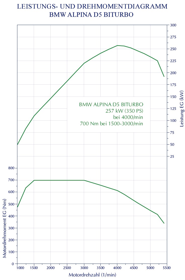 Auch in dieser Fahrzeugklasse bieten die Buchloer verschiedene Motorisierungen an, die souveräne Fahrleistungen ermöglichen und auf ihre eigene Art überzeugen können. Bis zum Verkaufsstart des neuen BMW M550d xDrive (F10/F11) am 12. Mai 2012 ist der BMW Alpina D5 Biturbo mit seinen 350 PS nicht weniger als der stärkste serienmäßige Sechszylinder-Diesel und auch nach dem Start des M550d bleibt er immerhin der stärkste Sechszylinder-Diesel, der auch mit Hinterradantrieb erhältlich ist.