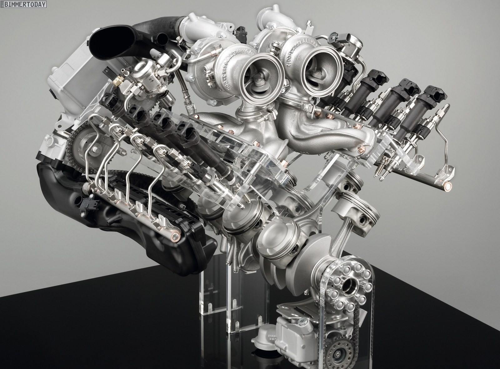 Auf derFrankfurter IAA im Jahr 2013 wird nach aktuellem Stand Porsche mit einer ähnlichen Lösung nachziehen: Beim Hybrid-Supersportwagen Porsche 918 Spyder wird das völlig neukonstruierte Triebwerk ebenfalls über im V liegende Abgaskrümmer und außenliegende Einlasssysteme verfügen. Der 4,6 l große Achtzylinder wird zwar nicht wie bei BMW durch eine Turboaufladung unterstützt, aber dafür durch zwei Elektromotoren.