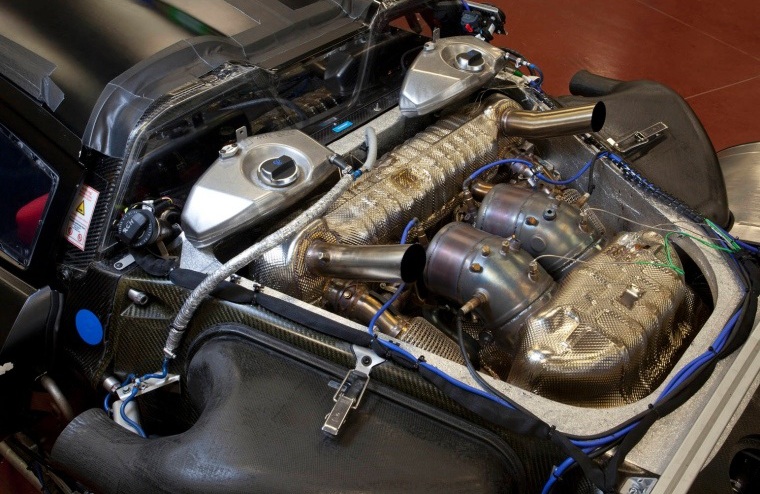 Die Schonung der temperaturempfindlichen Lithium-Ionen-Batterie ist bei Porsche auch der Grund für die umgedrehte Position von Ansaug- und Abgastrakt. Durch das Mittelmotorkonzept lässt sich die Abwärme leichter an die Umgebung abgeben als beim Frontmotor. Die Antriebseinheit des Benzinmotors muss wegen der E-Maschinen extrem kompakt bauen. Somit darf der Endschalldämpfer direkt hinter den Kopfstützen thronen.