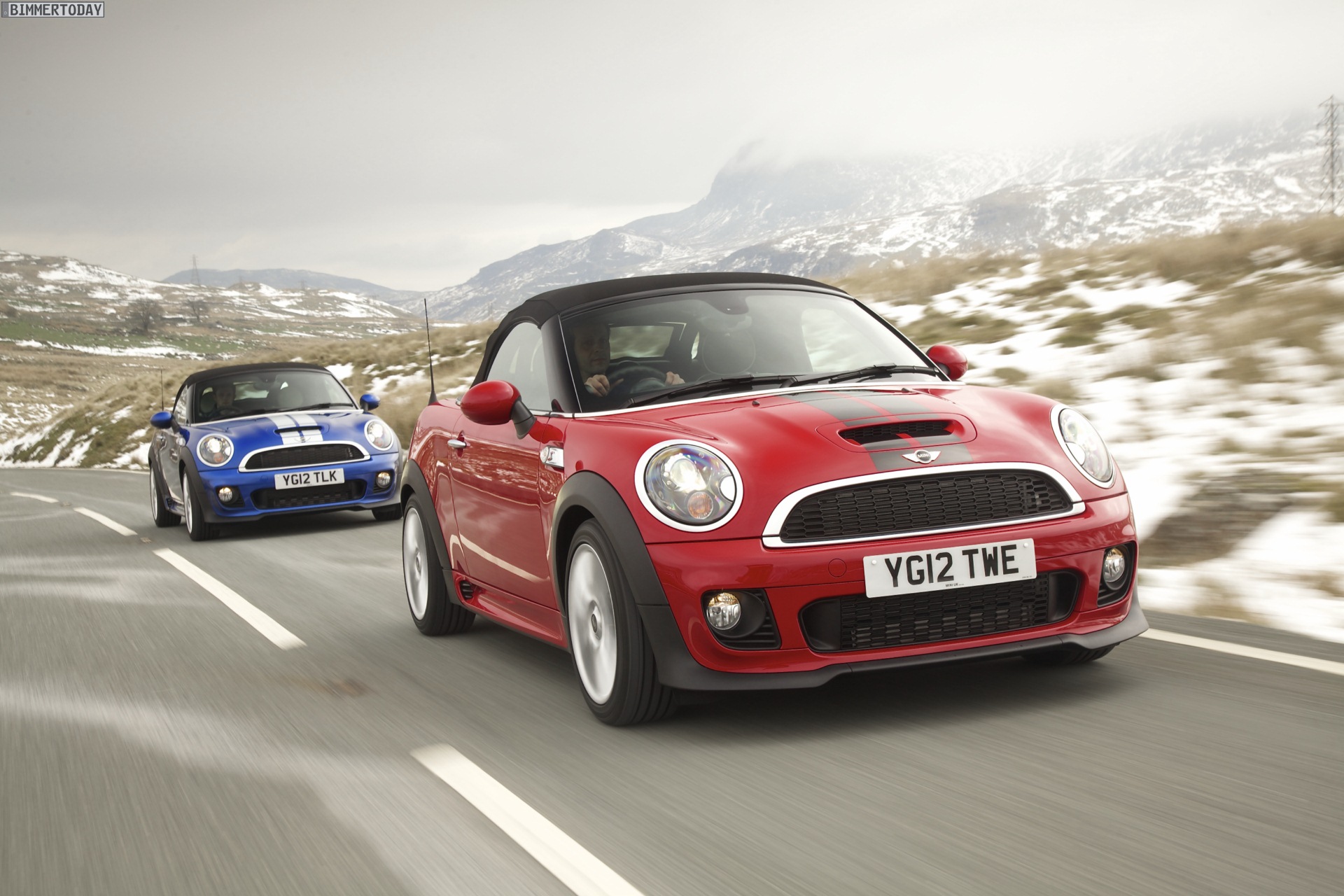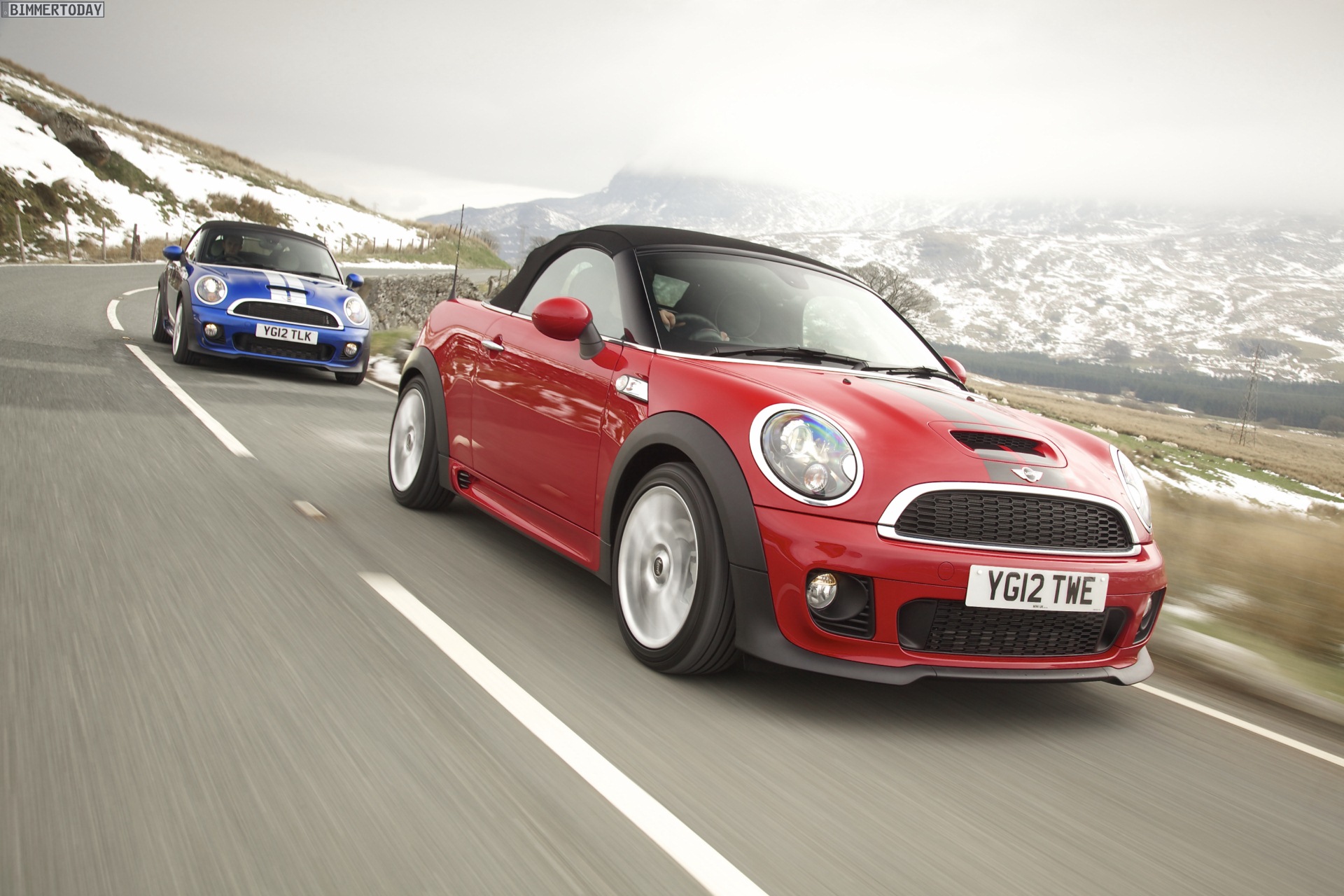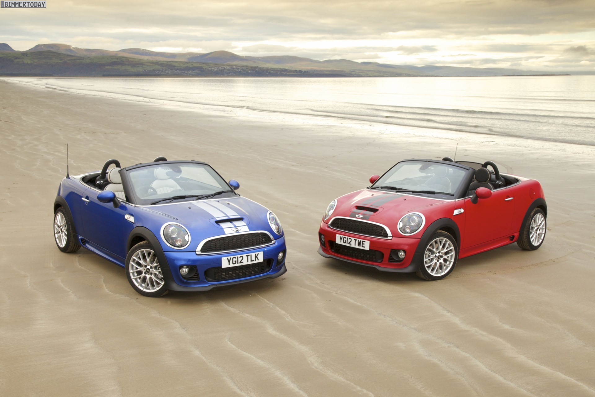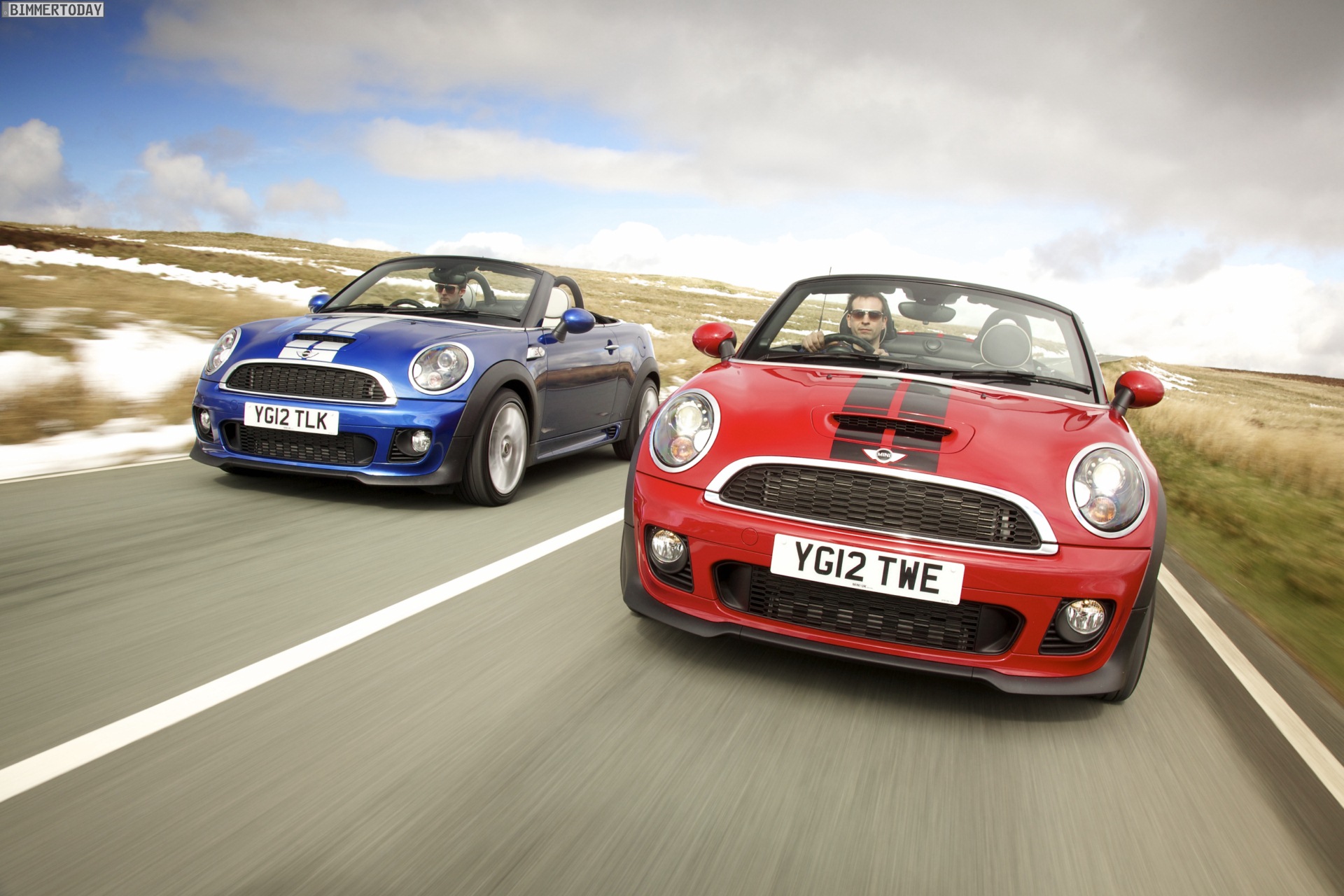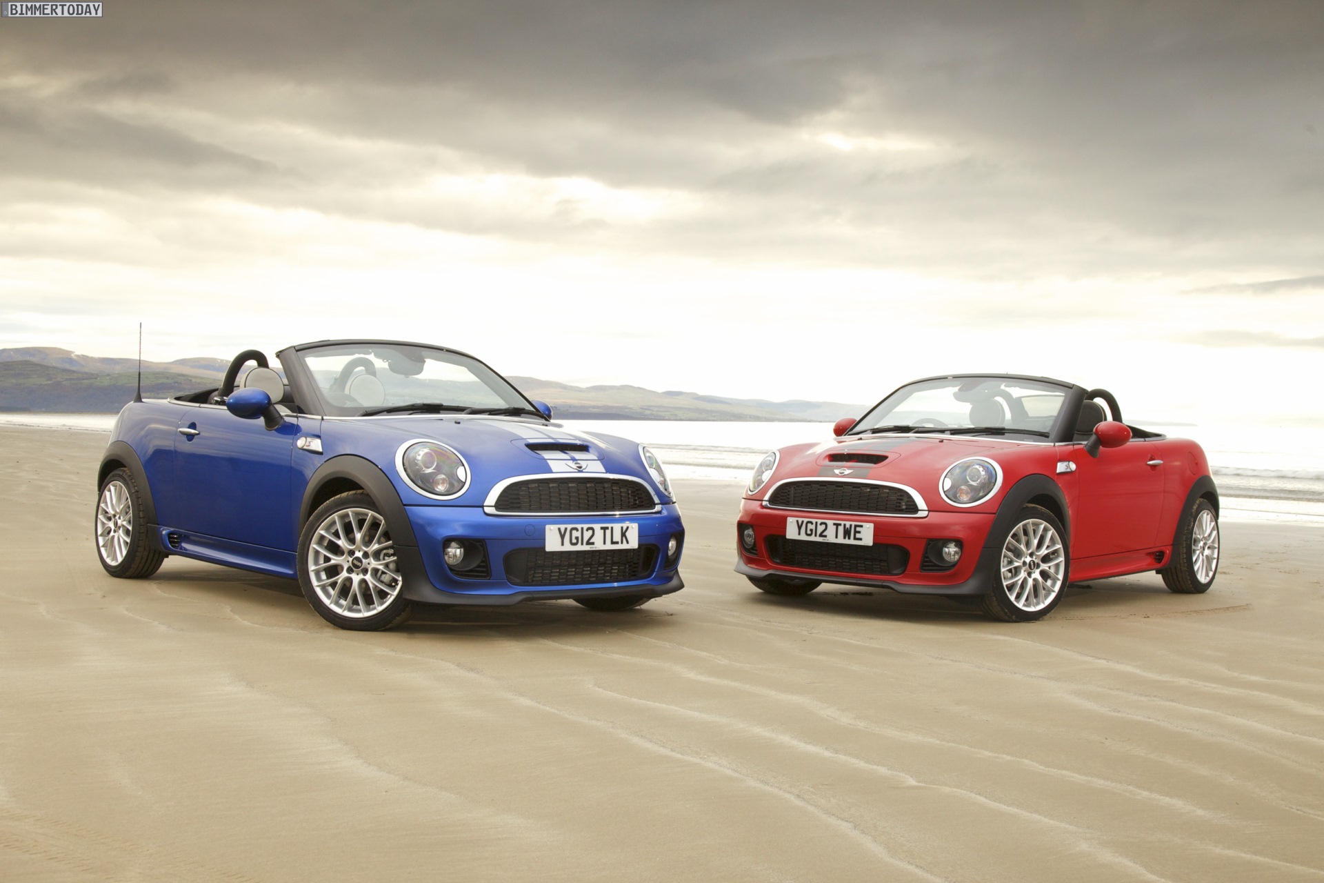 Zu sehen ist einerseits ein MINI Cooper S Roadster in Chili Red, der vom bekannten 1,6 Liter großen Turbo-Vierzylinder mit 184 PS angetrieben wird, andererseits wird ein blauer MINI Cooper SD Roadster mit 143 PS starkem Vierzylinder-Diesel in Szene gesetzt.