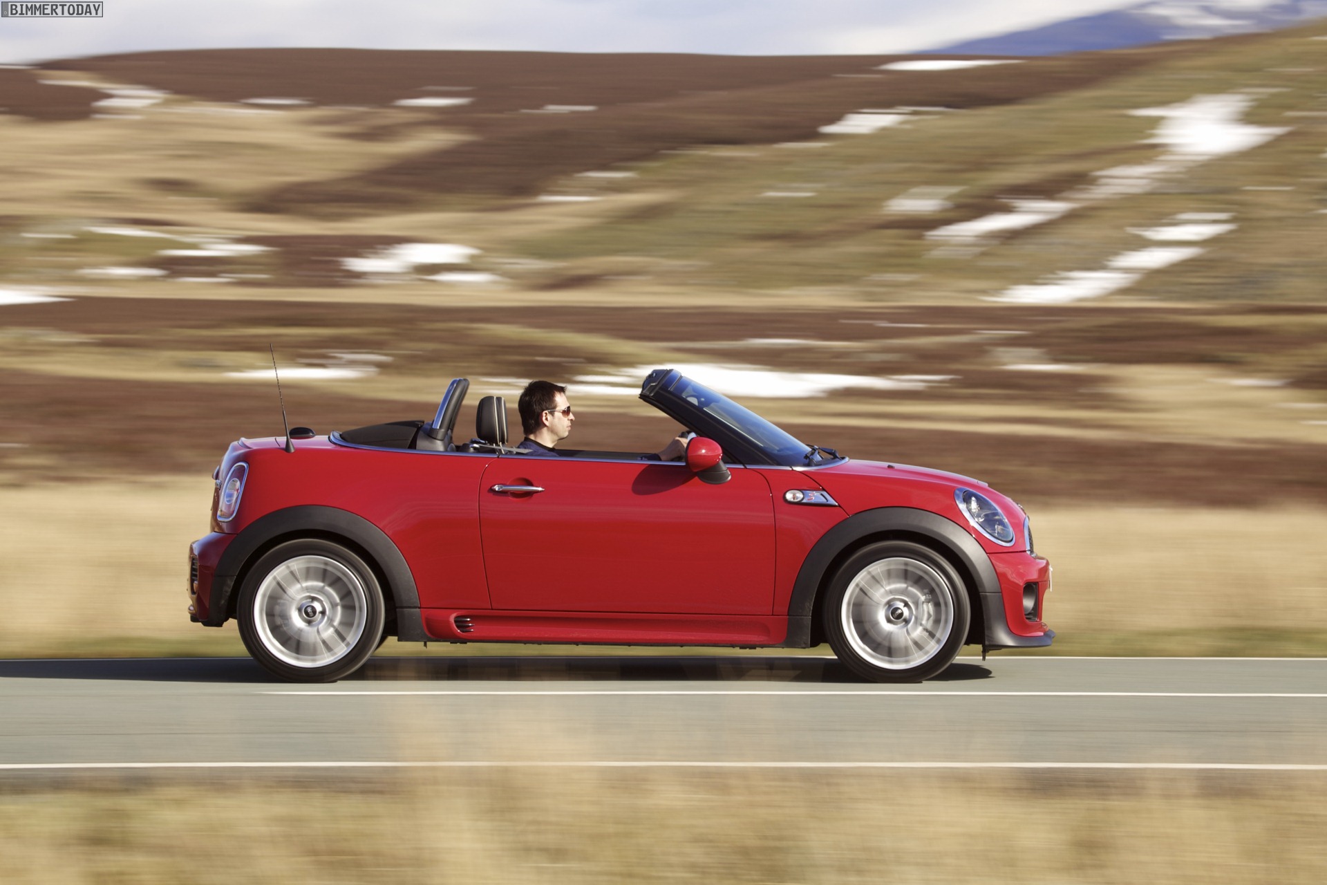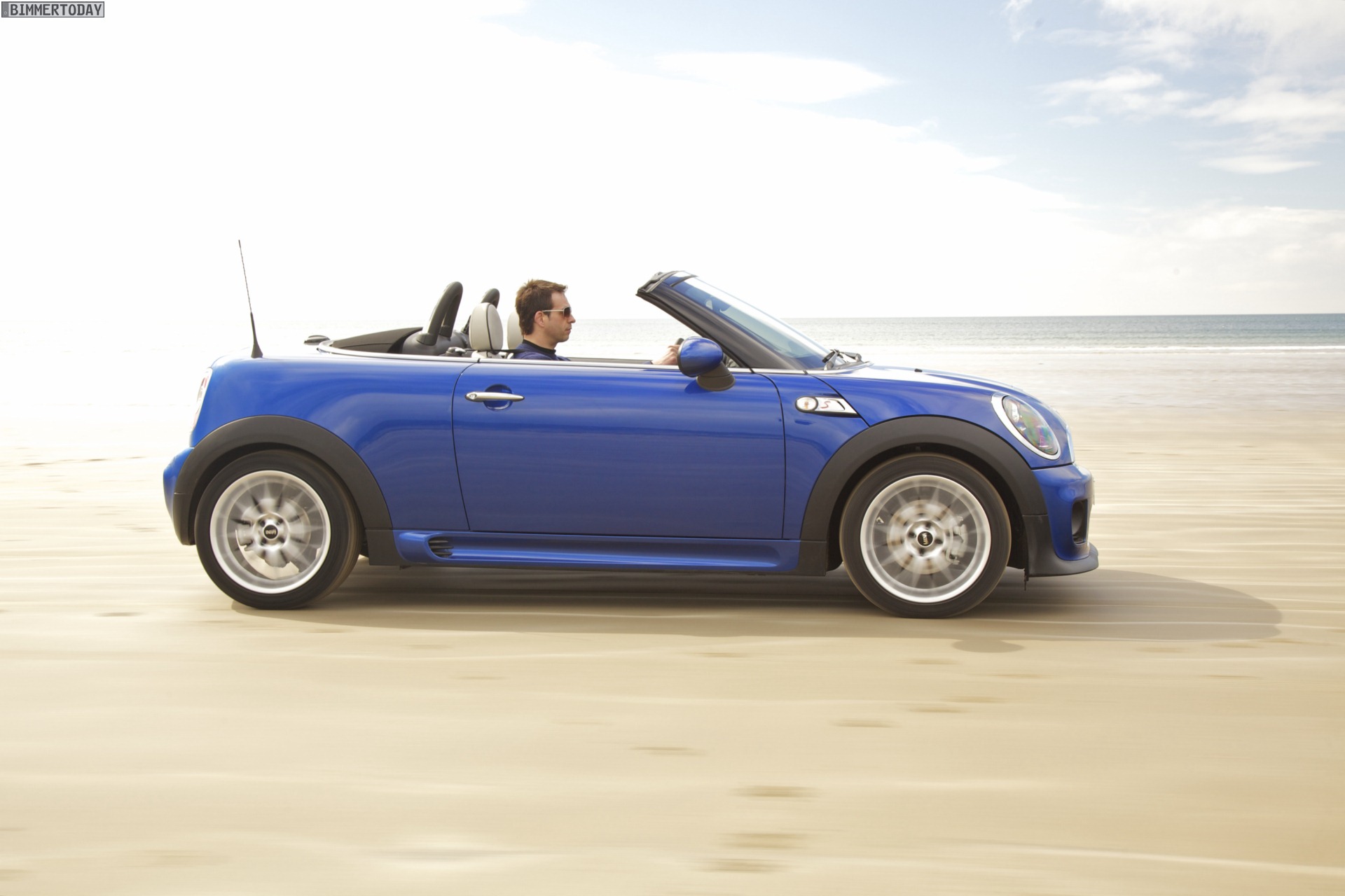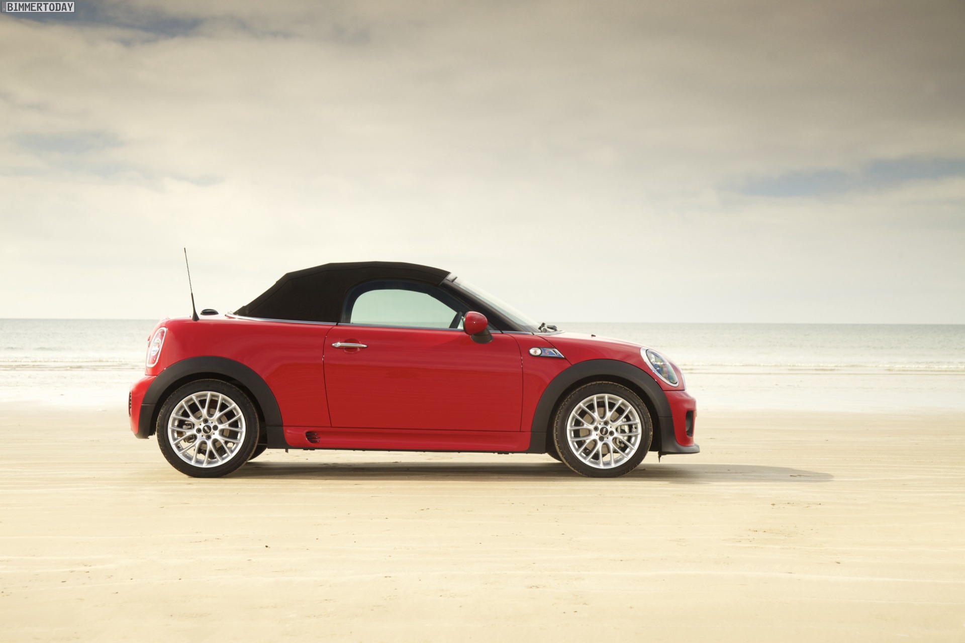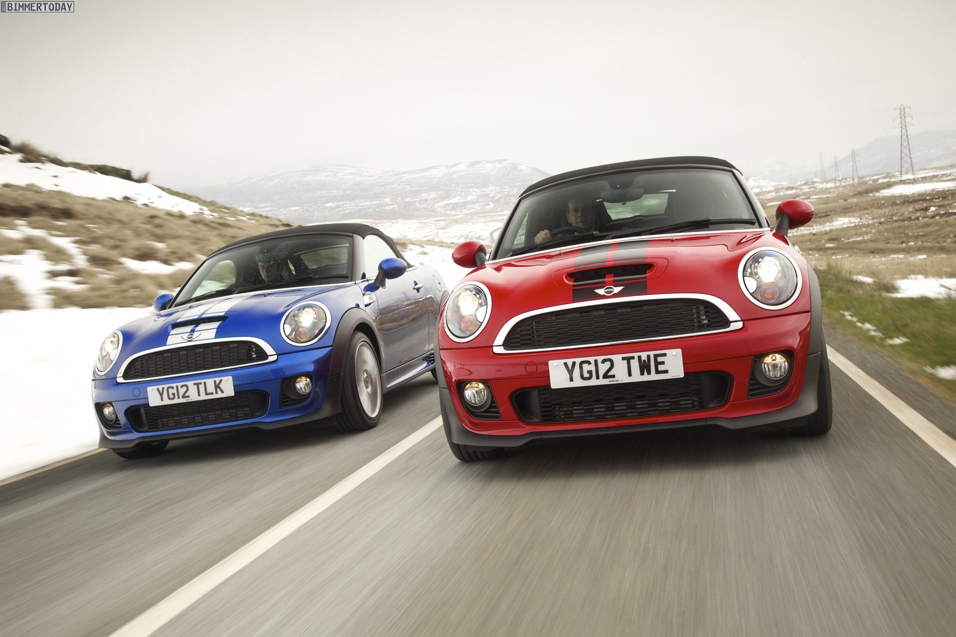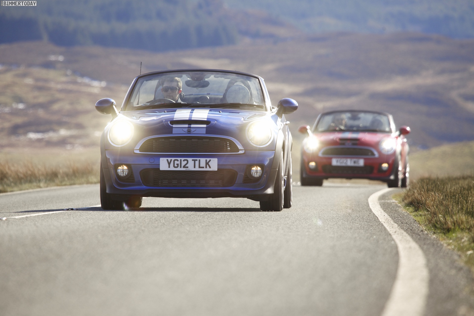 Zu sehen ist einerseits ein MINI Cooper S Roadster in Chili Red, der vom bekannten 1,6 Liter großen Turbo-Vierzylinder mit 184 PS angetrieben wird, andererseits wird ein blauer MINI Cooper SD Roadster mit 143 PS starkem Vierzylinder-Diesel in Szene gesetzt.