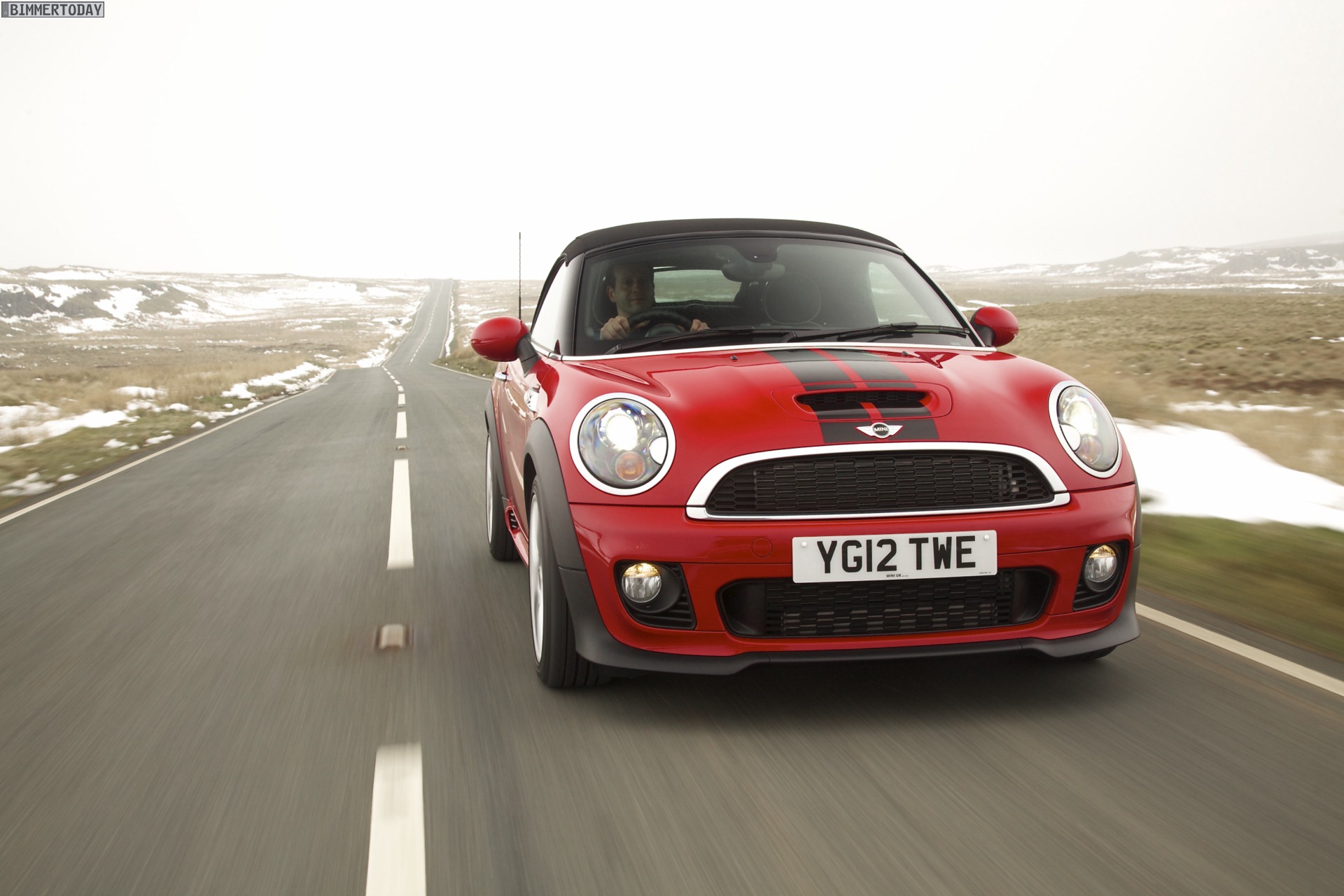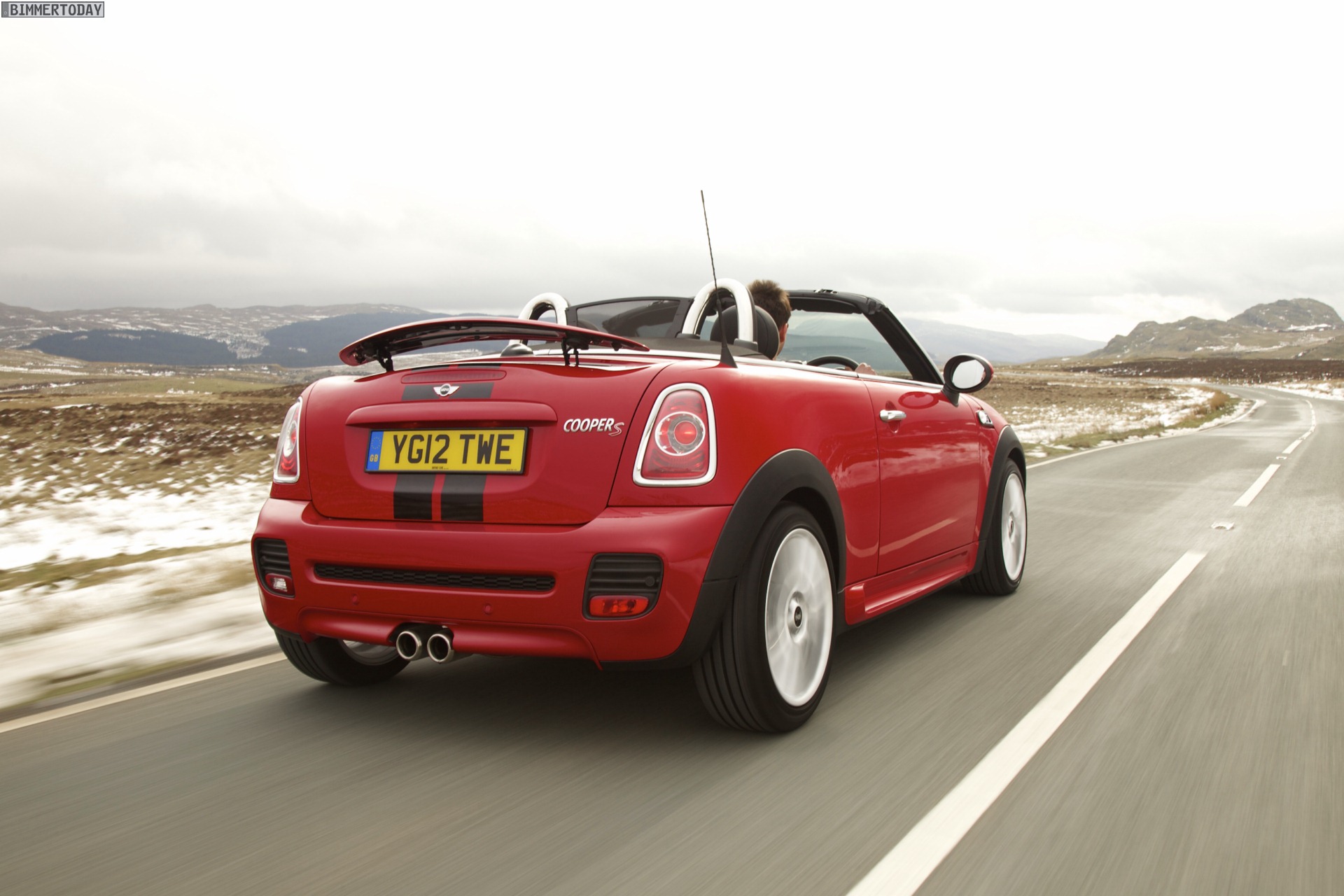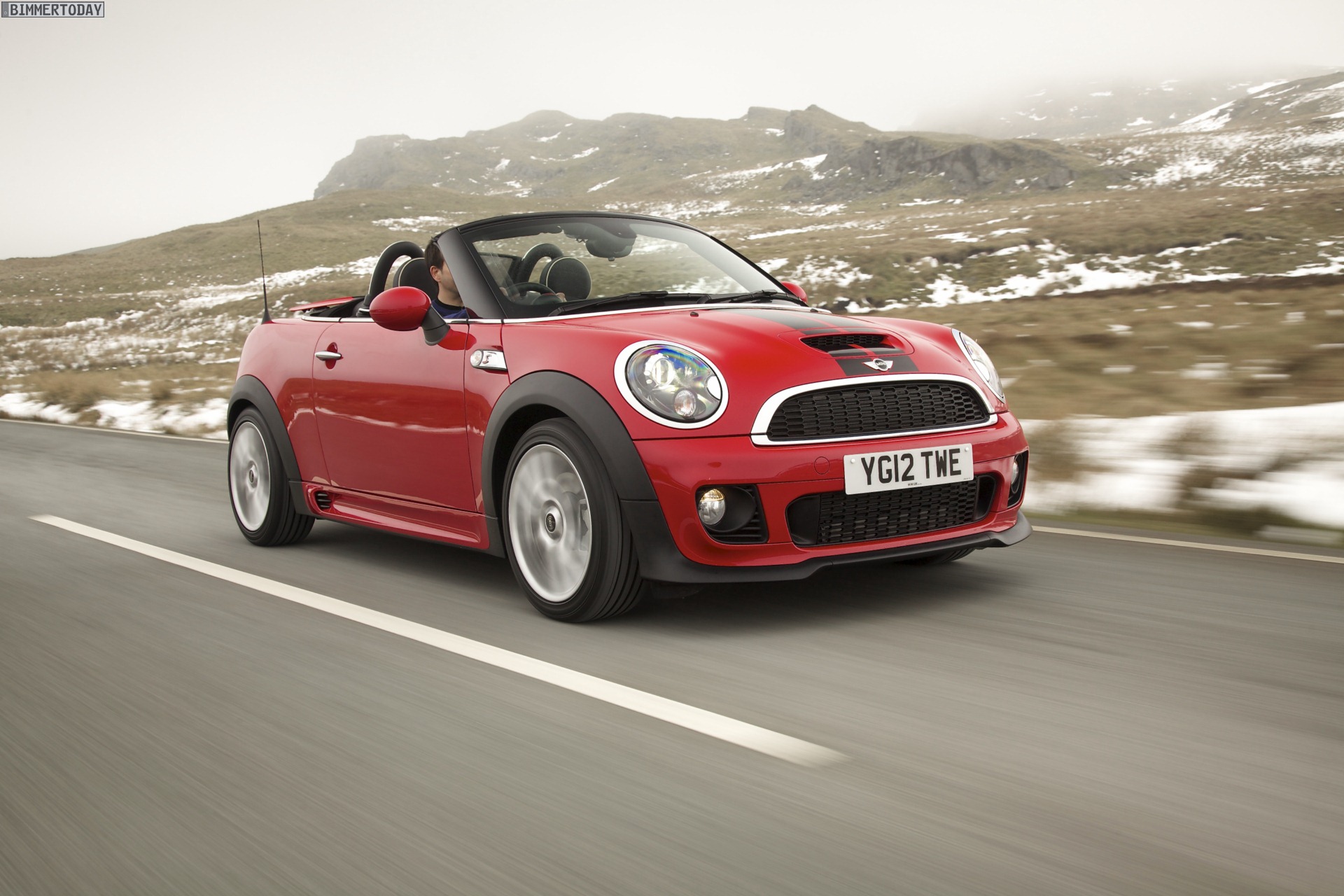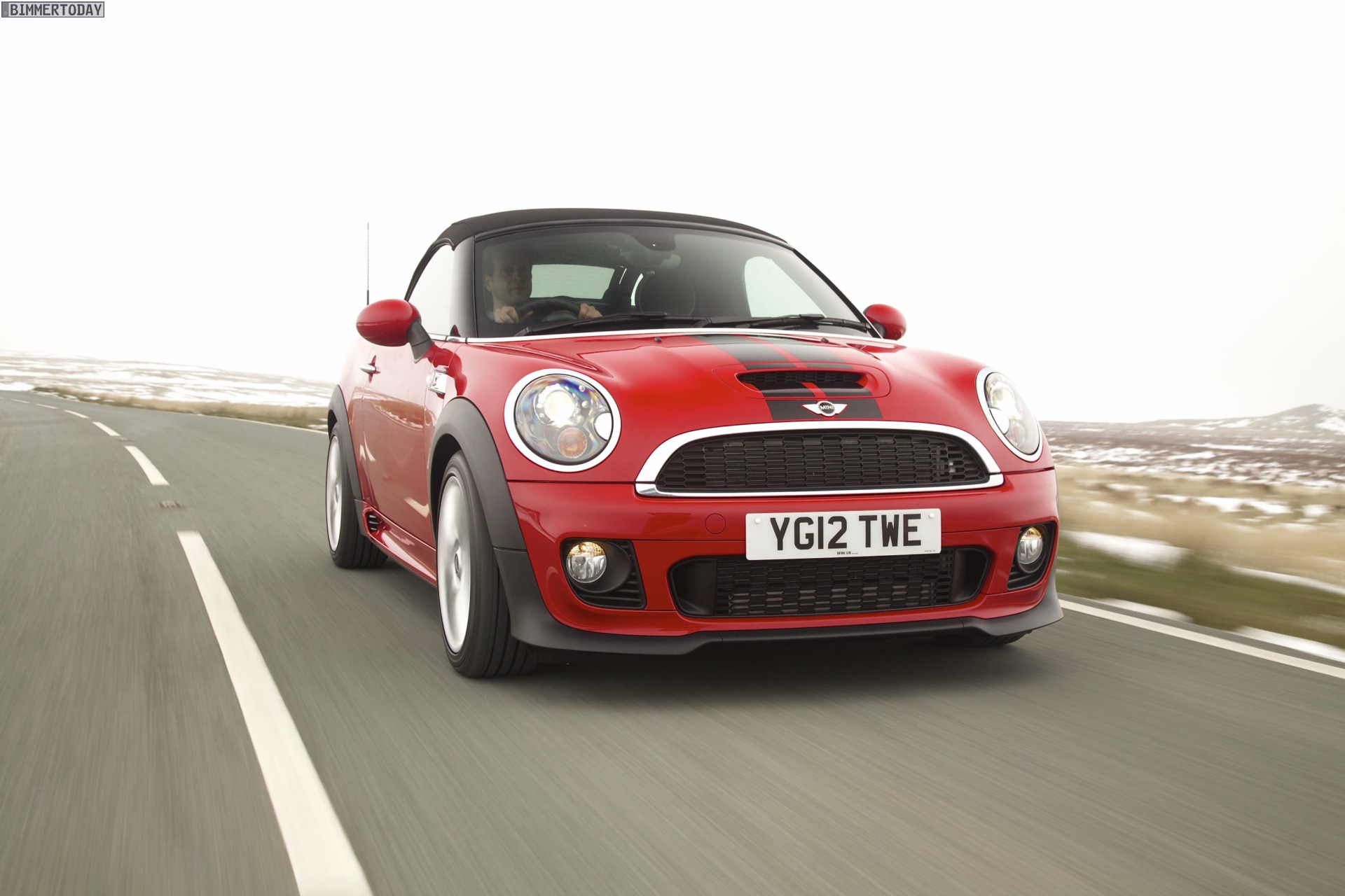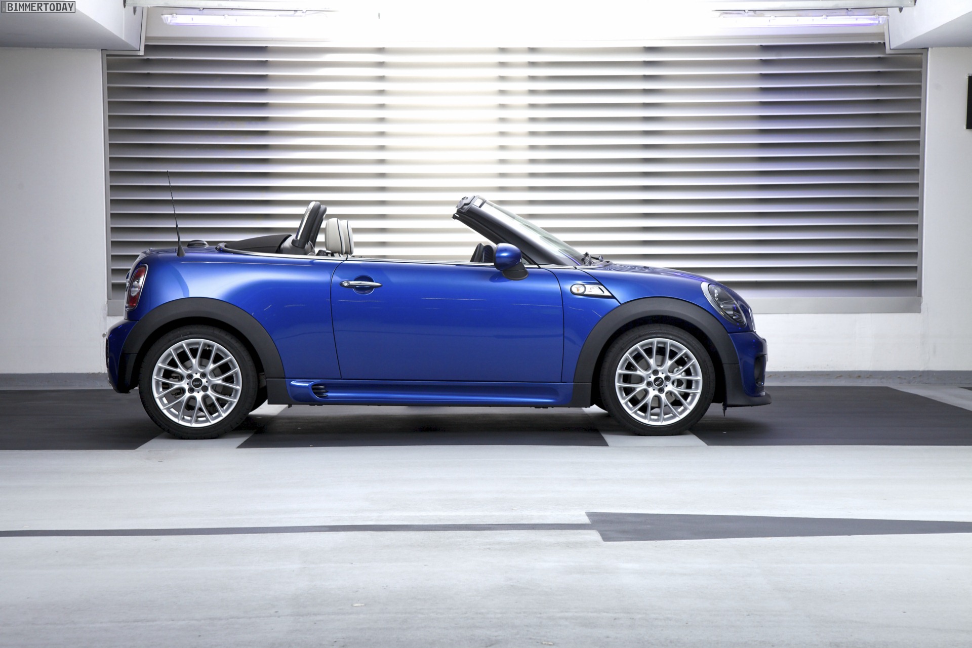 Zu sehen ist einerseits ein MINI Cooper S Roadster in Chili Red, der vom bekannten 1,6 Liter großen Turbo-Vierzylinder mit 184 PS angetrieben wird, andererseits wird ein blauer MINI Cooper SD Roadster mit 143 PS starkem Vierzylinder-Diesel in Szene gesetzt.