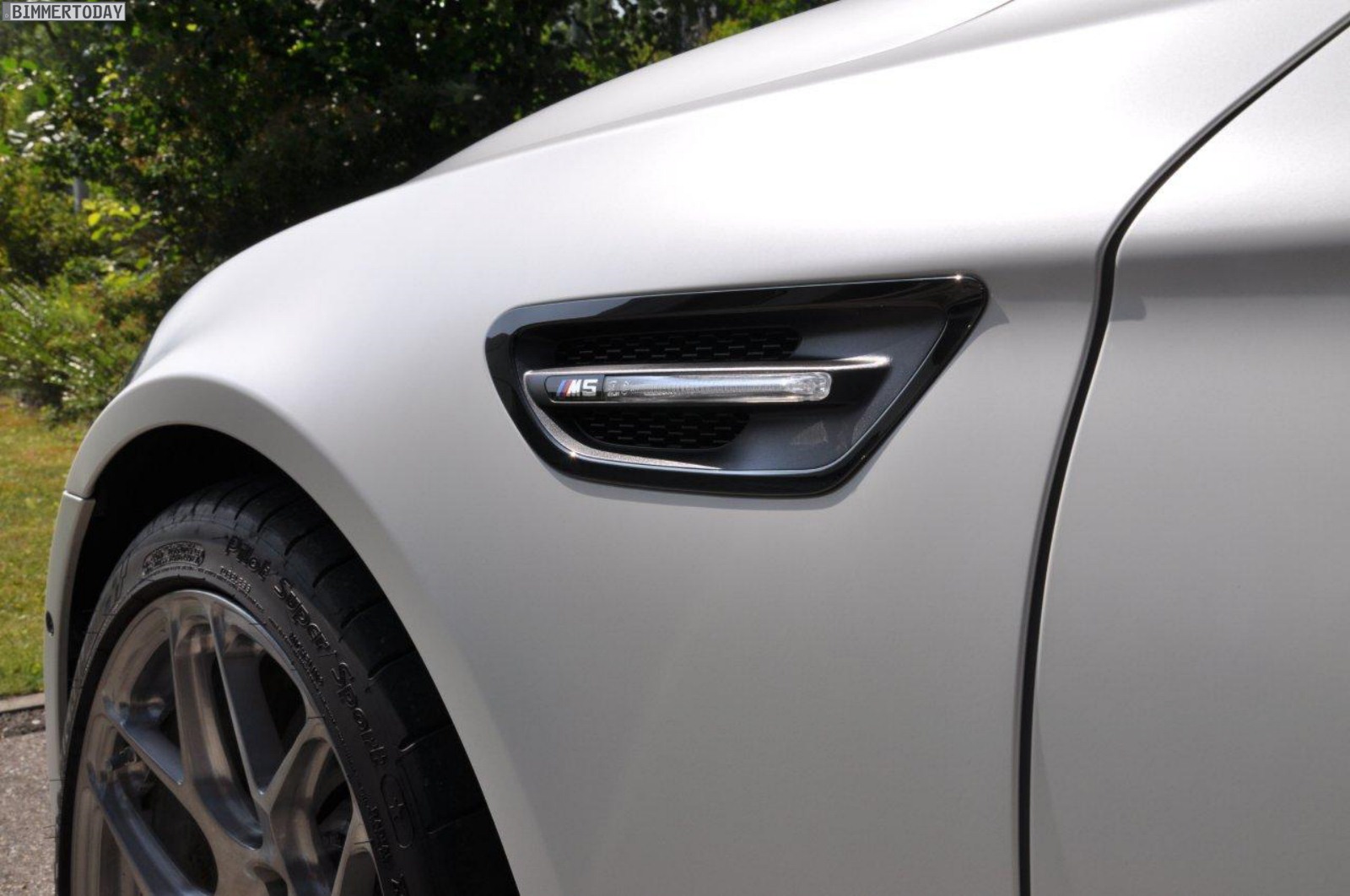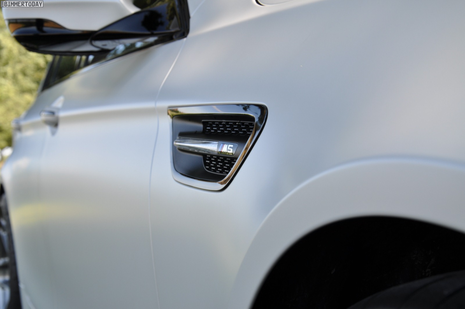 Den ganz besonderen Touch hat der M5 von Jürgen mit Hilfe von BMW Individual erhalten, denn die Limousine ist in der matten Sonderfarbe Frozen Brilliant White metallic lackiert, die unseren regelmäßigen Lesern bereits von der BMW M5 M Performance Edition für Großbritannien bekannt sein dürfte. Sämtliche ab Werk normalerweise in glänzendem Chrom ausgeführten Elemente, angefangen von den Nieren über die Kiemen und Auspuffendrohre bis hin zu den Türspangen sind in Chrom dunkel ausgeführt und setzen so starke Akzente zur hellen Fahrzeuglackierung.