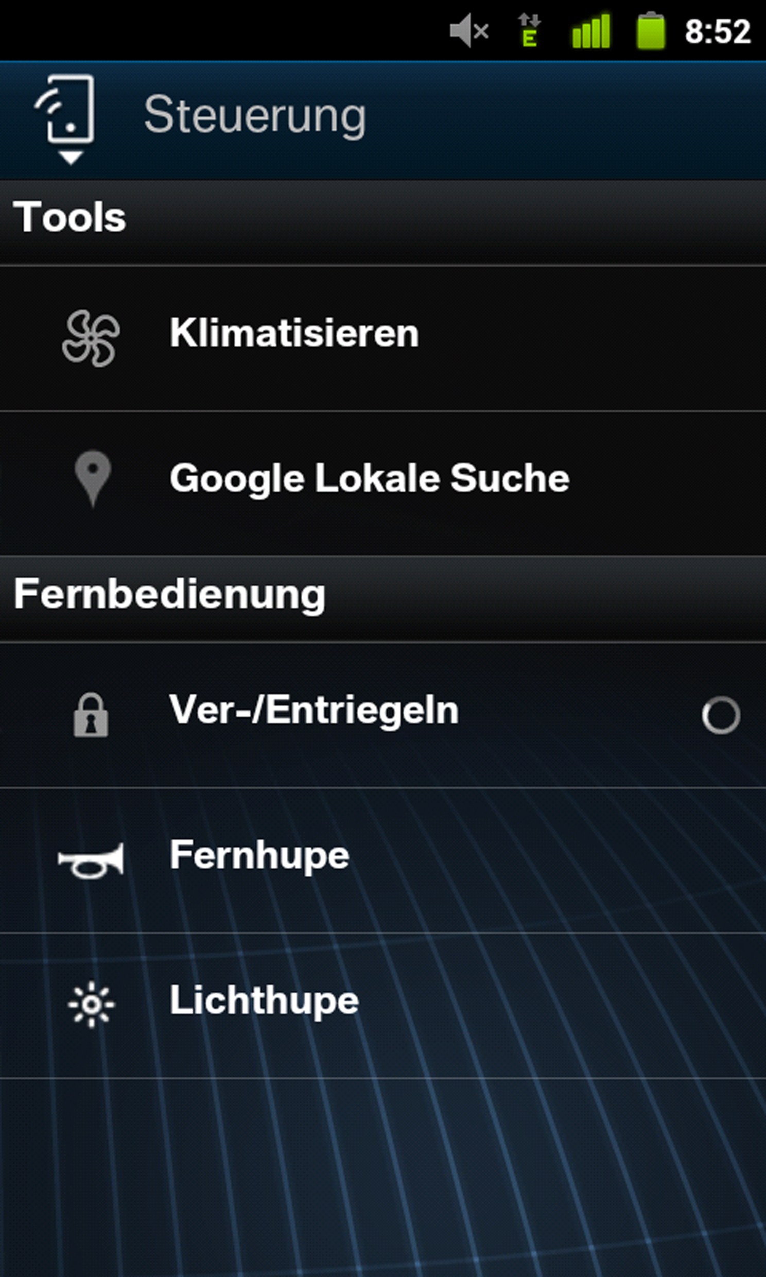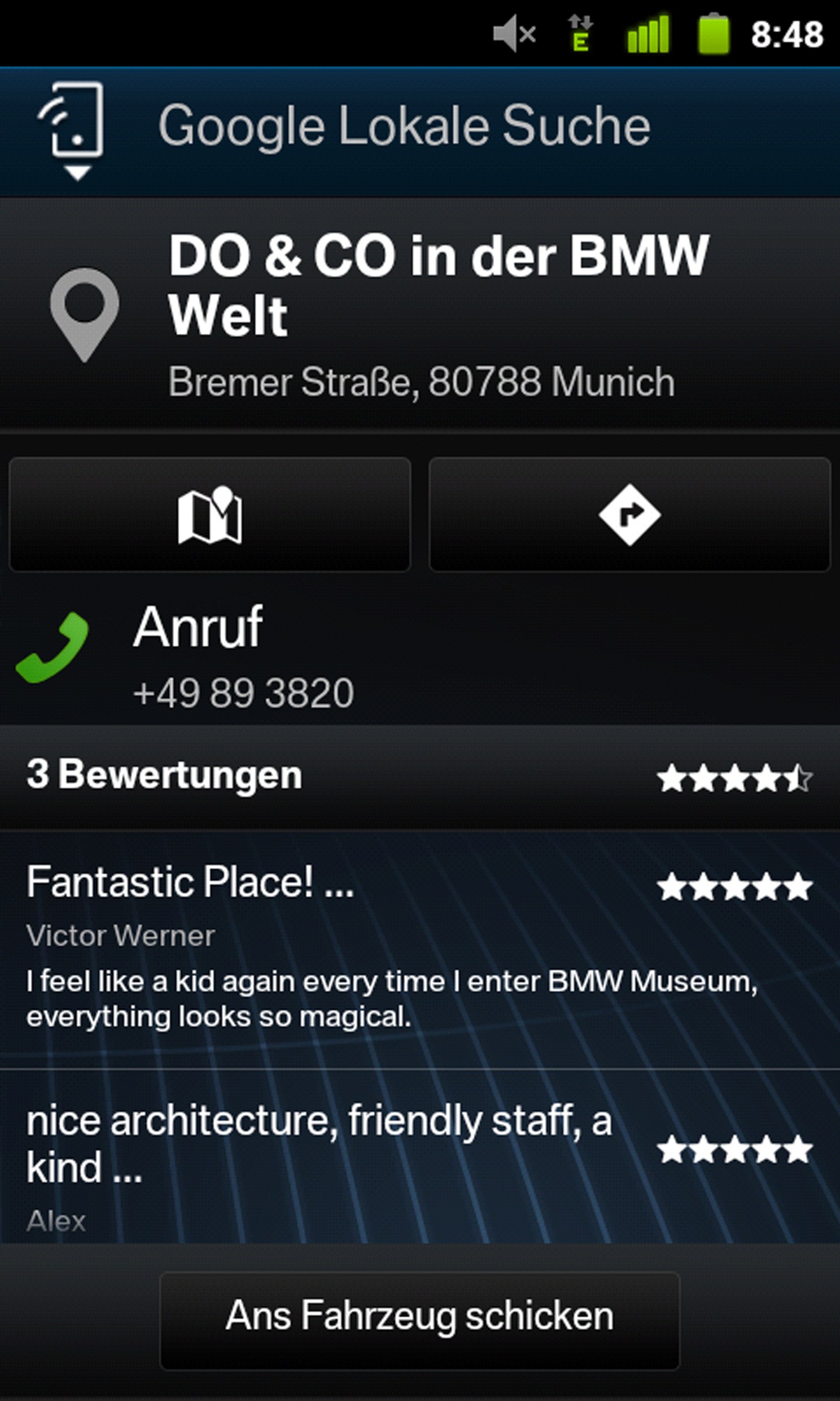 Wie mit dem iPhone lässt sich nun also auch mit einem Android-Smartphone die Hupe oder Lichthupe auslösen, die Klimatisierung des Fahrzeugs starten, das Fahrzeug lokalisieren und die Zentralverriegelung öffnen oder schließen. Mit Hilfe der lokalen Suche von Google können außerdem POIs im Umkreis gesucht und als Ziel ins Navigationssystem des Fahrzeugs übertragen werden.