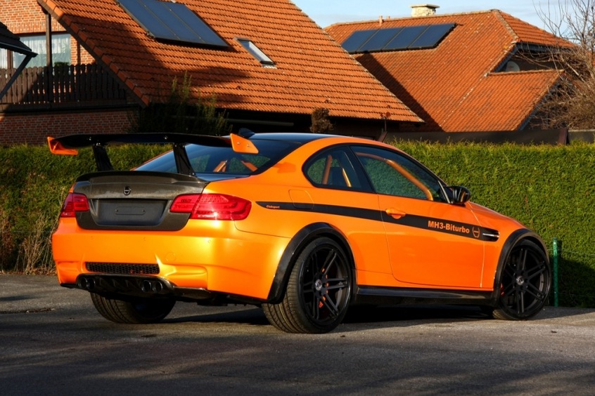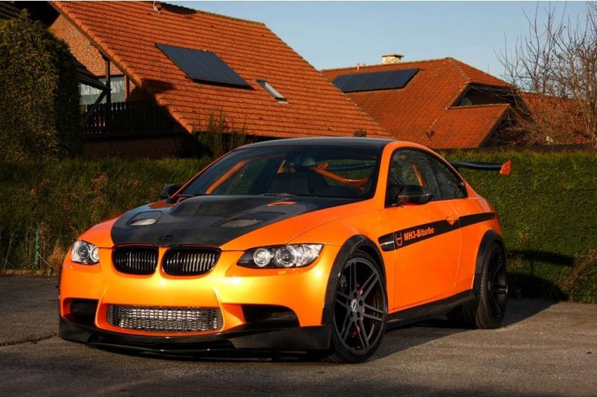 Dank Gewindefahrwerk und üppig dimensionierter Bremsanlage von Movit lässt sich die Kraft des Manhart MH3 V8 RS Clubsport zumindest von Könnern gut beherrschen. Für maximale Aufmerksamkeit sorgt neben dem Sound auch die Lackierung in leuchtendem Orange, die durch den aufwendigen Karosserie-Umbau mit zahlreichen Carbon-Komponenten noch betont wird.