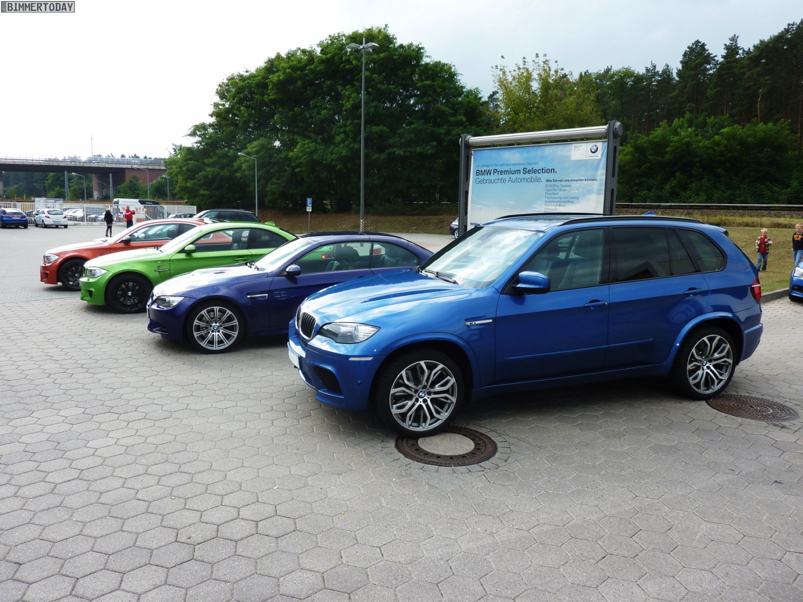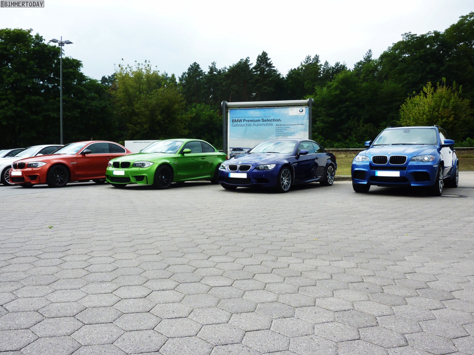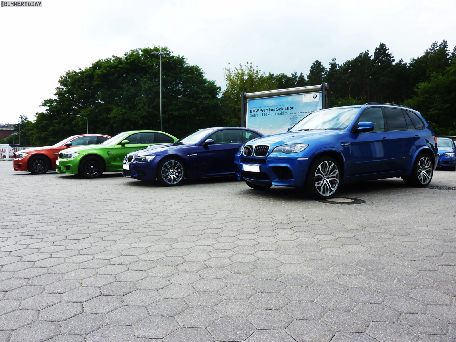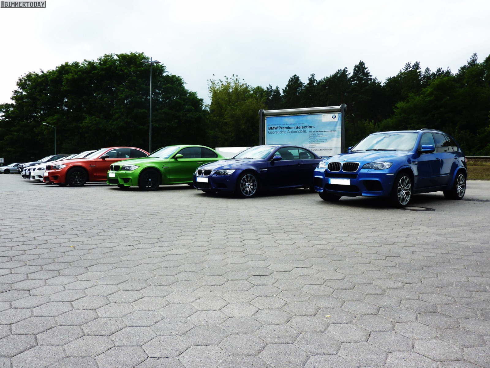 Auffälligstes Fahrzeug war die Green Mamba in Javagrün Metallic, die inzwischen ohne ihre bei der Übergabe noch vorhandenen schwarzen Streifen unterwegs ist und außerdem dunklere Heckleuchten trägt. Ebenfalls zu sehen waren unter anderem ein BMW M3 Cabrio E93 in Velvet Blue metallic, ein BMW X5 M in Estorilblau und ein weiteres BMW 1er M Coupé in Valencia Orange mit einigen Carbon-Elementen.