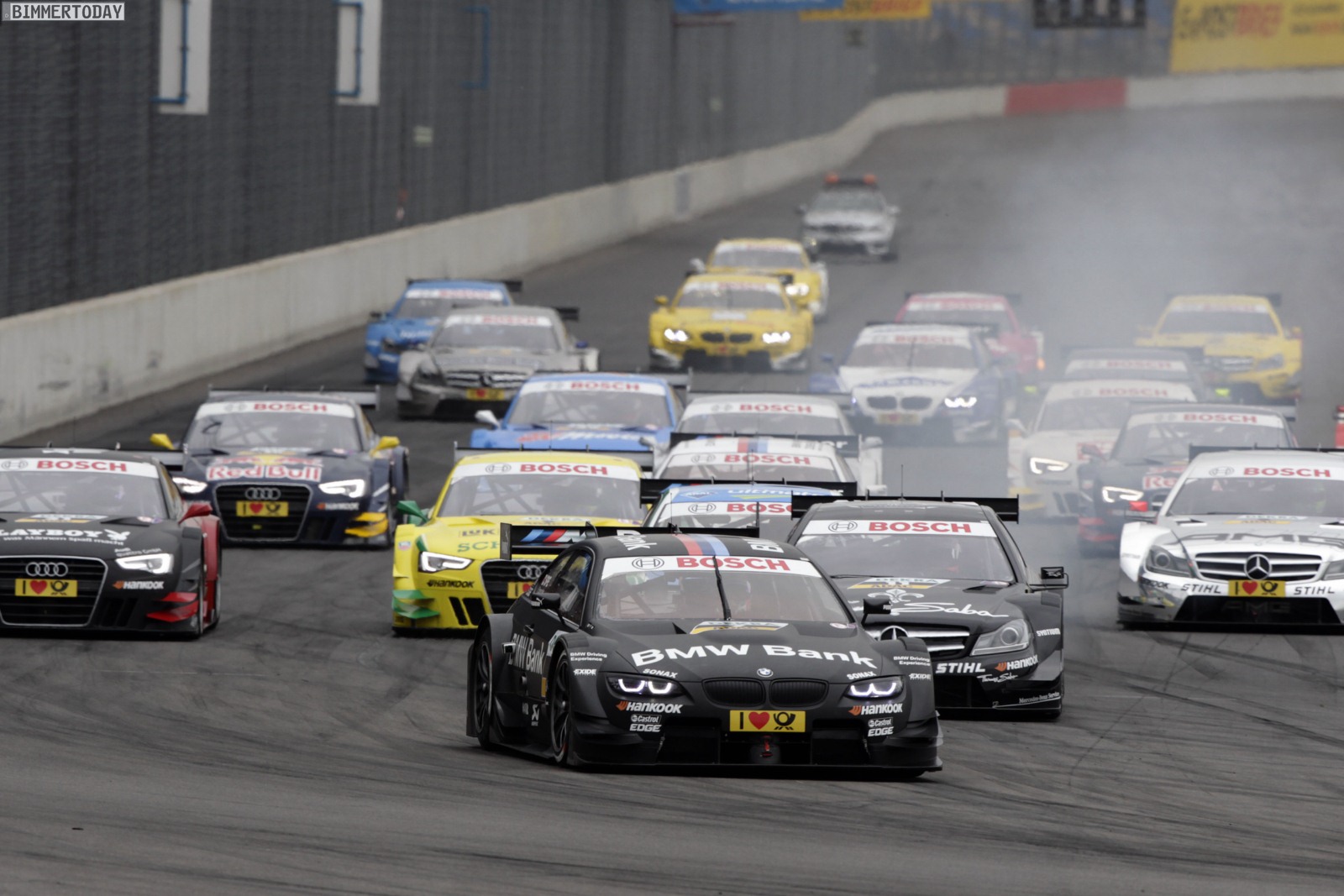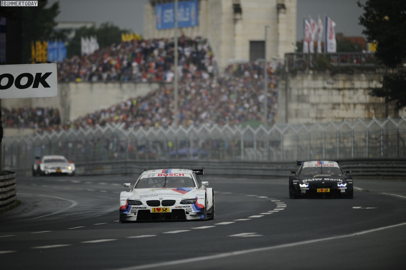 Norisring (DE), 1. Juli 2012: Dramatischer Endspurt in Nürnberg (DE). Martin Tomczyk schnuppert schon an seinem ersten Sieg für BMW, doch in der allerletzten Kurve zieht der von hinten heranstürmende Jamie Green noch vorbei und siegt hauchdünn. Bruno Spengler wird bei schwierigen Wetterbedingungen Dritter. Gary Paffett biegt von der Poleposition als Erster in die erste Kurve ein, wird jedoch in Folge einer Massenkarambolage, von der auch Augusto Farfus betroffen ist, ans Ende des Feldes zurückgeworfen. Von dort kommt er trotz allem noch auf Platz vier nach vorn. Dirk Werner holt als Zehnter seinen ersten DTM-Punkt.