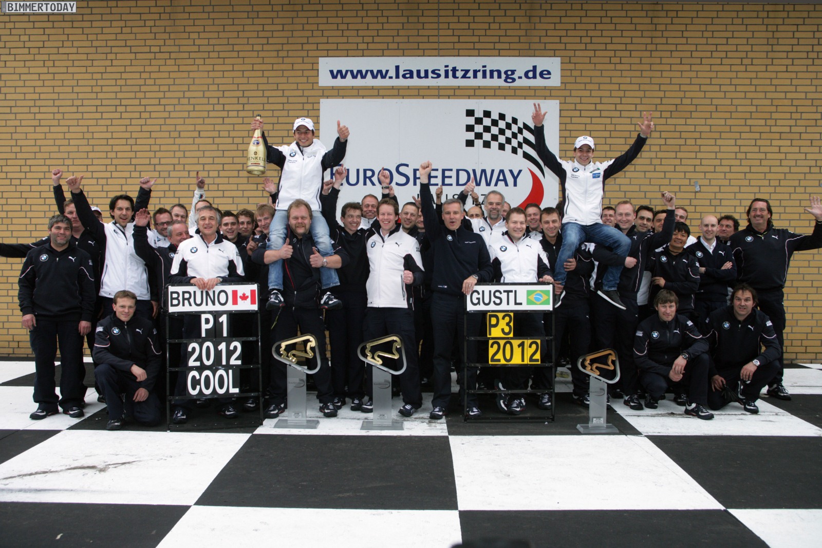Lausitzring (DE), 6. Mai 2012: Schon im zweiten Rennen der Comeback-Saison gelingt BMW der Paukenschlag. Bruno Spengler stellt seinen BMW Bank M3 DTM erst auf die Poleposition und fährt dann im Rennen den Sieg nach Hause. Gary Paffett liefert ihm einen harten Kampf und wird Zweiter. Augusto Farfus (BR) sorgt als Dritter in seinem erst zweiten DTM-Rennen für eine Überraschung, nachdem er schon im Qualifying als Zweiter hat aufhorchen lassen. Er hält Jamie Green das gesamte Rennen hinter sich. Martin Tomczyk holt als Siebter seine ersten Punkte im BMW Overall.