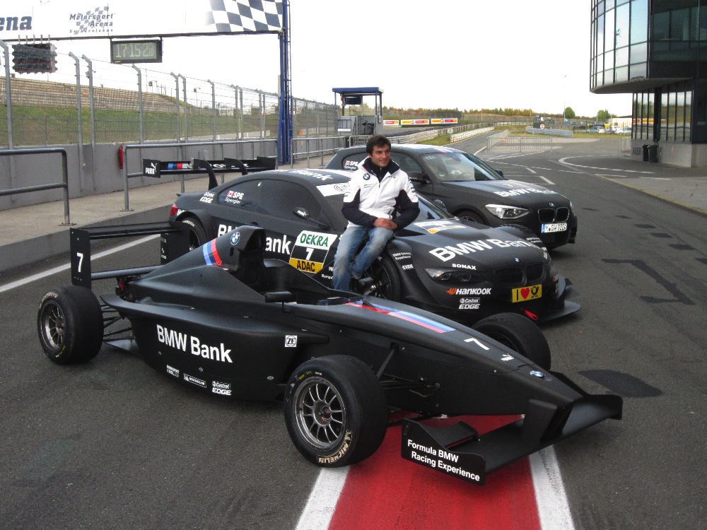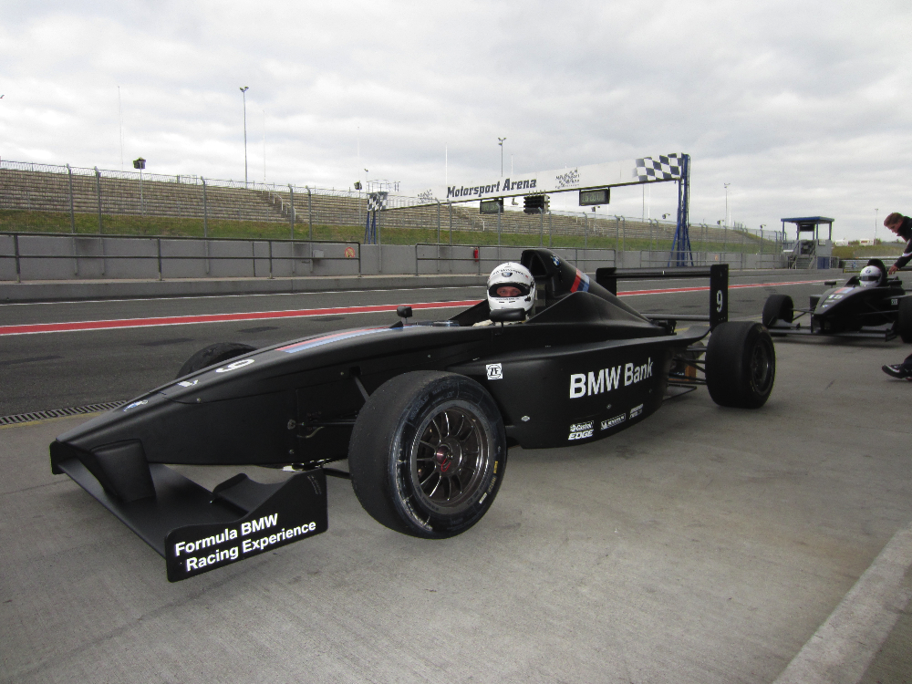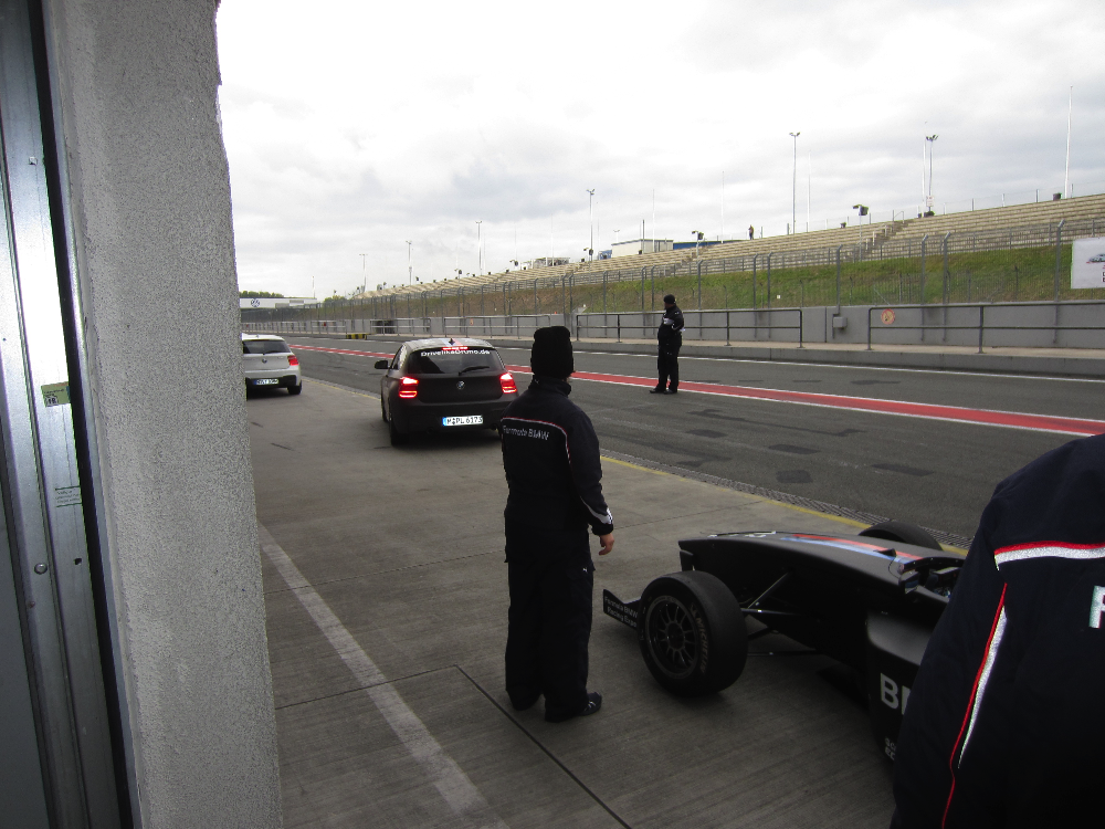 Danach ging es uns als Teilnehmern richtig an den Kragen: Nach einer ausführlichen Einweisung zum Umgang mit einem Formel BMW-Rennwagen, durften wir in die Kleiderkammer und wurden in die Rennanzüge gestopft. Danach durften wir in den Rennwagen Platz nehmen und erleben, was mit einem solchen Fahrzeug möglich ist. Nach einigen geführten Runden war das Erlebnis Formel-Auto leider auch schnell vorbei.