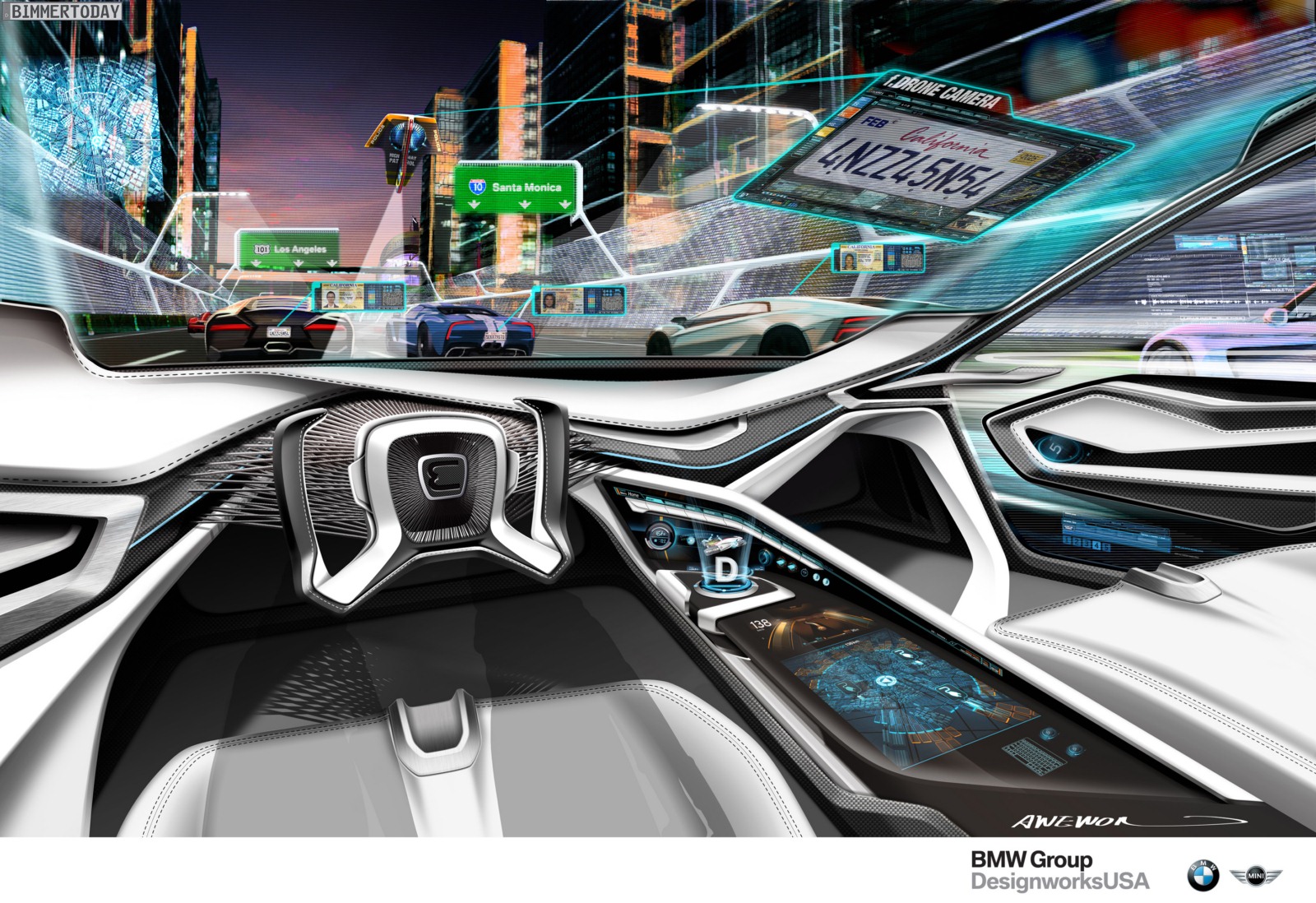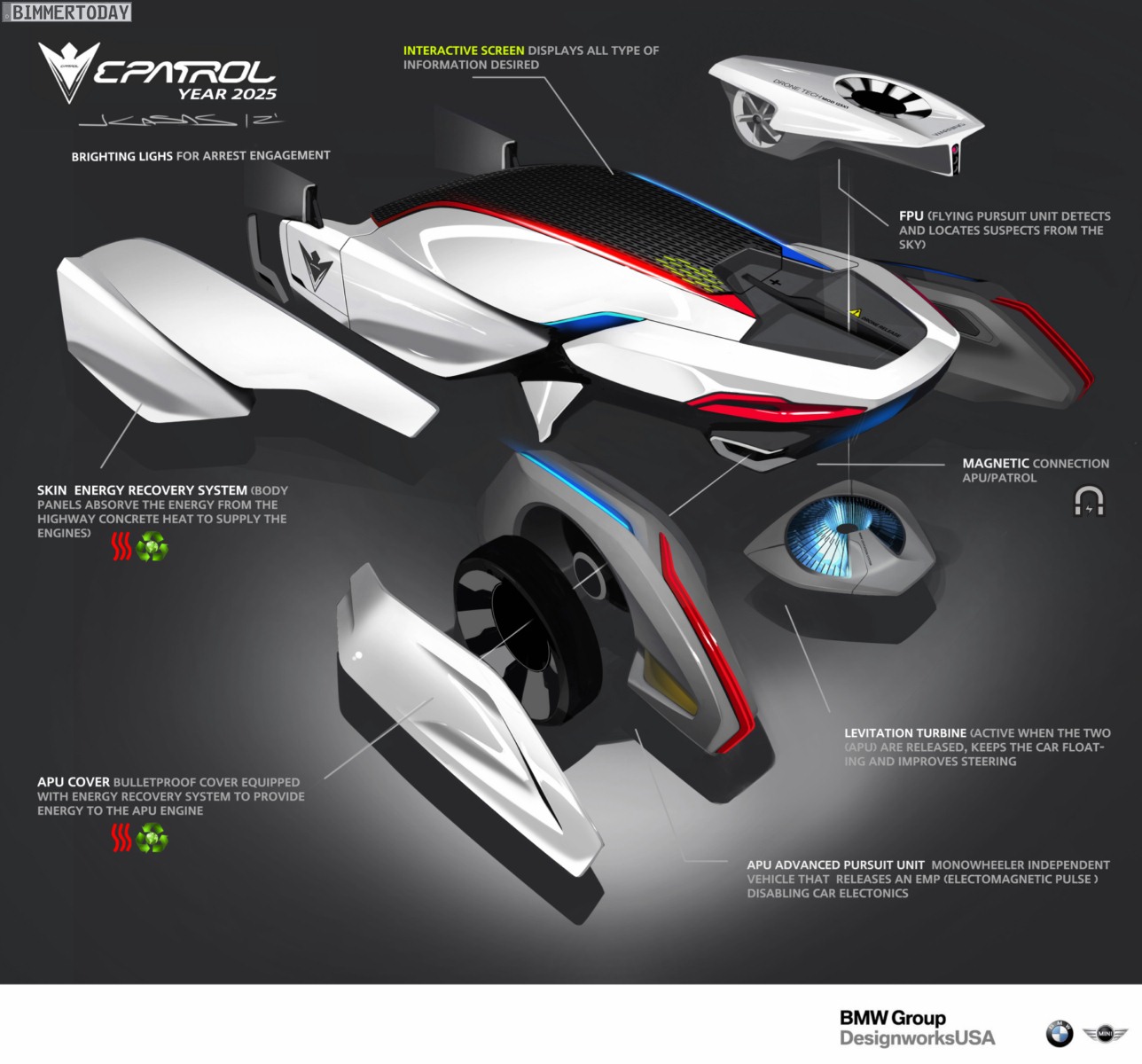 Das Highway Patrol Vehicle hört auf den Namen BMW ePatrol und besteht aus vier getrennt nutzbaren Elementen: Neben einem Basisfahrzeug für zwei Personen gibt es auch drei Drohnen, die den Sheriffs insbesondere bei unübersichtlichen Verfolgungsjagden nützliche Dienste erweisen können. Während zwei der Drohnen auf einem Rad fahren können und sich so für die Verfolgung von Fahrzeugen eignen, kann die dritte Drohne aus der Luft einen Blick auf die Gesamtsituation werfen.