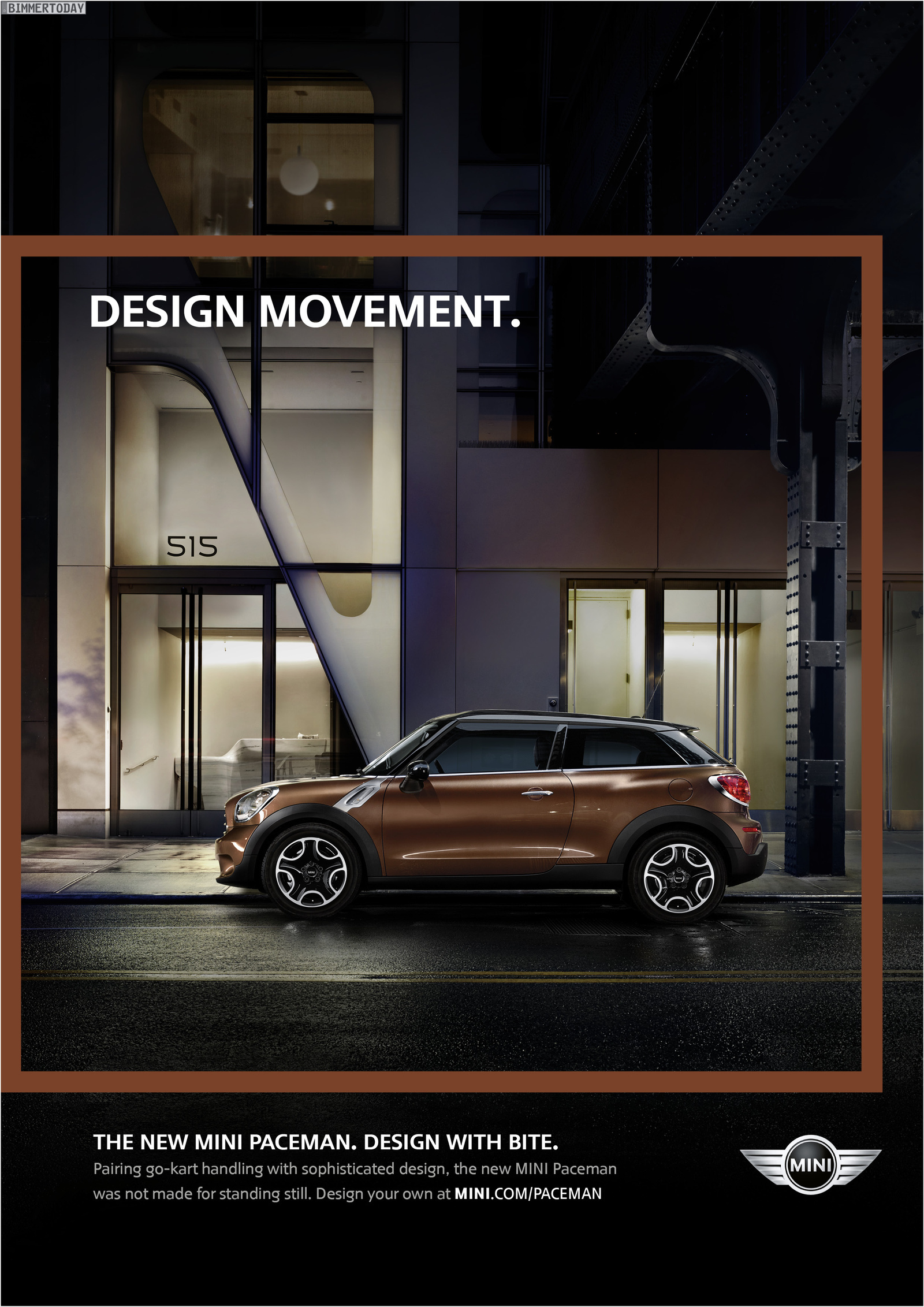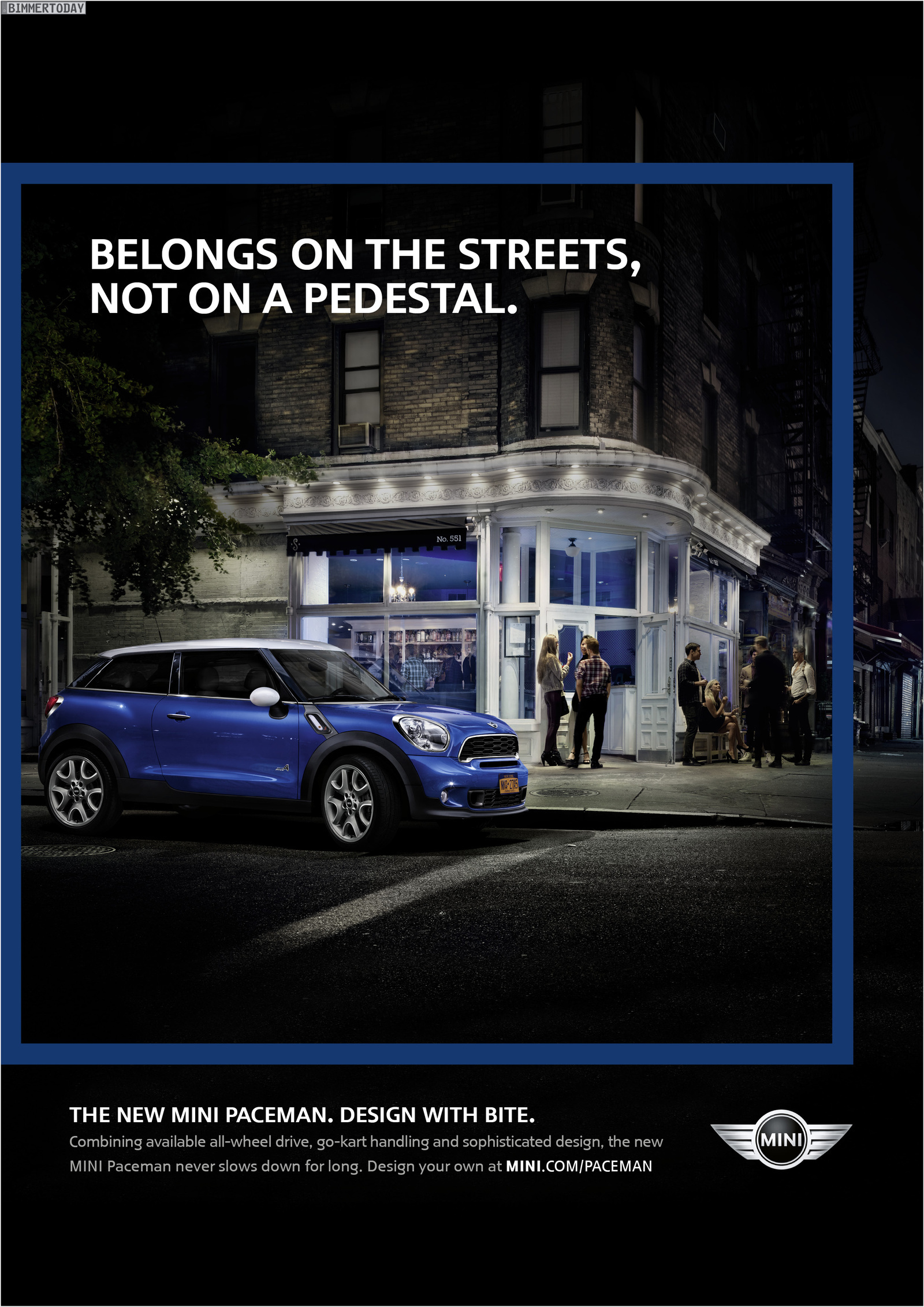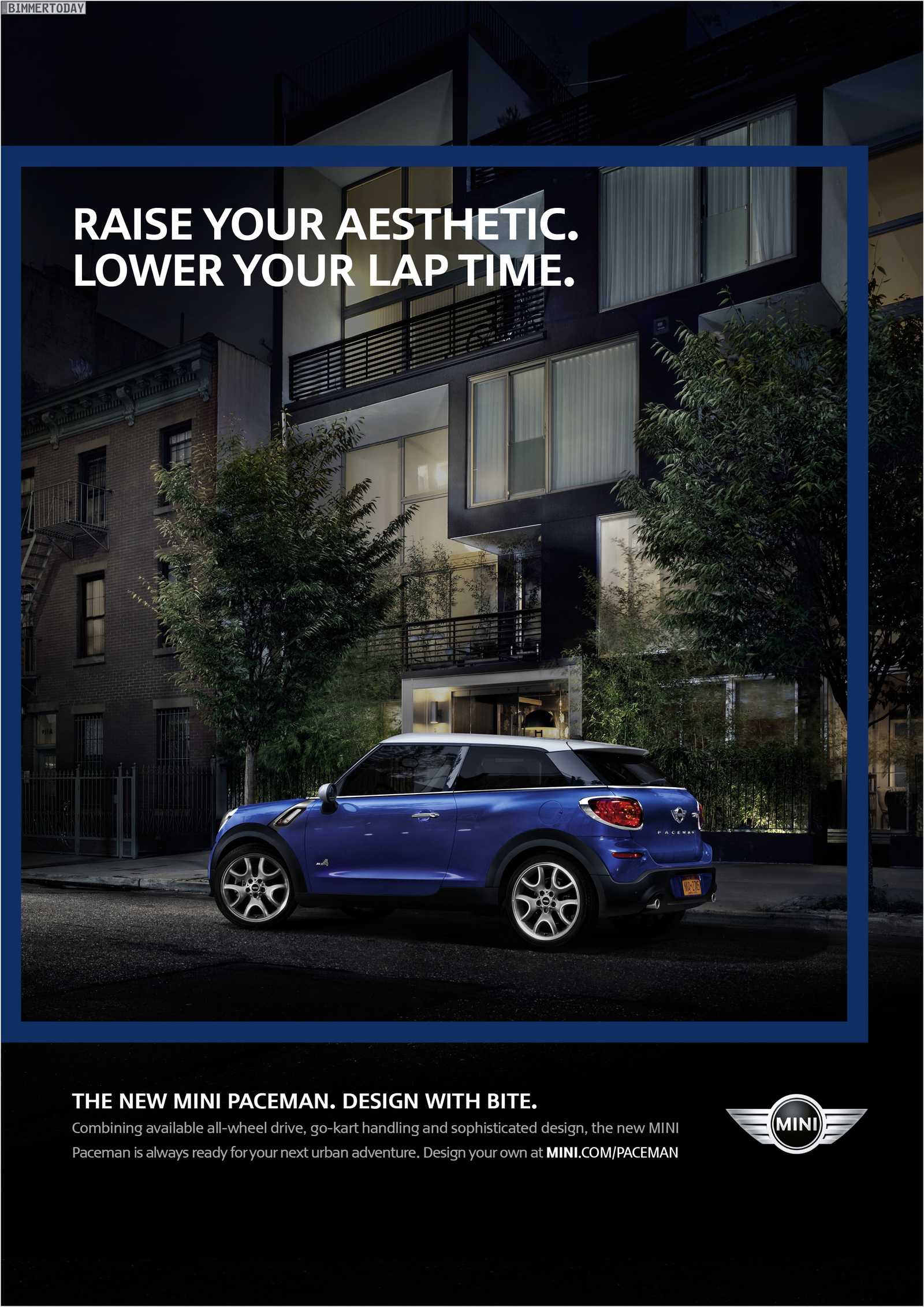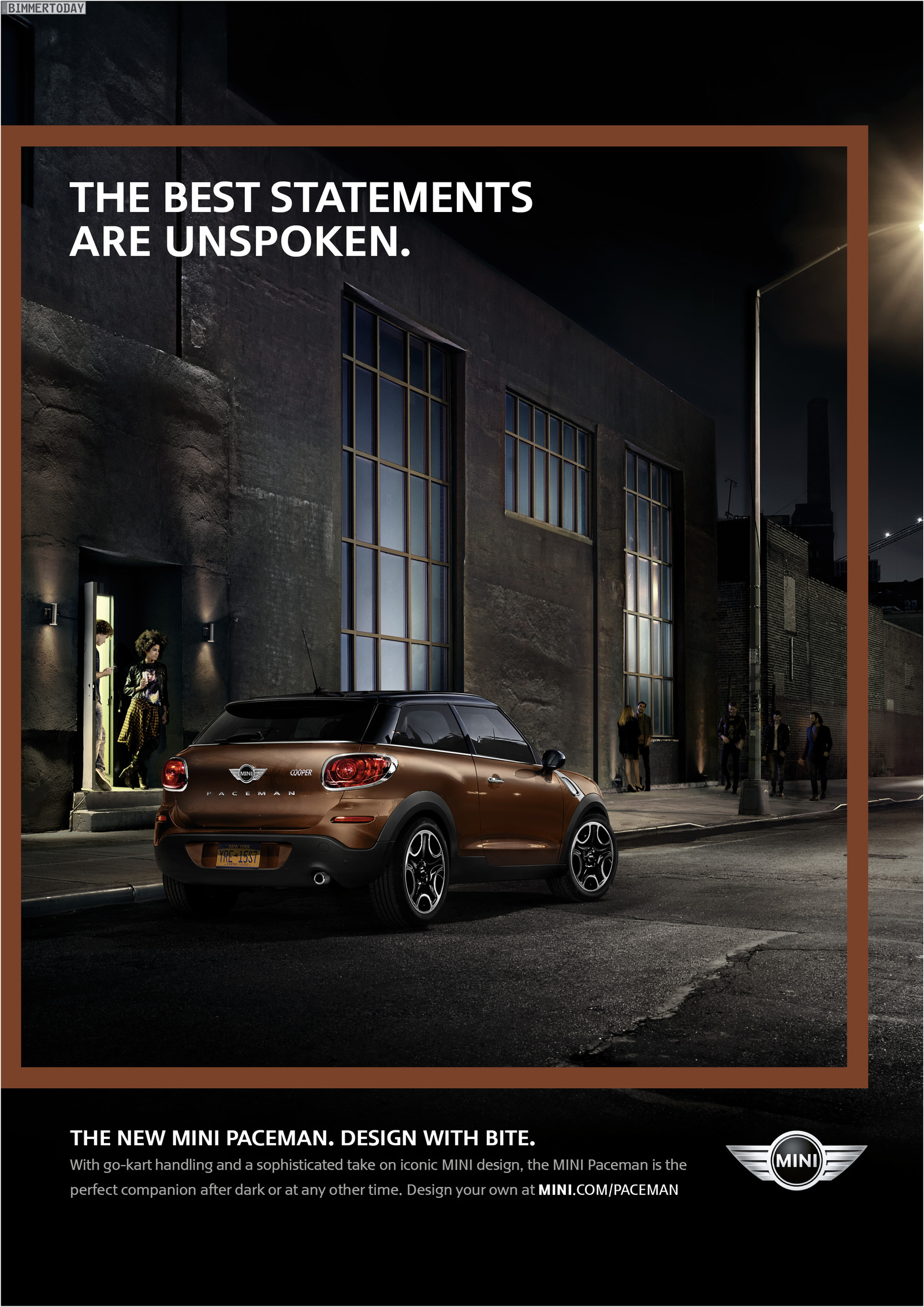 Die Werbe-Kampagne zum MINI Paceman R61 steht unter dem Motto “Design with Bite” und startet mit sechs Print-Motiven sowie drei Filmen, wobei letztere ab Februar auch weltweit im TV zu sehen sein werden. Neben den in New York entstandenen Aufnahmen startet Ende Februar eine Social Media-Kampagne, die auf diversen Kanälen mit dem Slogan “Discover your inner Paceman” für das SUV-Coupé werben soll.
