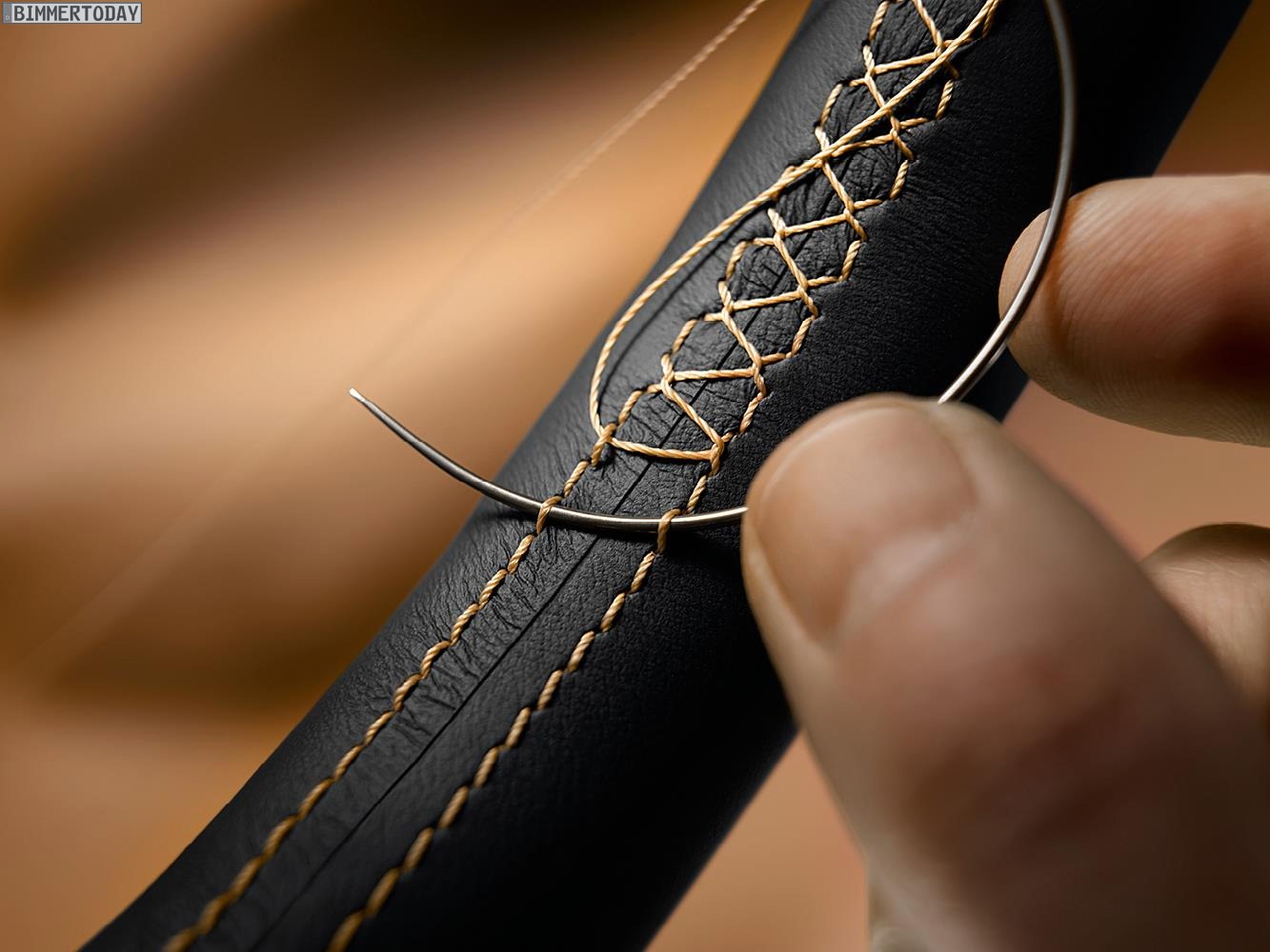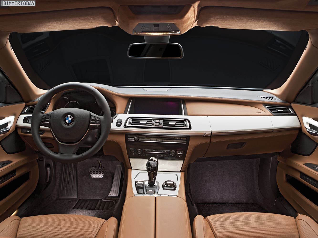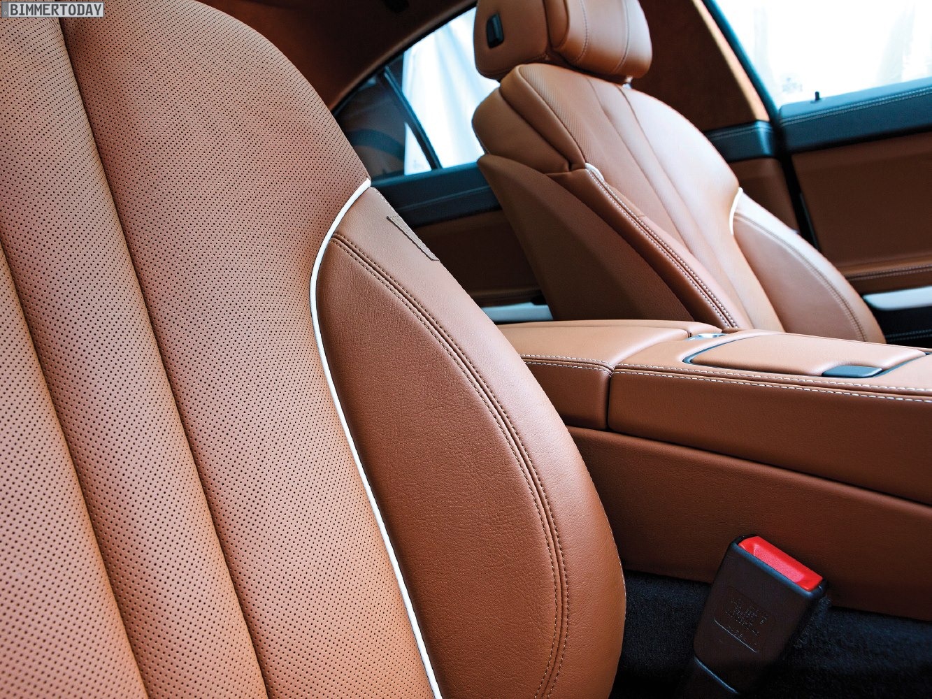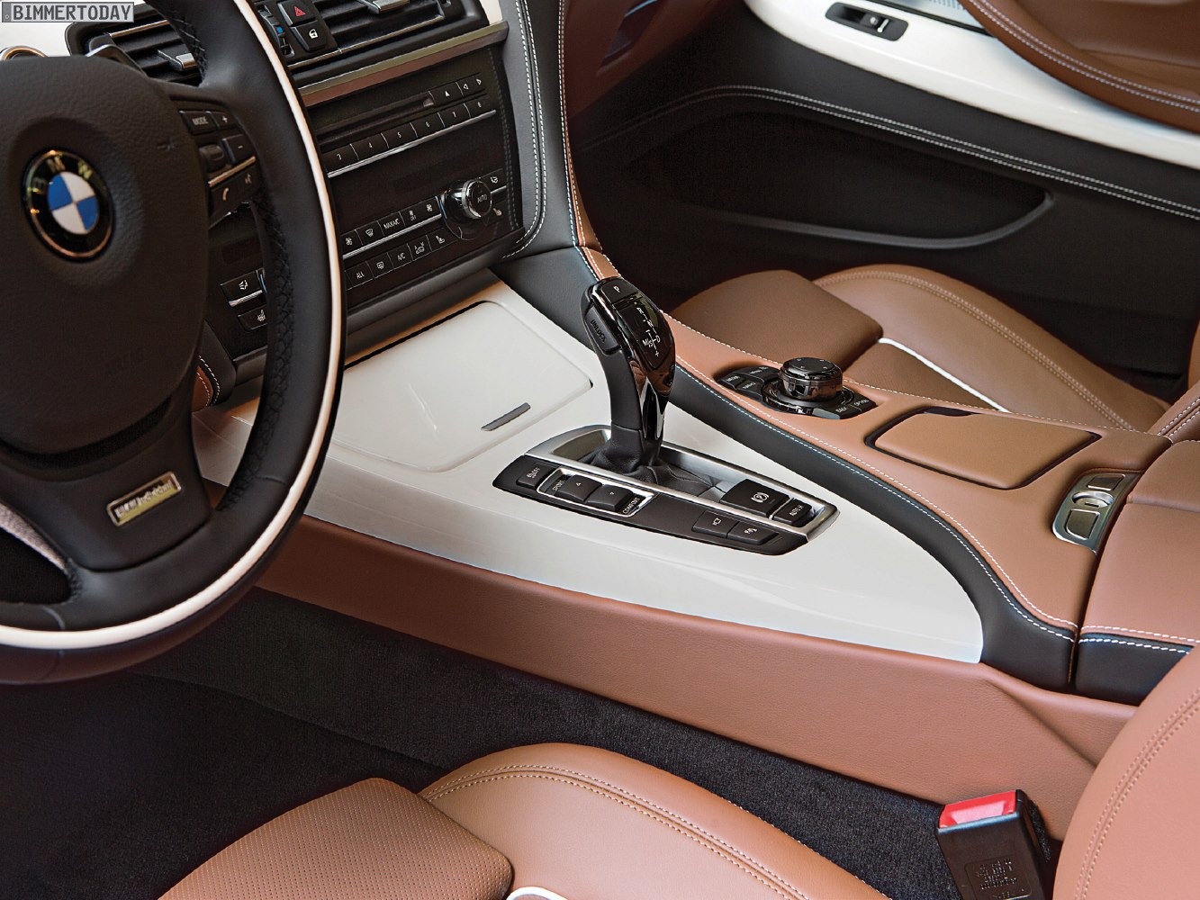 Im Innenraum kommt die BMW Individual Volllederausstattung Merino Feinnarbe in Amarobraun zum Einsatz, sie greift mit weißen Kedern die Farbe der Interieurleisten Edelholzausführung Esche Maser weiß und der Außenlackierung in Frozen White auf.
