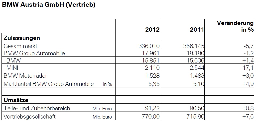 Trotz eines um 5,7 Prozent schrumpfenden Marktes konnte die BMW Group 2012 in Österreich wieder ein sehr erfolgreiches Jahr hinlegen: Mit 15.851 BMW wurde der Rekord-Wert aus dem Vorjahr um 1,4 Prozent überboten, auch BMW Motorrad verkaufte mit 1.528 Fahrzeugen mehr Einheiten als jemals zuvor. Bei MINI ging der Absatz um 17,1 Prozent auf 2.110 Einheiten zurück, damit handelt es sich aber noch immer um das zweitbeste Jahr aller Zeiten für MINI in Österreich.