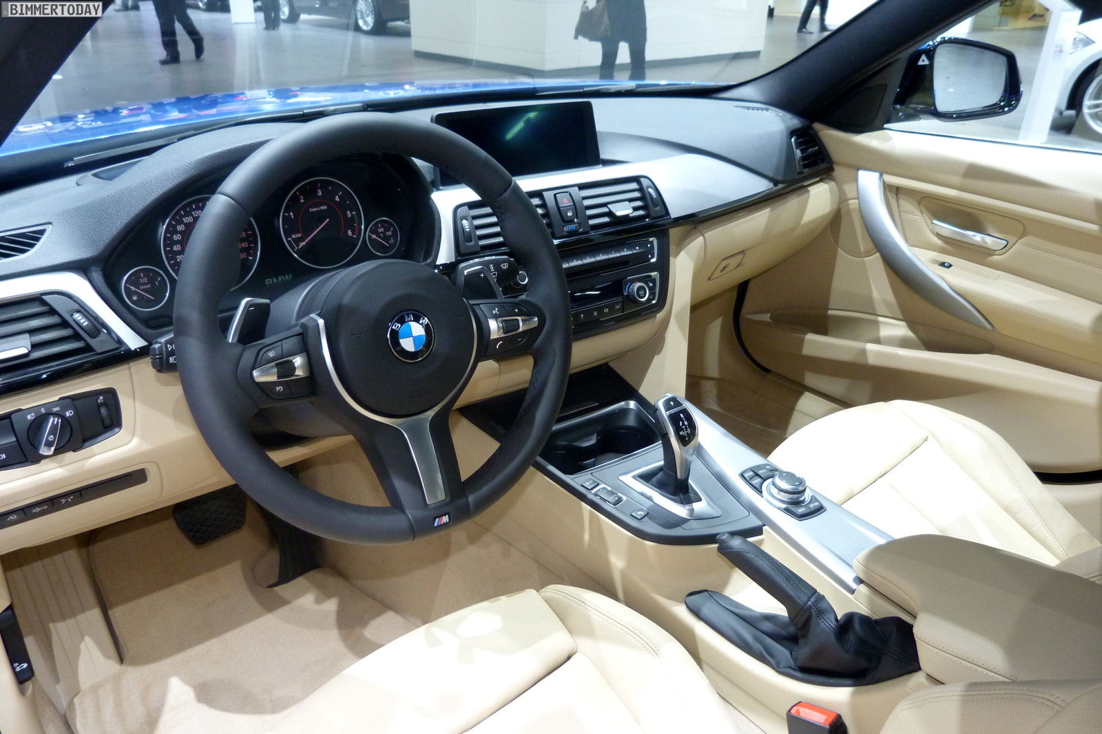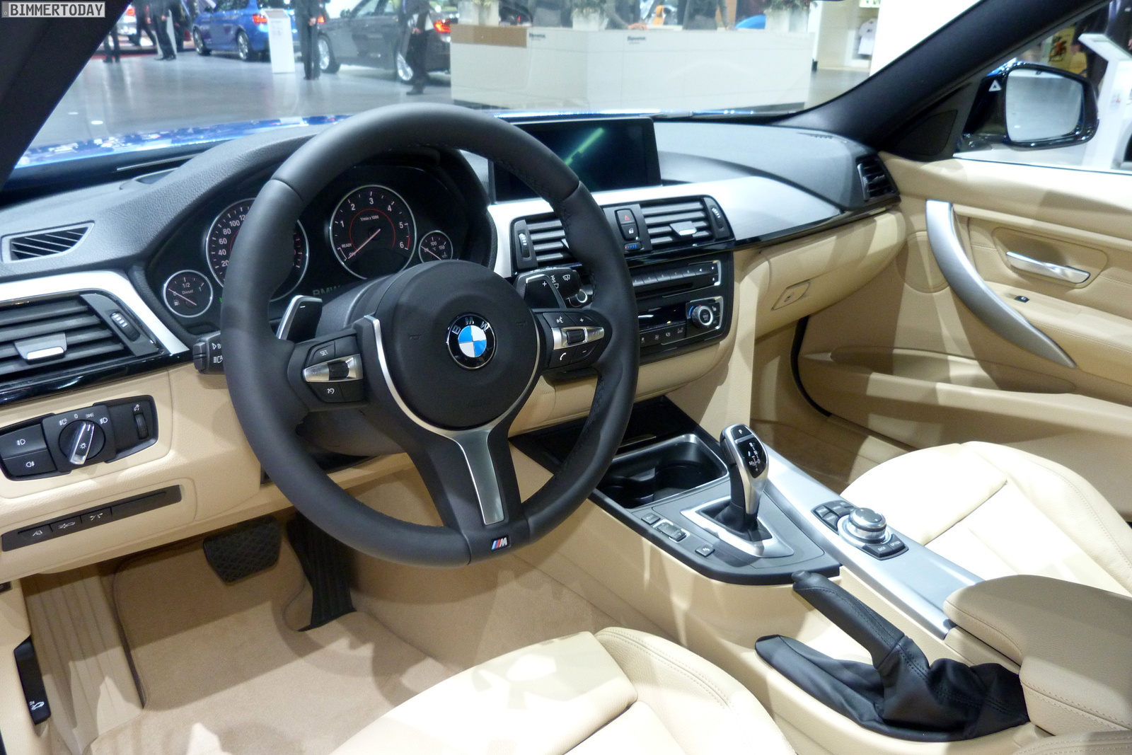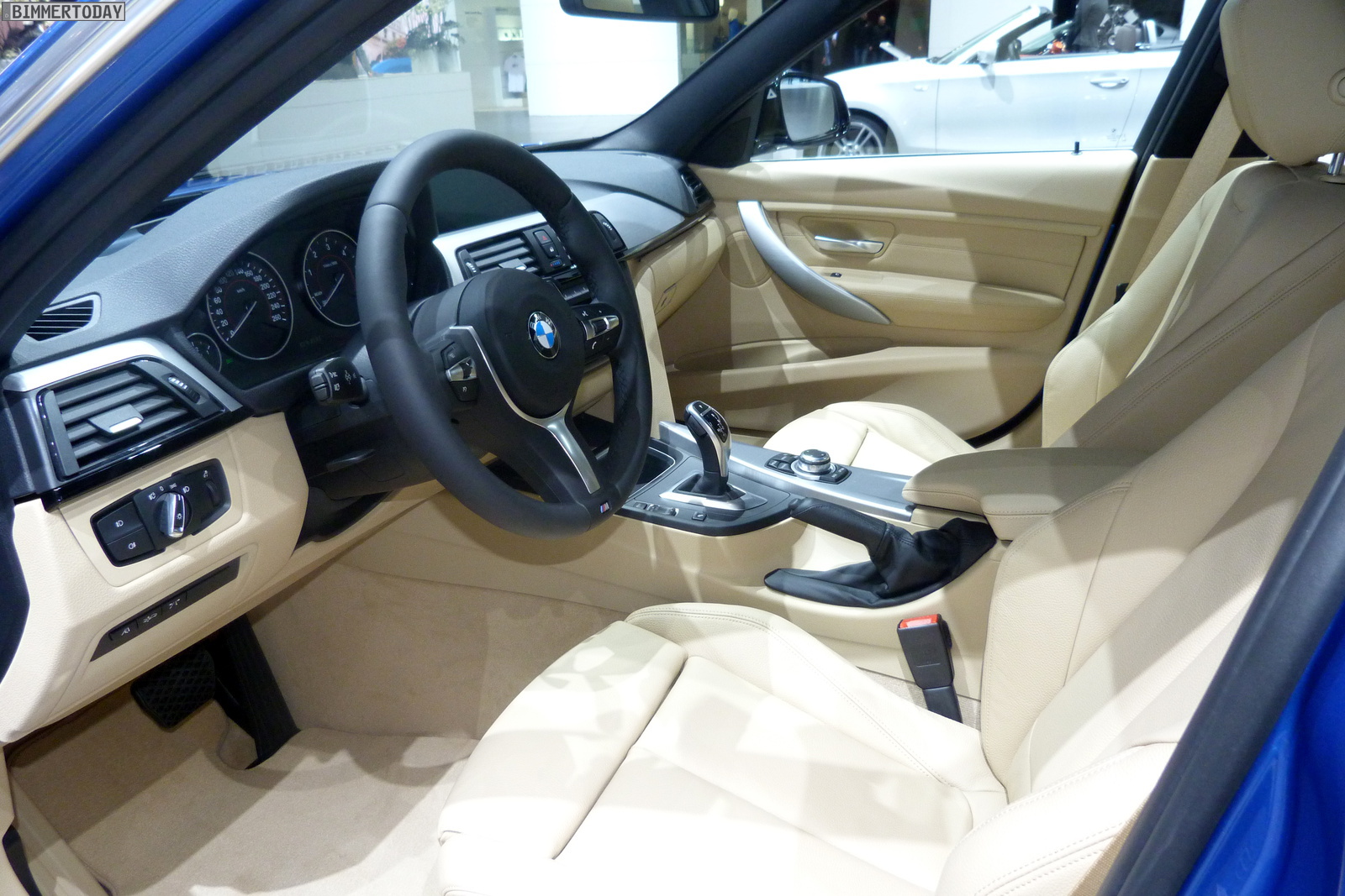 Vielleicht nicht hundertprozentig zum sportlichen Auftritt passend ist der Innenraum mit eher hellen Farben, aber diese Wahl liegt wie immer im Auge des Betrachters. Das filigran gezeichnete BMW M Sportlenkrad zeigt sich im konkreten Fall mit Schaltwippen, denn das ausgestellte Fahrzeug verfügt über die optionale Achtgang-Sportautomatik.
