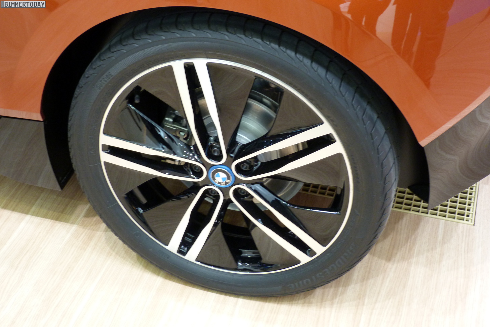 Die farbliche Gestaltung des Concept Cars lebt vom Kontrast der Farbe Solar Orange mit schwarzen Flächen, die ebenfalls zweifarbig gestalteten Leichtmetallräder mit 20 Zoll Durchmesser geben dem Fahrzeug zusätzliche Dynamik. Auf den Felgen kommen 155 und 175 Millimeter schmale Reifen zum Einsatz, was den Luftwiderstand reduziert und das Streben nach maximaler Effizienz unterstreicht.