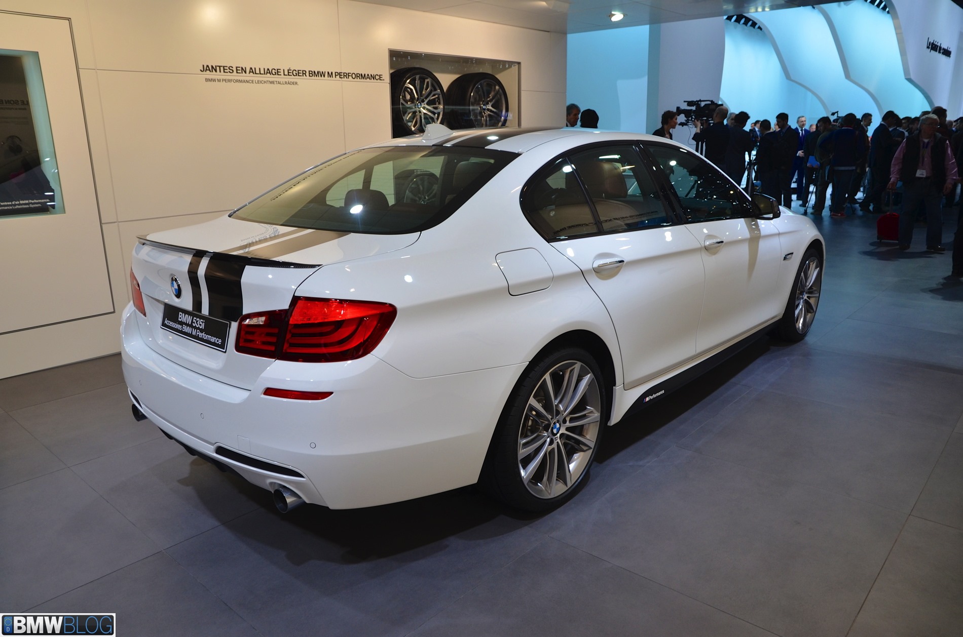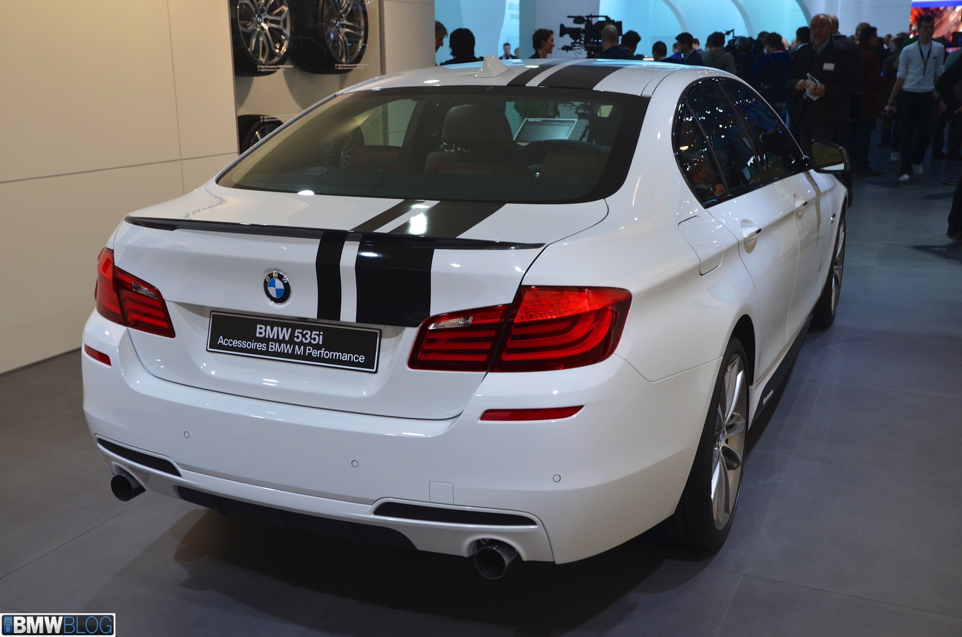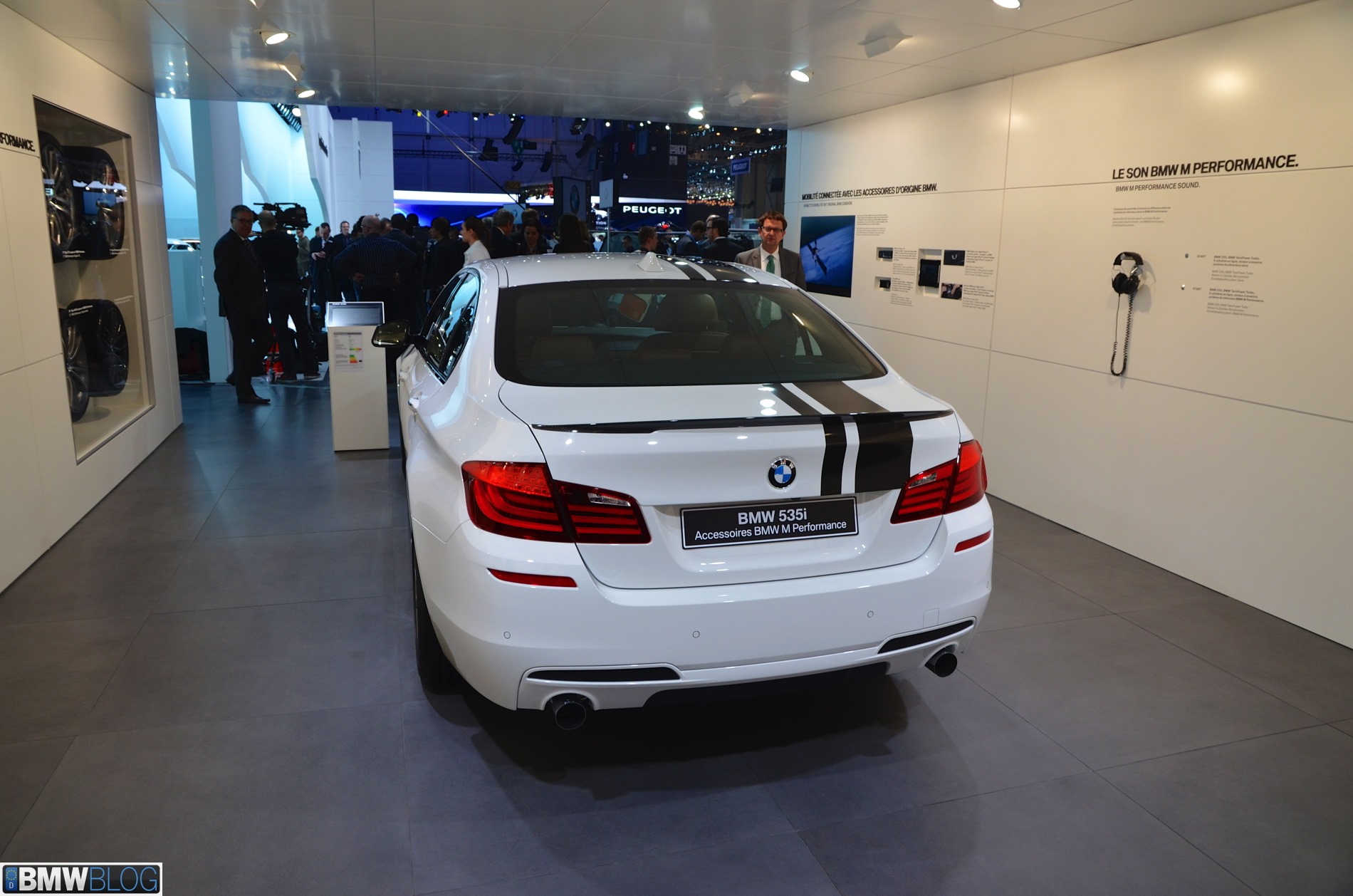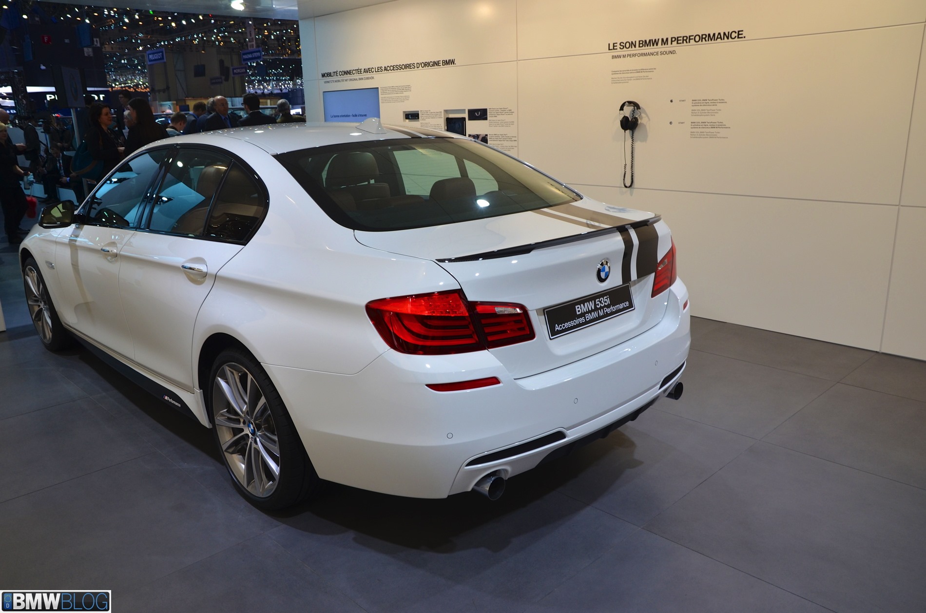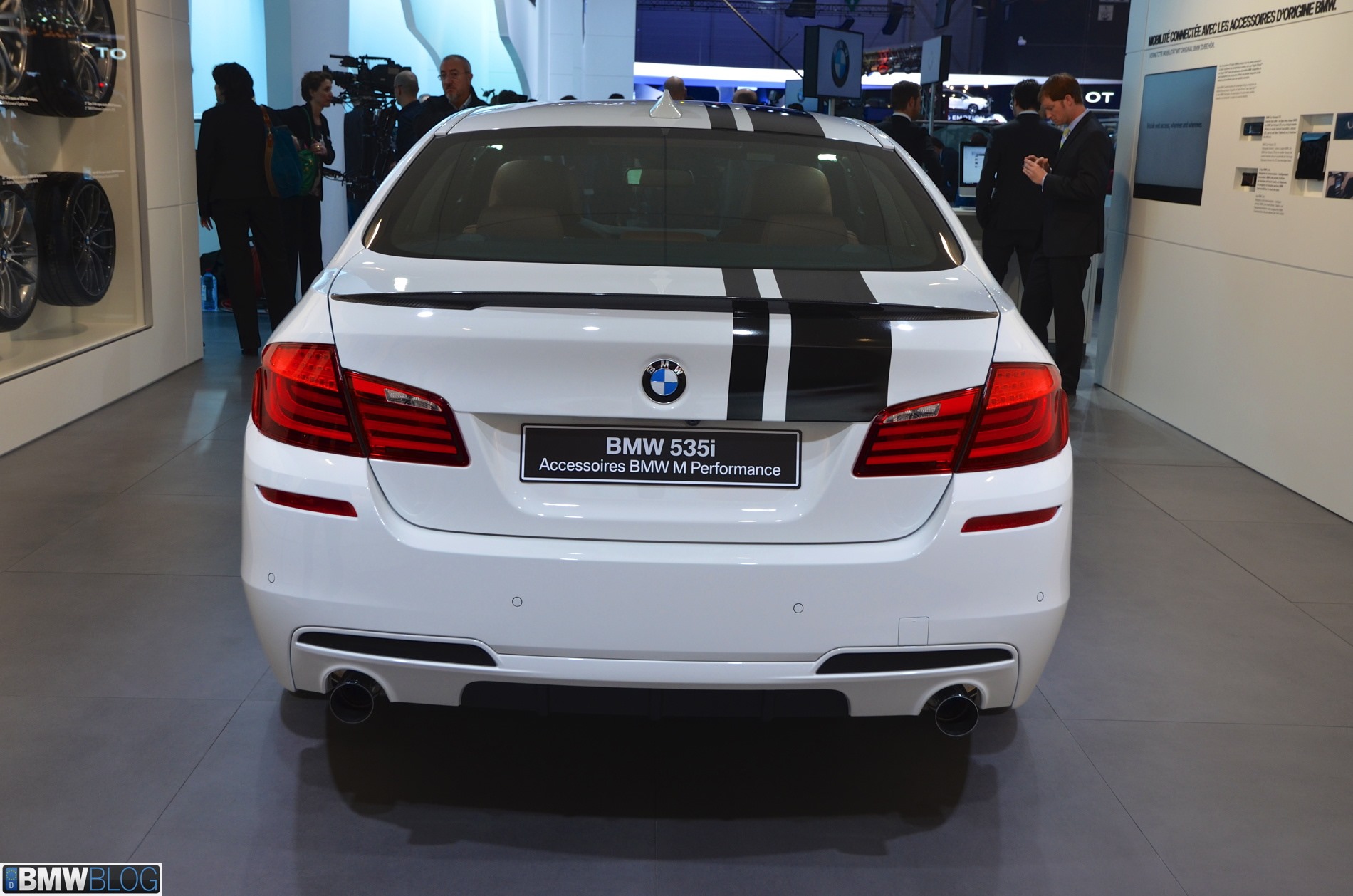 Auf dem Genfer Salon 2013 zeigt ein BMW 5er F10 mit M Performance-Zubehör, was sich in diesem Rahmen aus einer braven Limousine machen lässt. Wie schon auf der Essen Motor Show handelt es sich auch in Genf um einen weiß lackierten 535i, allerdings drängen die schwarzen Dekor-Streifen das Genfer Exemplar noch stärker in die Tuning-Ecke.