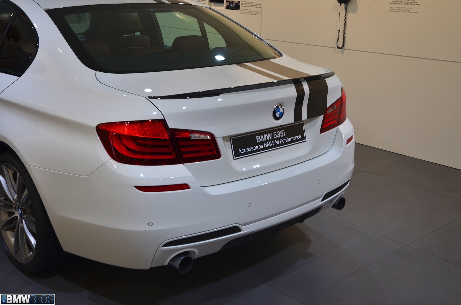 Neben dem auffälligen Dekor zeigt der BMW M Performance 5er F10 auch die Außenspiegelkappen in Carbon (556 Euro), den Carbon-Frontsplitter (1.174 Euro) für Fahrzeuge mit M Sportpaket, die schwarzen Nieren (104 Euro), den Heckdiffusor für 459 Euro, die Carbon-Spoilerlippe am Heck (488 Euro), 20 Zoll große Felgen und das M Performance Schalldämpfersystem für den 535i.