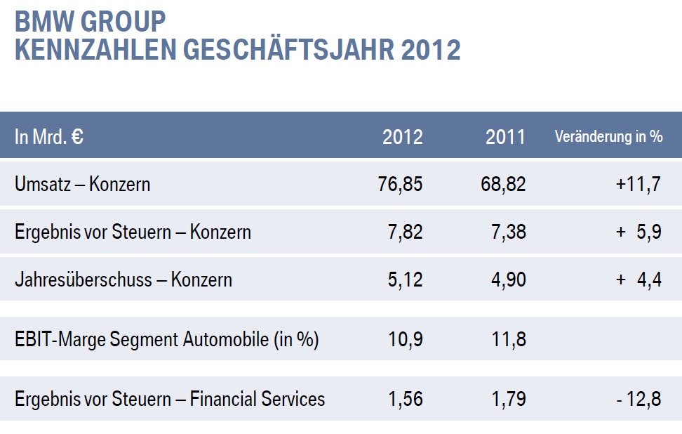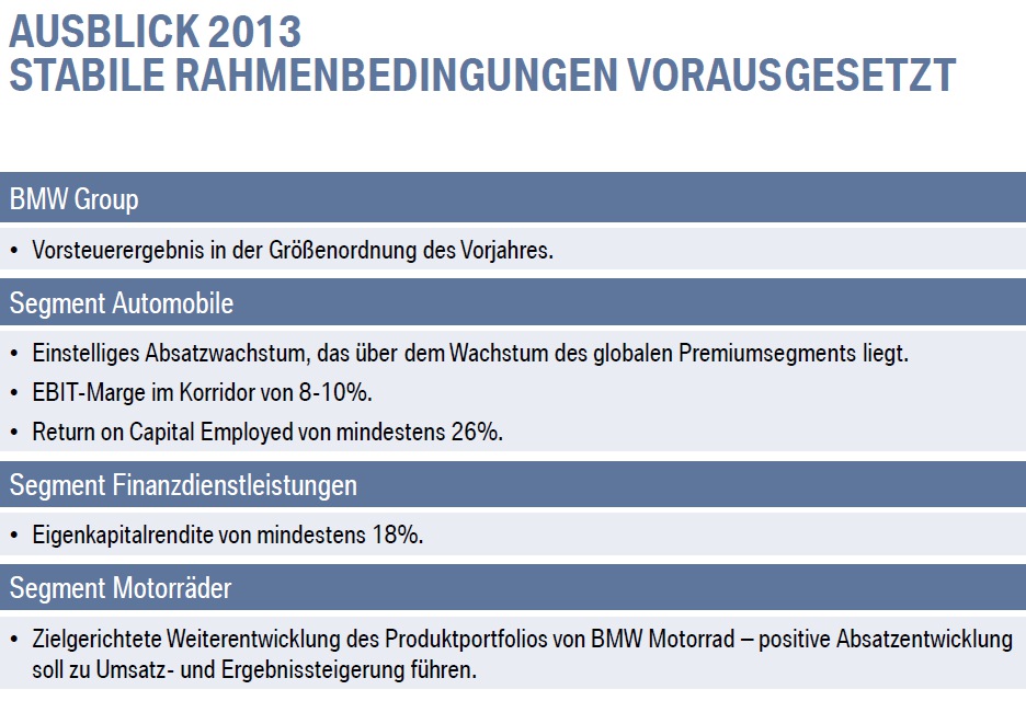Konkret soll der Absatz 2013 im einstelligen Prozentbereich zulegen und über dem globalen Wachstum des Premium-Segments liegen. Das Vorsteuerergebnis soll 2013 trotz hoher Aufwendungen für neue Technologien und Modelle auf dem Niveau des Jahres 2012 bleiben, die EBIT-Marge im Korridor von 8 bis 10 Prozent liegen.